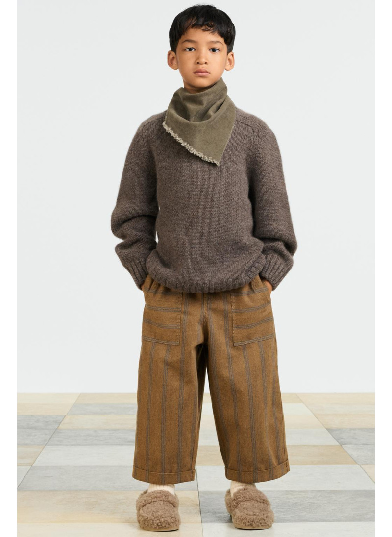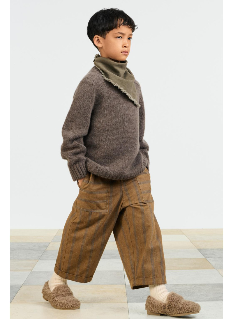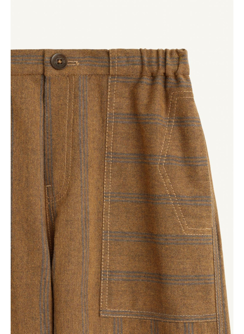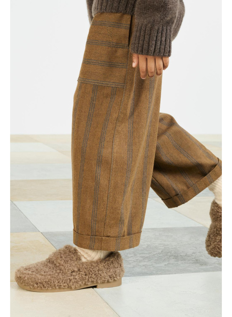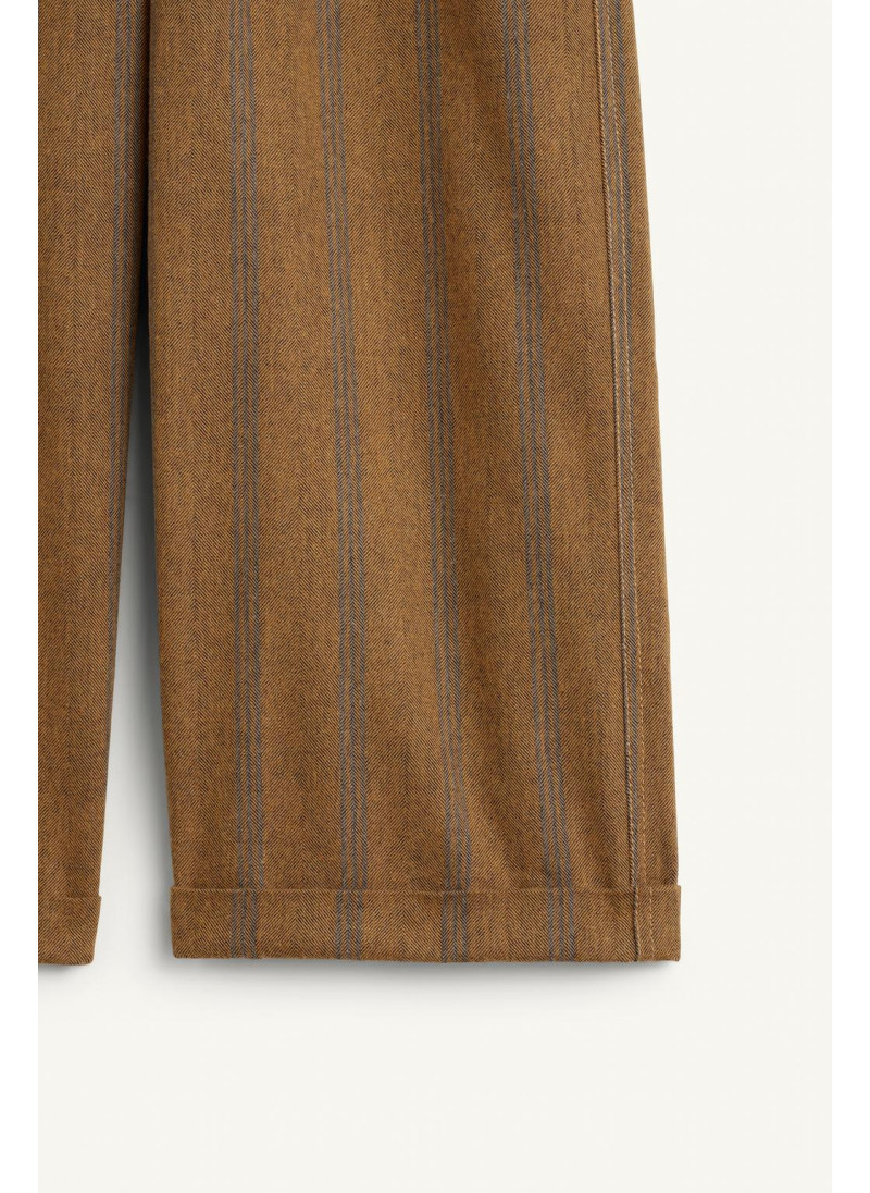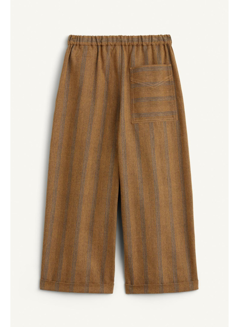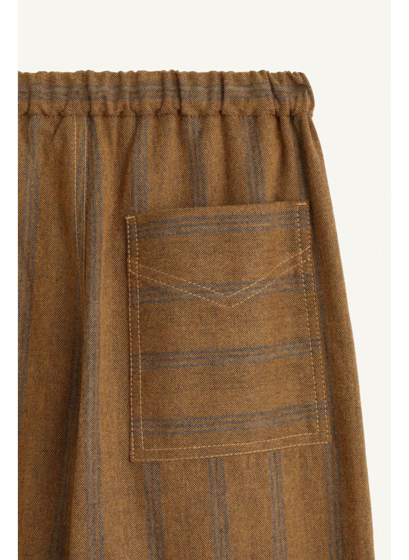 Брюки с эластичным поясом и застежкой на пуговицу спереди. Имеют накладные карманы спереди и сзади. Принт полоска.