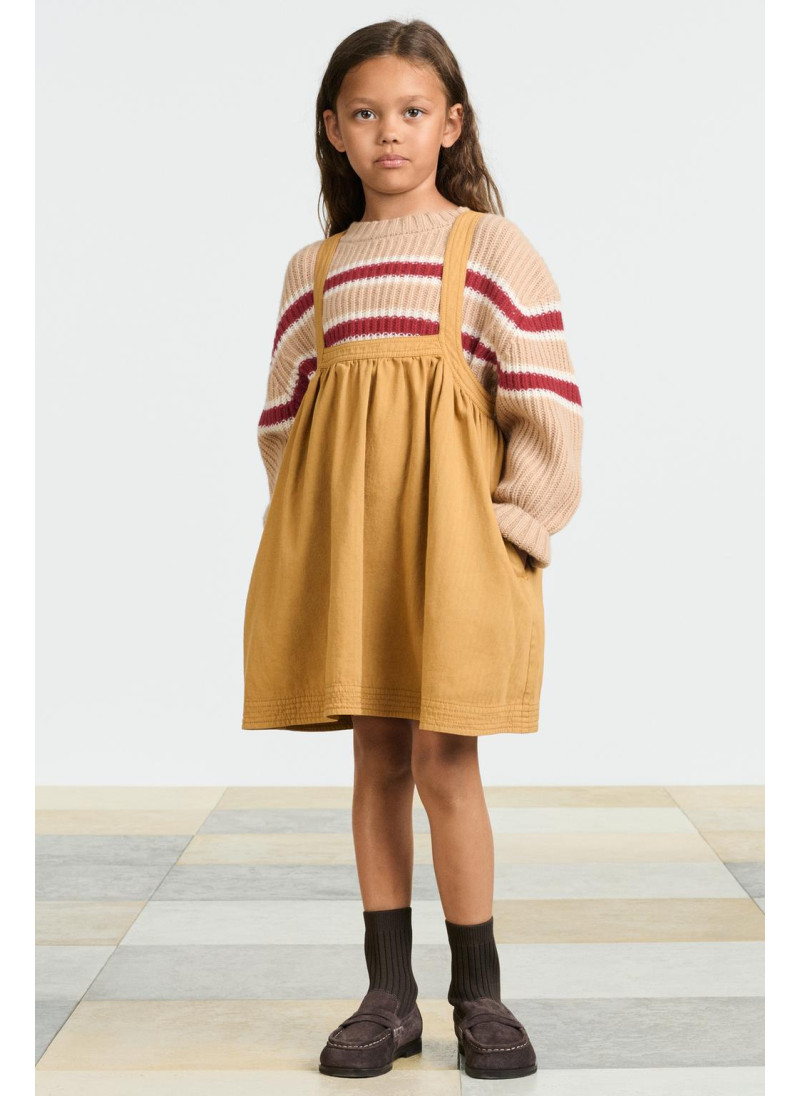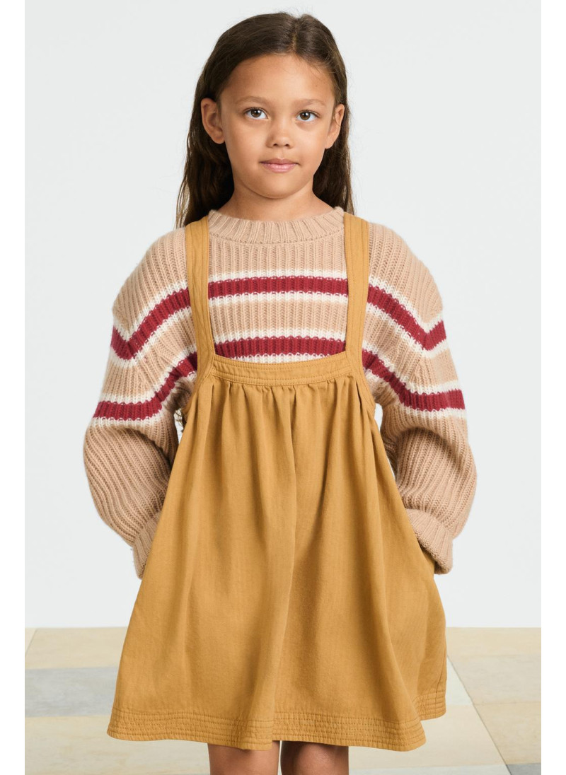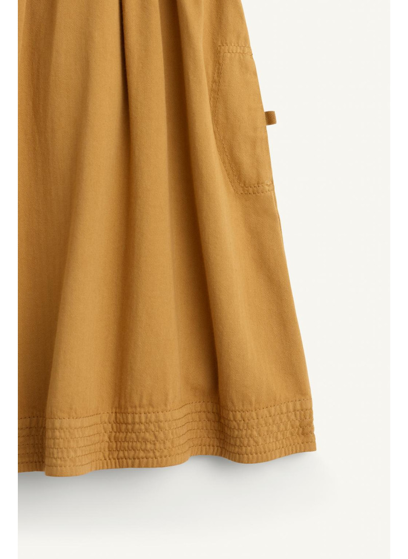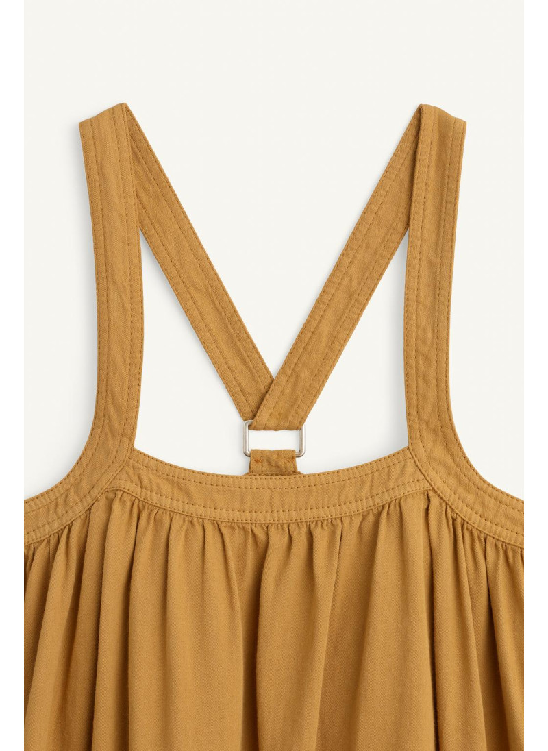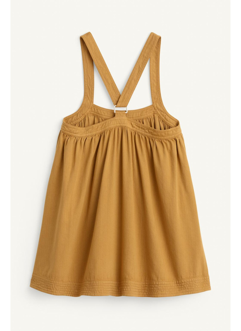 Платье-фартук с округлым вырезом горловины и перекрестными лямками на спине. Детали-стрелки. Боковые карманы скрыты в шве. Ткань - 100% хлопок.
