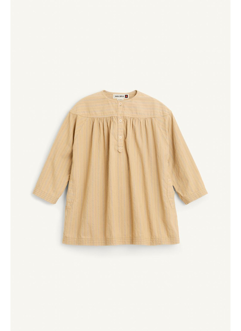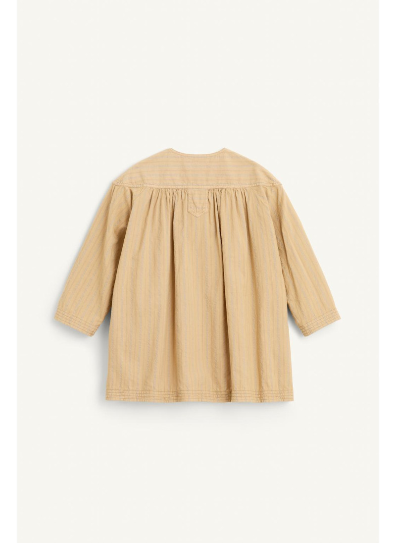 Полосатое платье с круглым вырезом и длинными рукавами. Застежка спереди на пуговицы по полочке. Детали складок. Ткань с добавлением 13% льна.