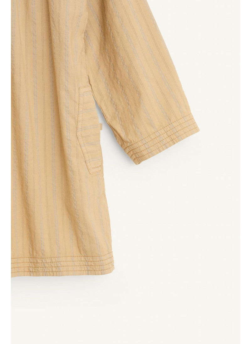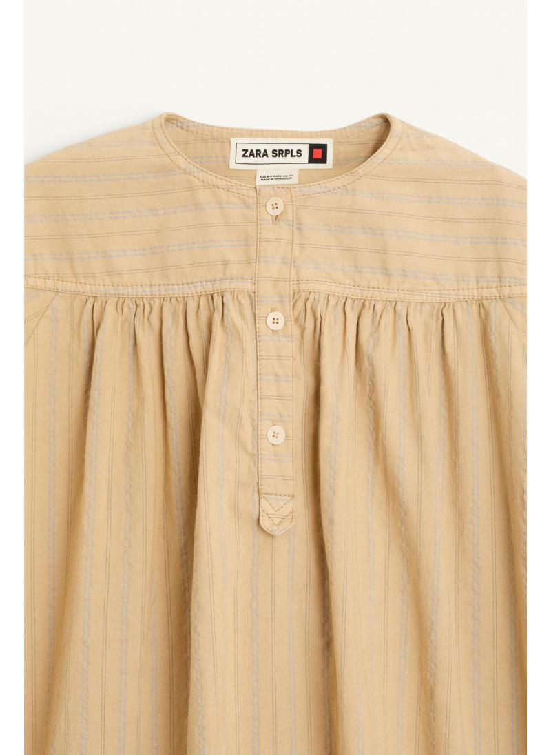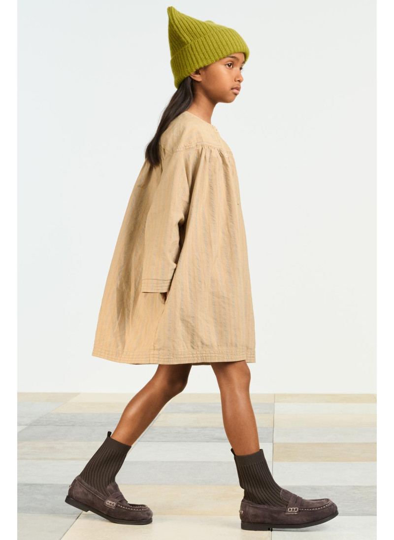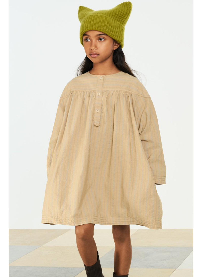 Полосатое платье с круглым вырезом и длинными рукавами. Застежка спереди на пуговицы по полочке. Детали складок. Ткань с добавлением 13% льна...
