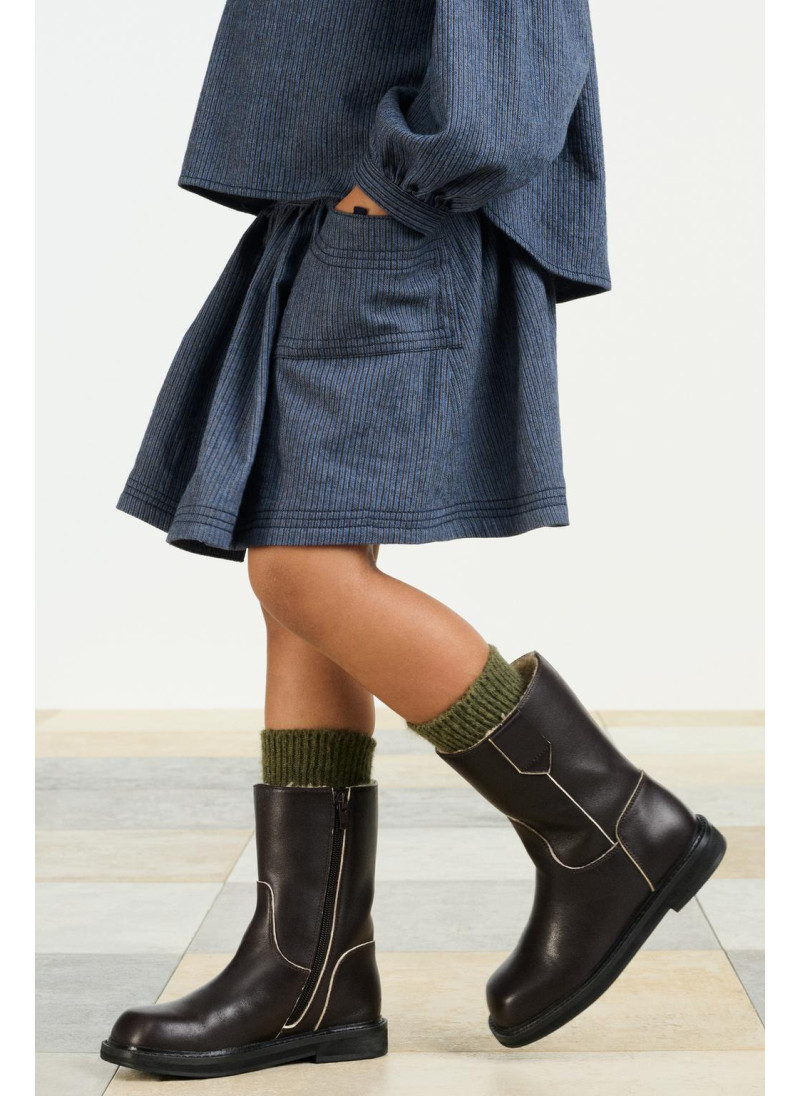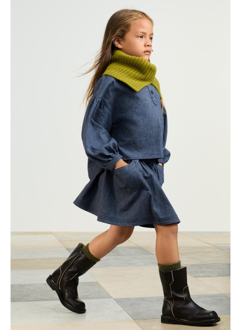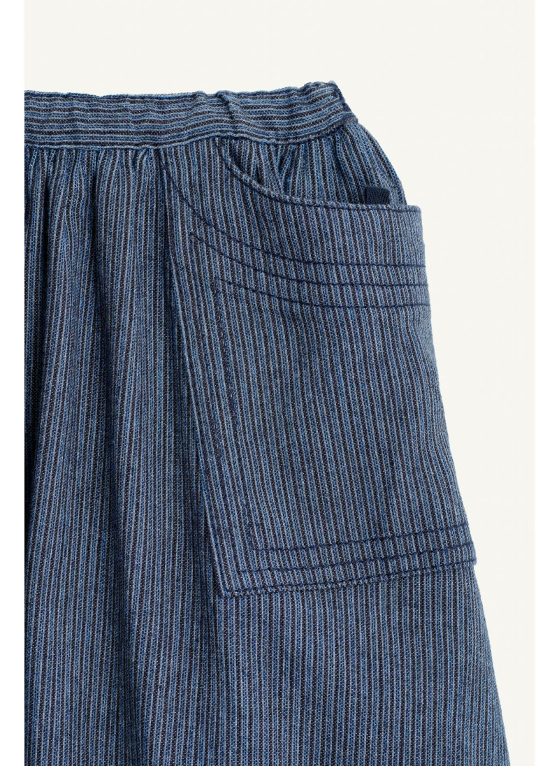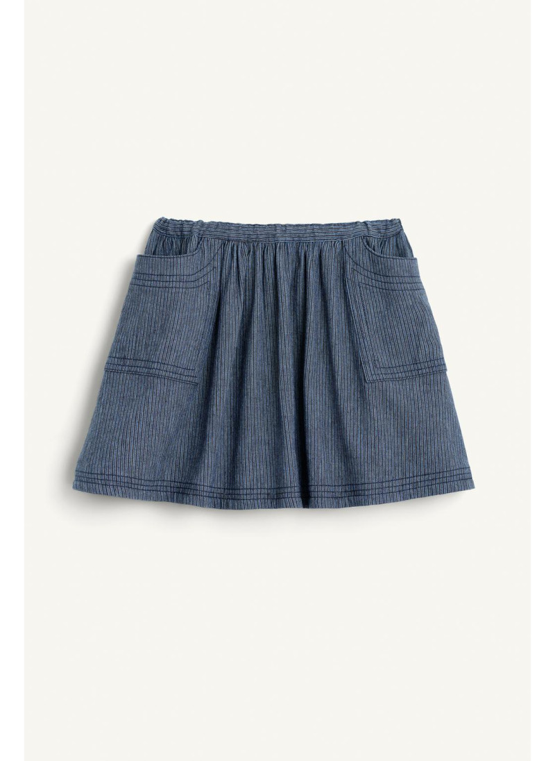 Полосатая юбка с эластичным поясом, задними накладными карманами и деталями в тонких строчках.