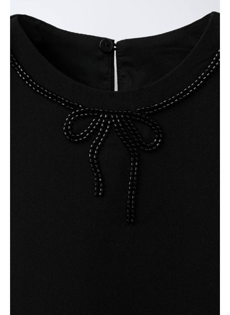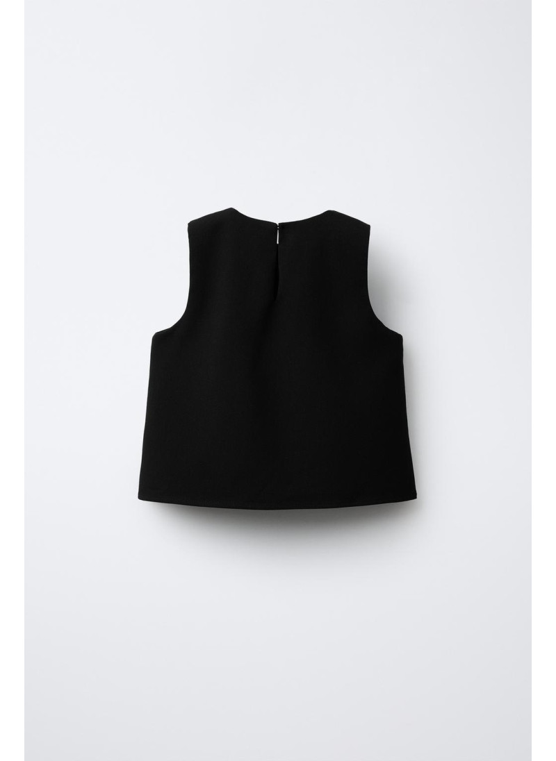 Топ с круглым вырезом и безрукавным дизайном. Спинка с трапециевидным вырезом и пуговицей сзади. Аппликация банта с бисером на груди. Тонкая внутренняя подкладка.