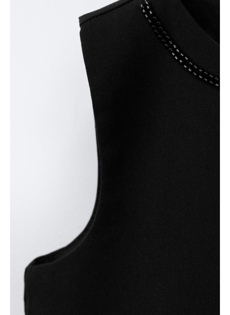 Топ с круглым вырезом и безрукавным дизайном. Спинка с трапециевидным вырезом и пуговицей сзади. Аппликация банта с бисером на груди. Тонкая внутренняя подкладка...