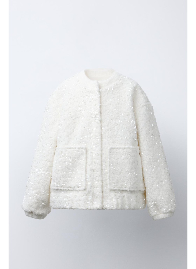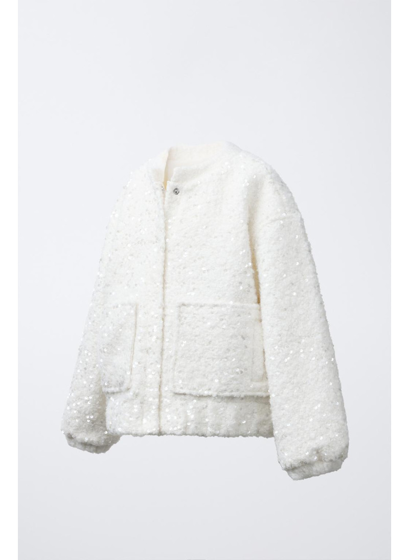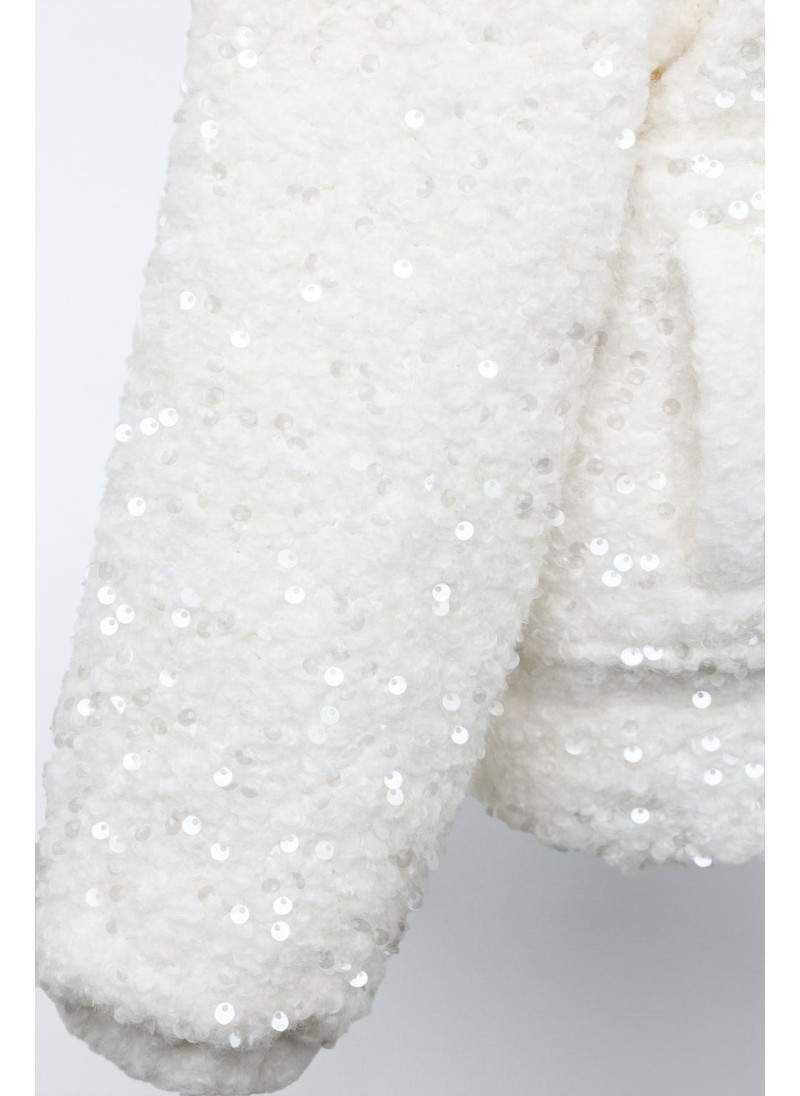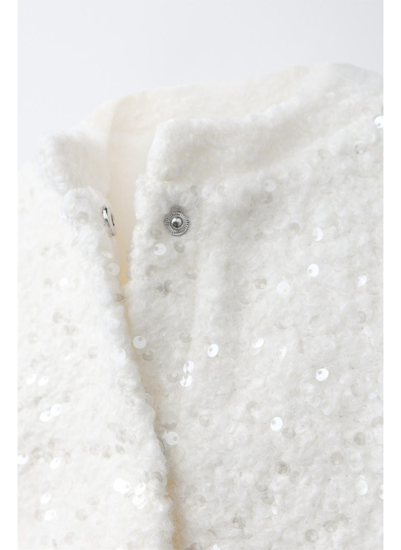 Бомбер с круглым вырезом и длинными рукавами на резинке. Эластичный низ. Застежка на кнопки скрыта планкой. Накладные передние карманы. Аппликация из пайеток.
