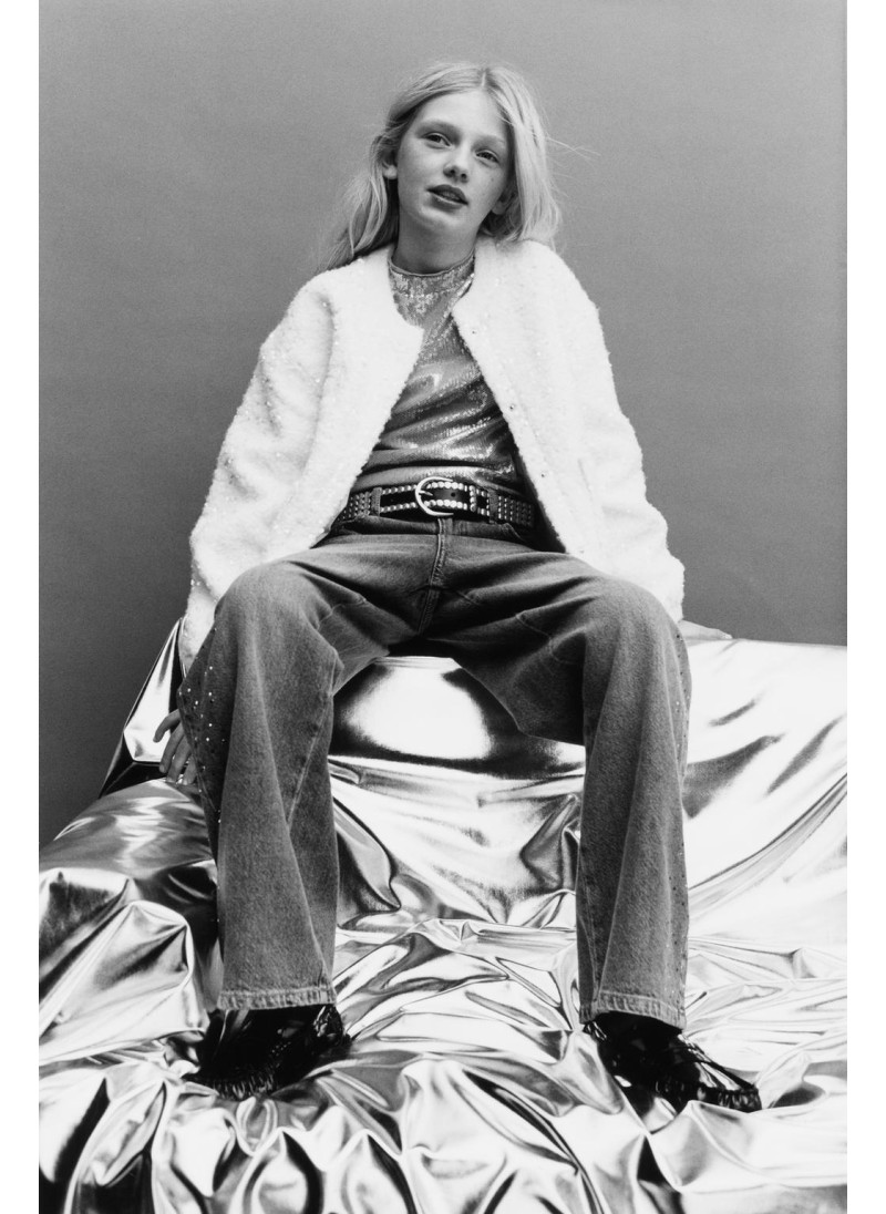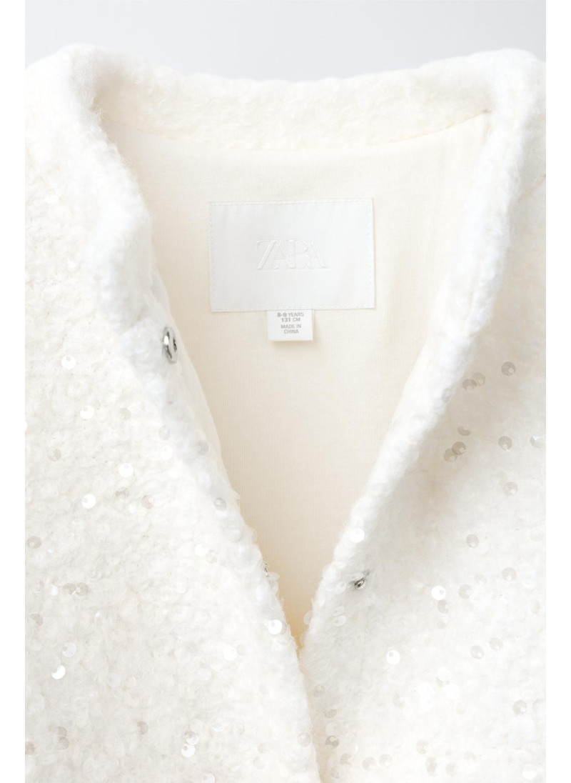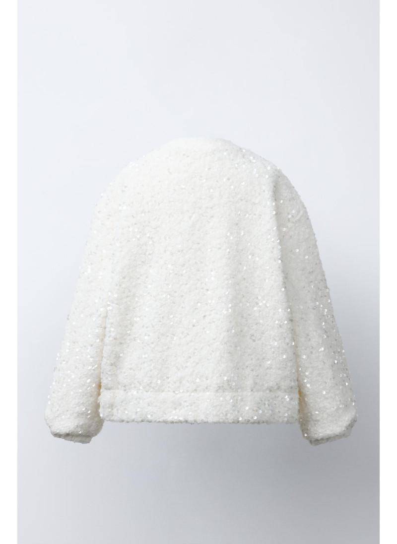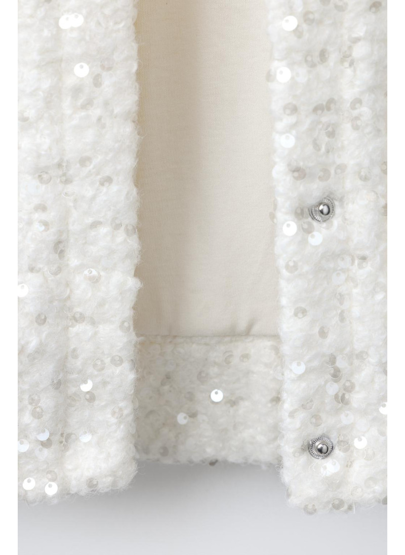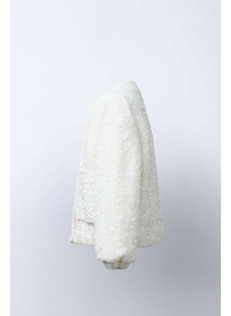 Бомбер с круглым вырезом и длинными рукавами на резинке. Эластичный низ. Застежка на кнопки скрыта планкой. Накладные передние карманы. Аппликация из пайеток.