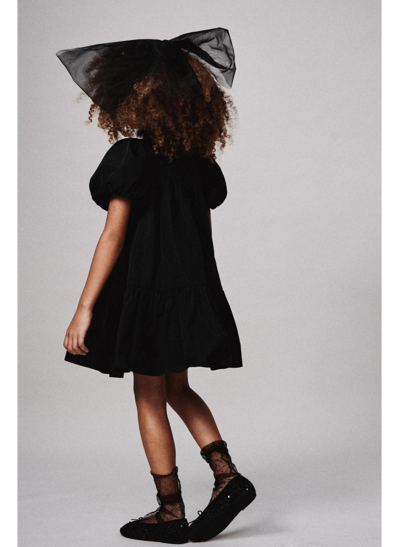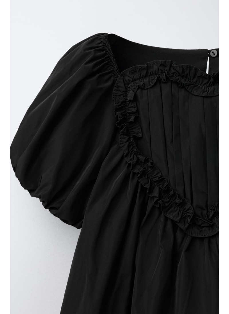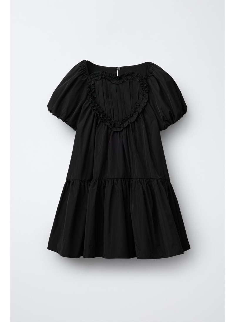 Платье с круглым вырезом и рукавами-баллон с эластичными манжетами. Застежка на потайные пуговицы на спине. Аппликация сердца спереди.