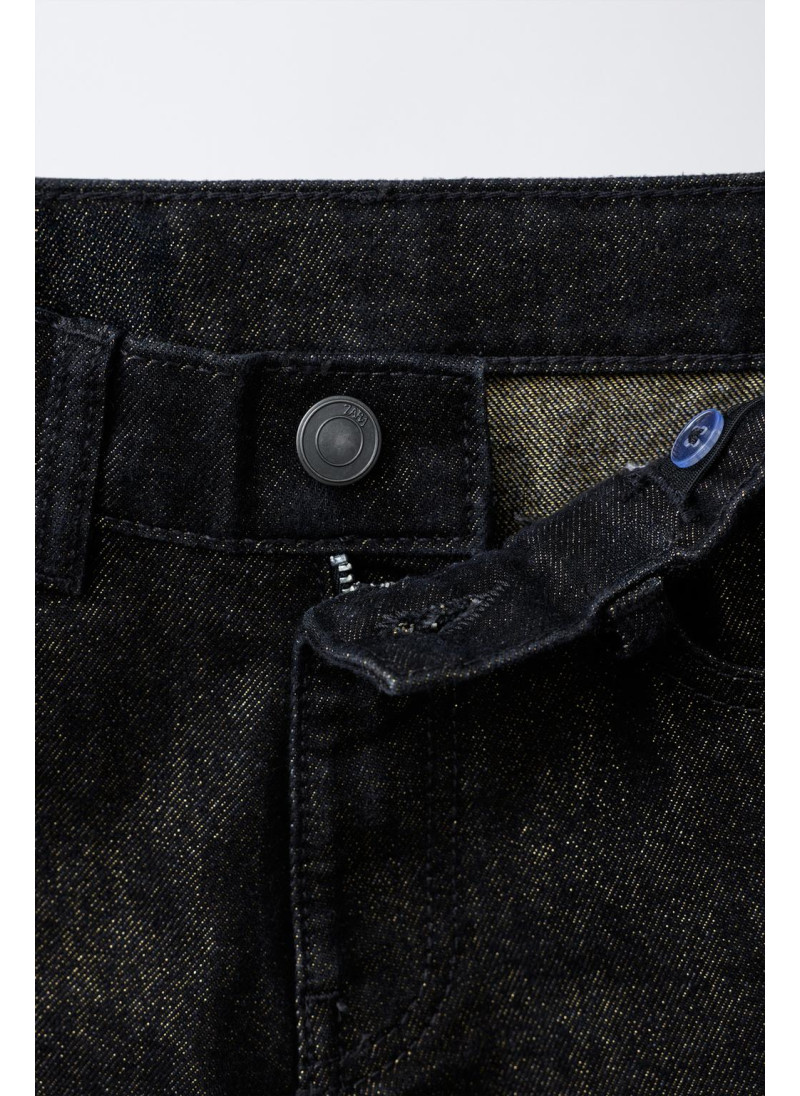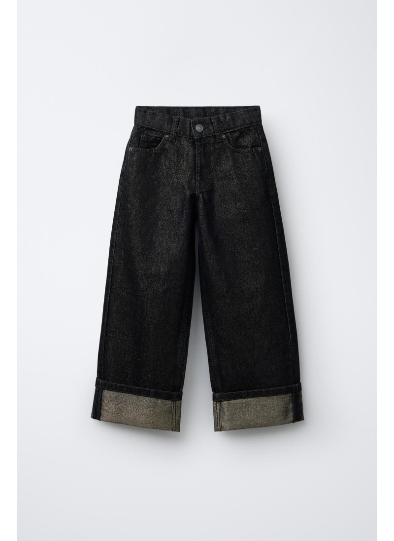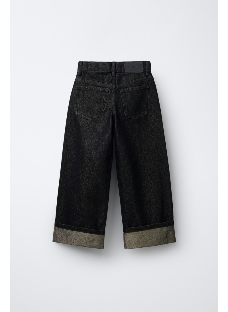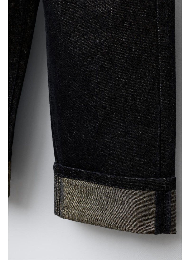 Джинсы свободного кроя с регулируемым изнутри поясом. Застегиваются на пуговицу. Передние карманы и задние накладные карманы. С блёстками. Отделка края в виде отворотов...