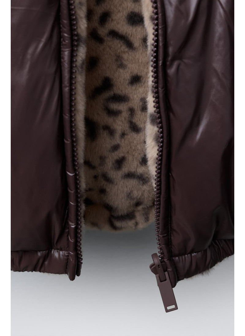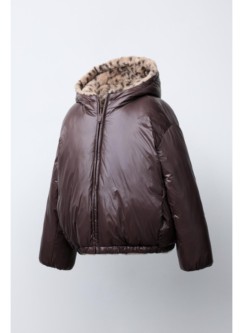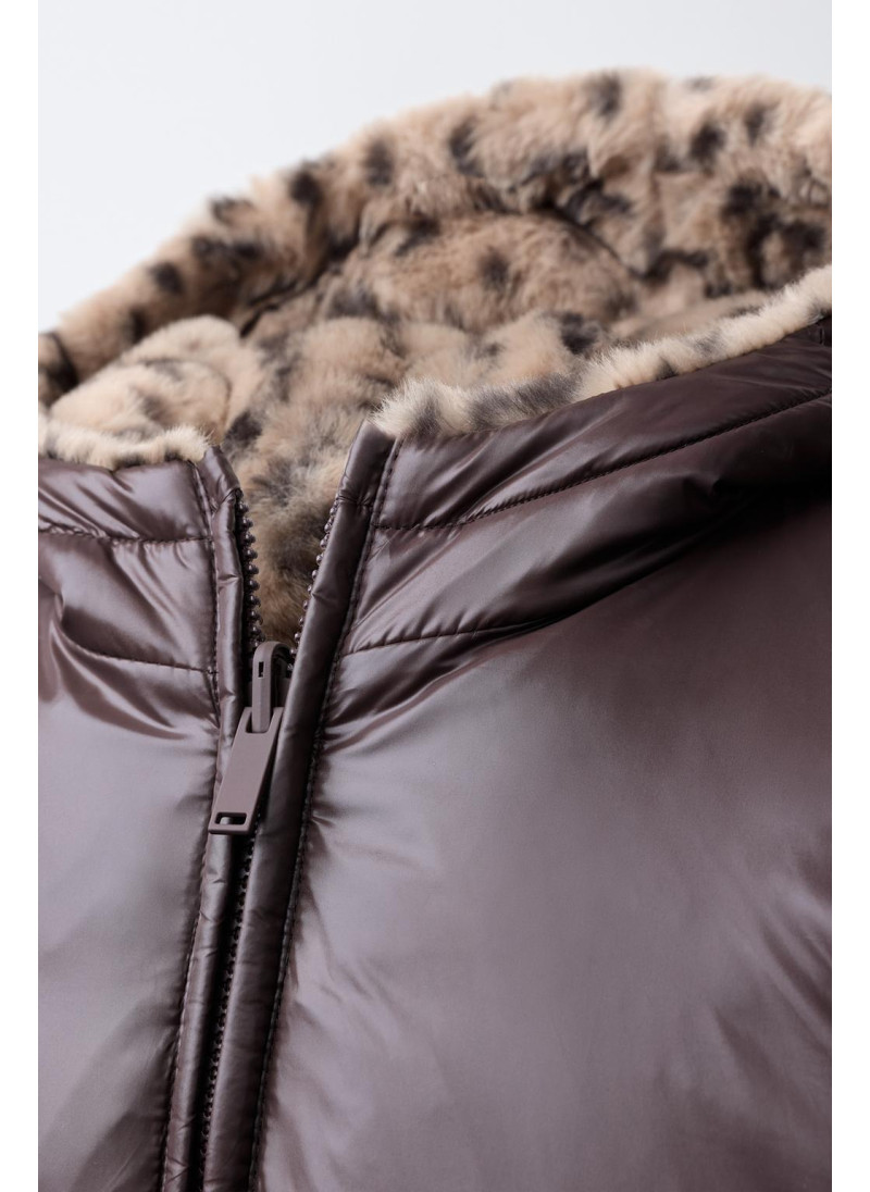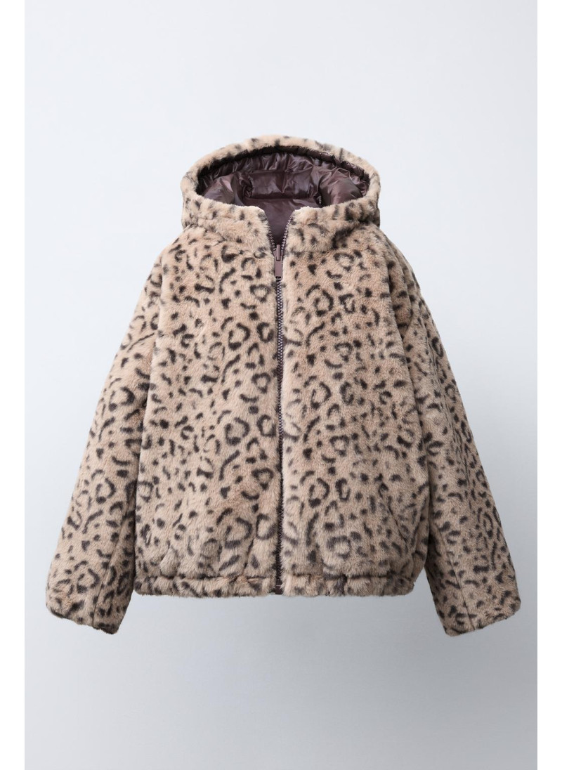 Jacket featuring a hood and long sleeves with elasticated cuffs. Zip-up front. Front pockets. Reversible option with faux fur and an animal print. Front pockets.