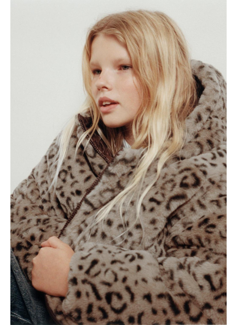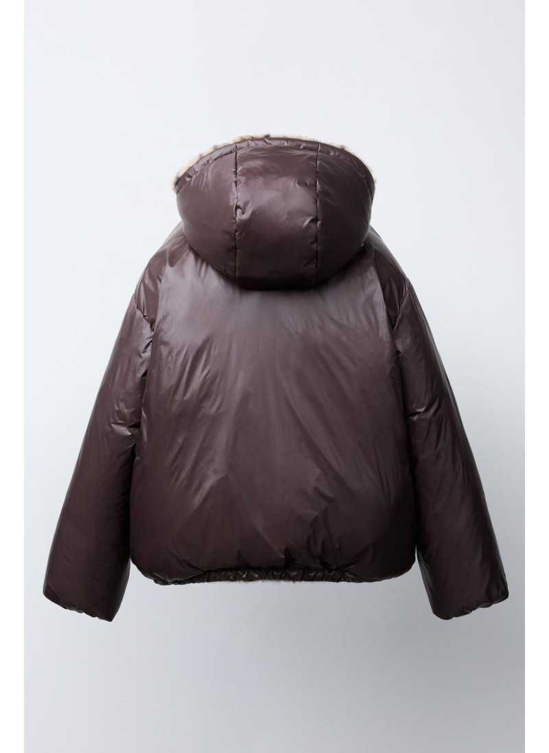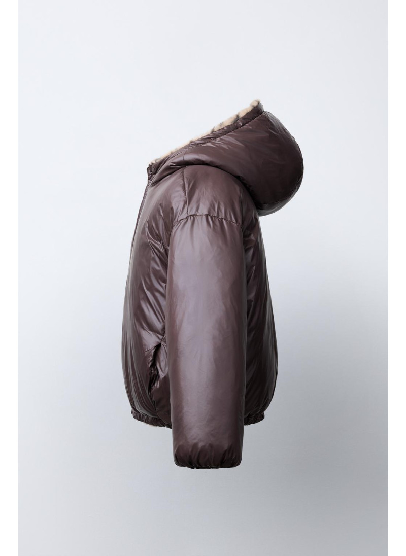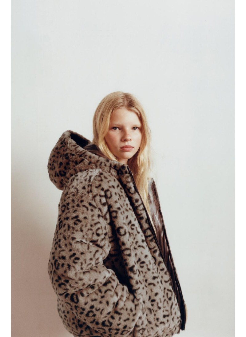 Jacket featuring a hood and long sleeves with elasticated cuffs. Zip-up front. Front pockets. Reversible option with faux fur and an animal print. Front pockets.