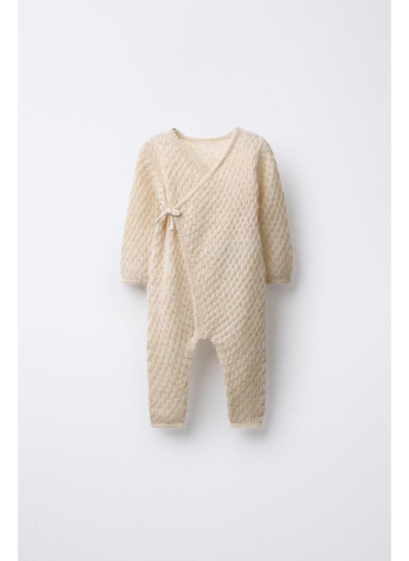 Трикотажное боди с V-образным вырезом и длинными рукавами. Застежка на запах со скрытой пуговицей в форме капли и бантом спереди. Изготовлено из ткани с 15% содержанием шерсти.