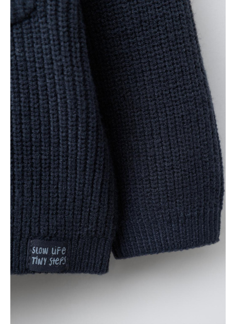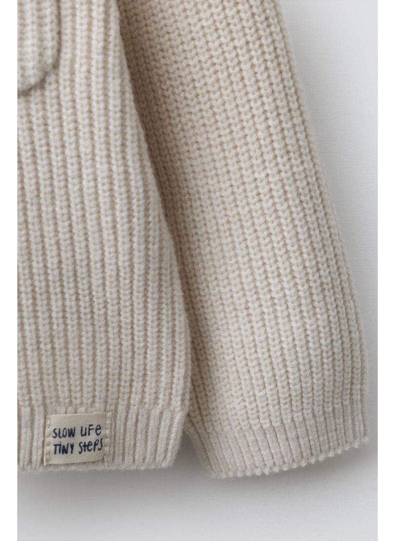Вязаный свитер с круглым вырезом и длинными рукавами. Накладной карман на груди и аппликация-этикетка снизу. Застежка на пуговицы сзади...