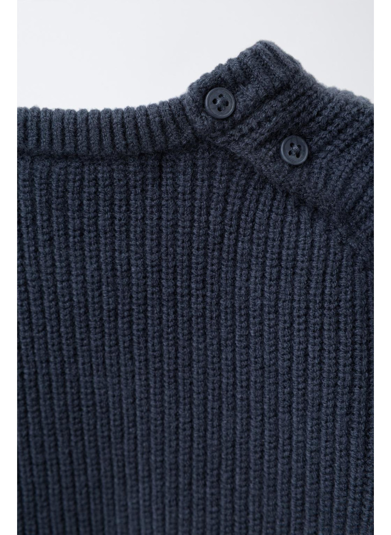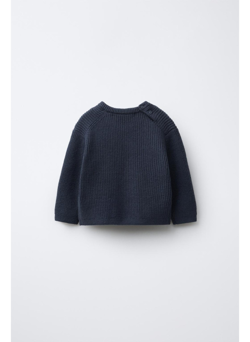Вязаный свитер с круглым вырезом и длинными рукавами. Накладной карман на груди и аппликация-этикетка снизу. Застежка на пуговицы сзади.