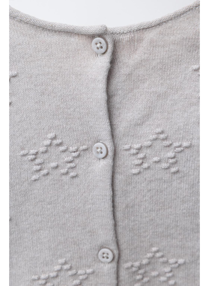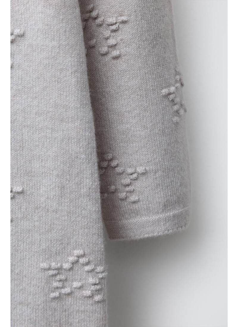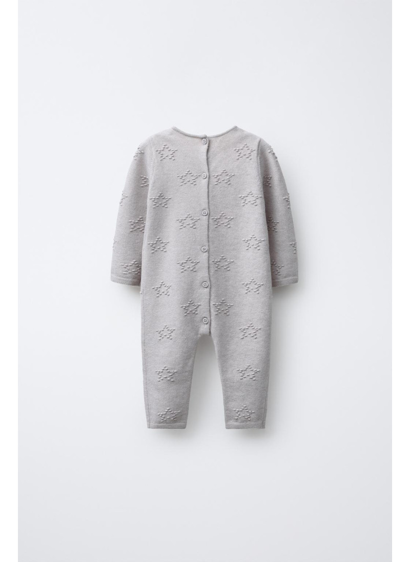 Длинный вязаный комбинезон с круглым вырезом и длинными рукавами. Застежка на пуговицы сзади. Вышивка звезд.