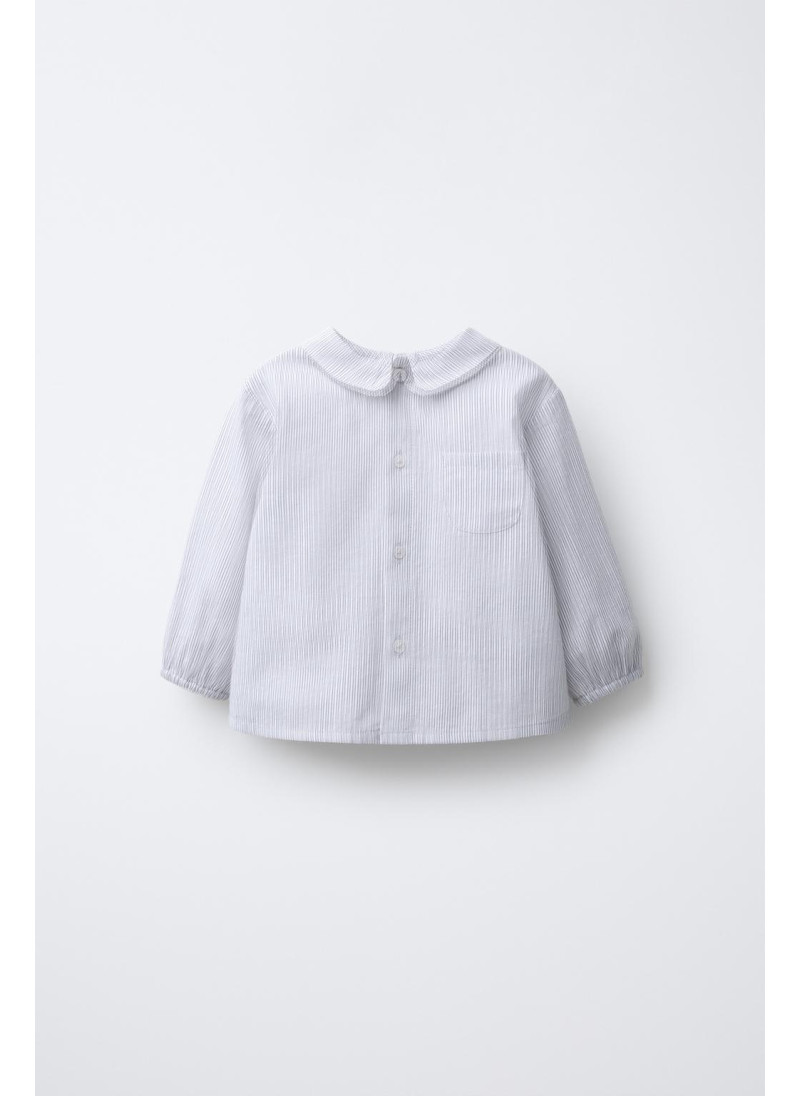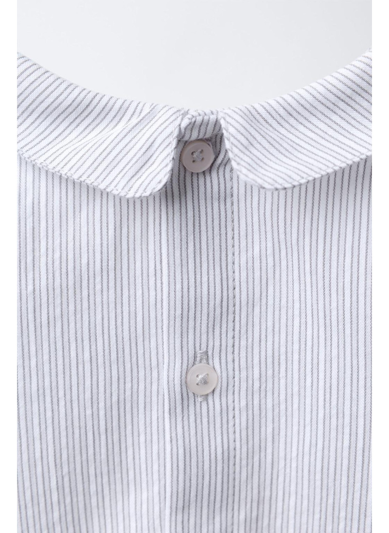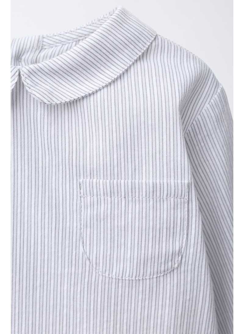 Рубашка с воротником «Питер Пэн» и длинными рукавами на резинке. Накладной карман сзади. Застежка на пуговицы сзади. В полоску.