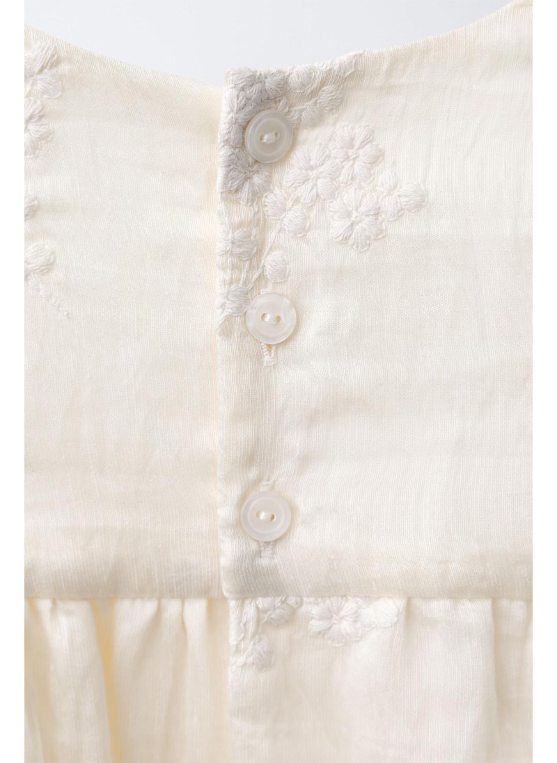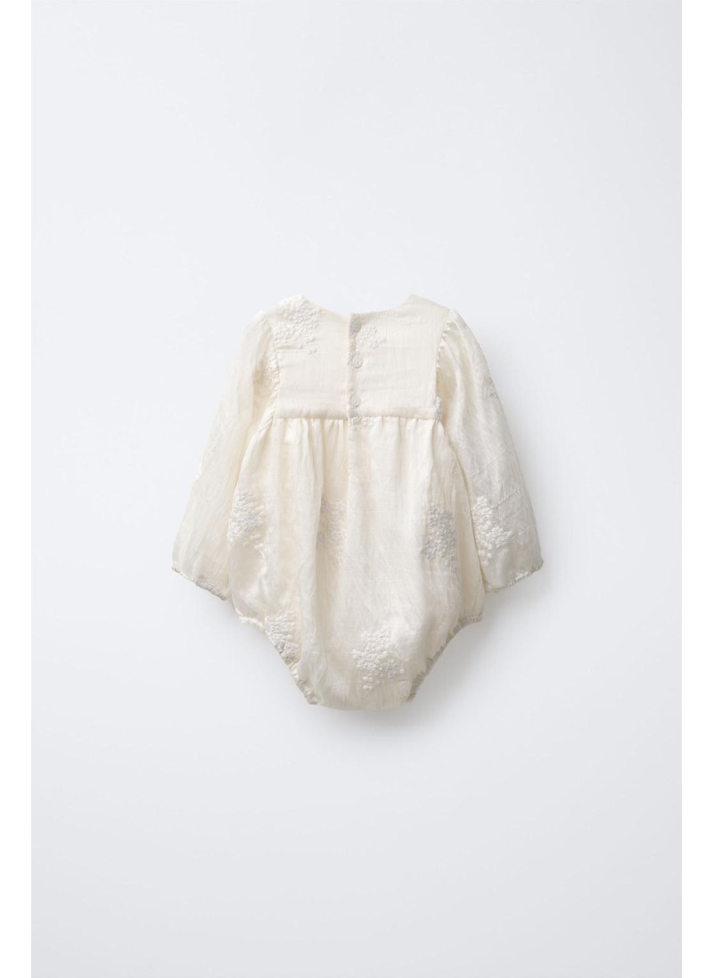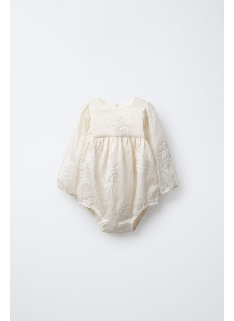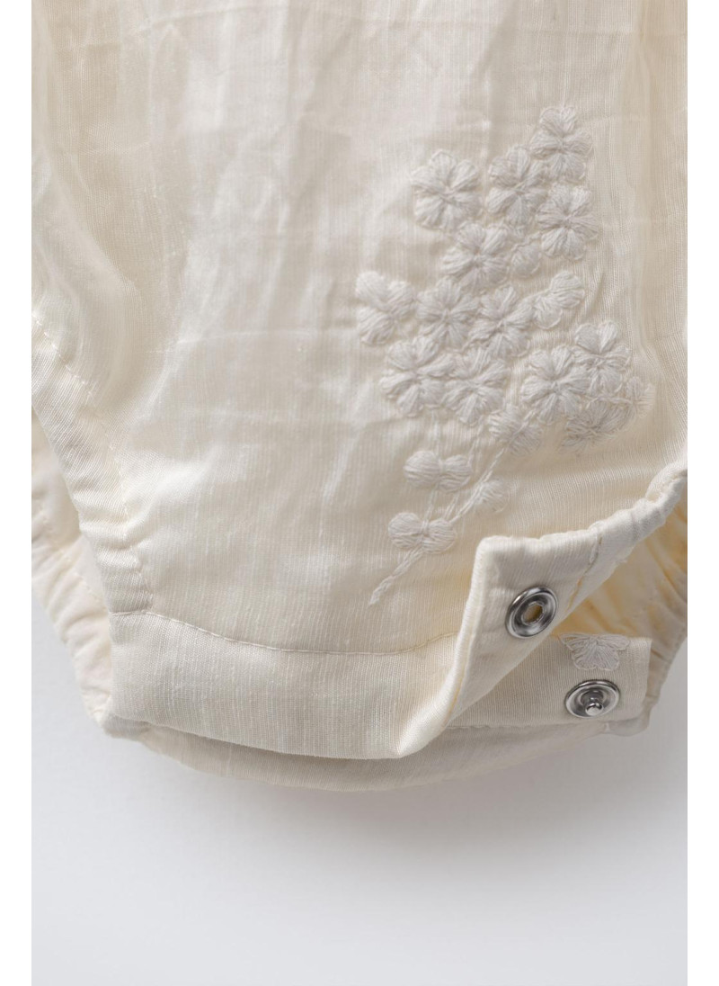 Комбинезон с круглым вырезом и длинными рукавами. Застежка на пуговицах сзади и кнопки внизу. Цветочная вышивка.