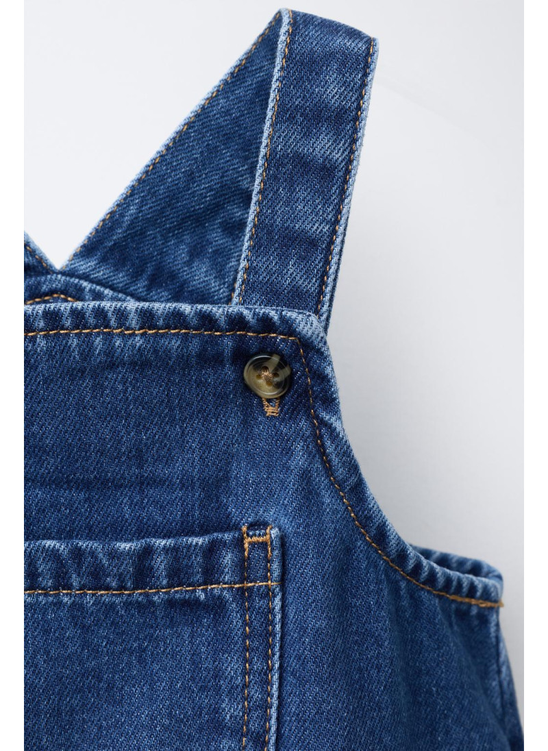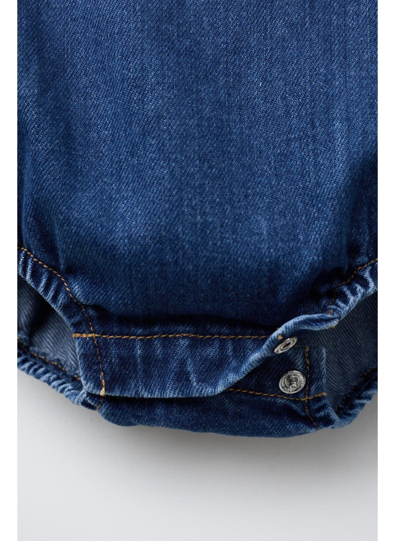 Джинсовый комбинезон с квадратным вырезом. Бретели с застежкой на пуговицы спереди. Накладной передний карман. Застежка на кнопки снизу...