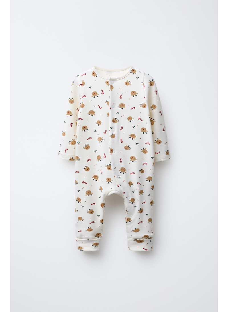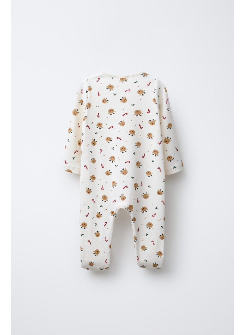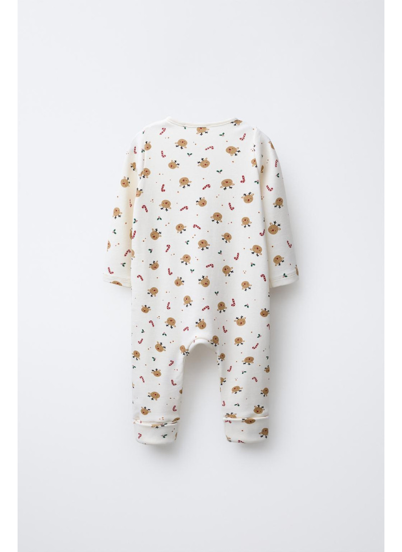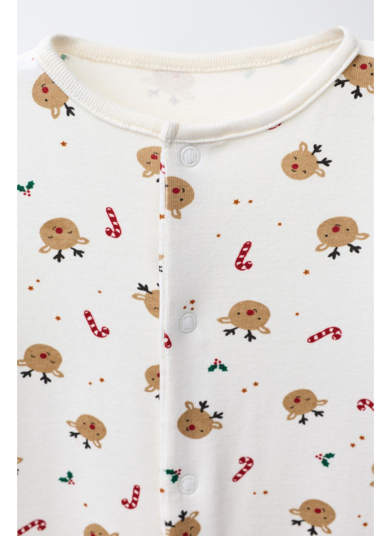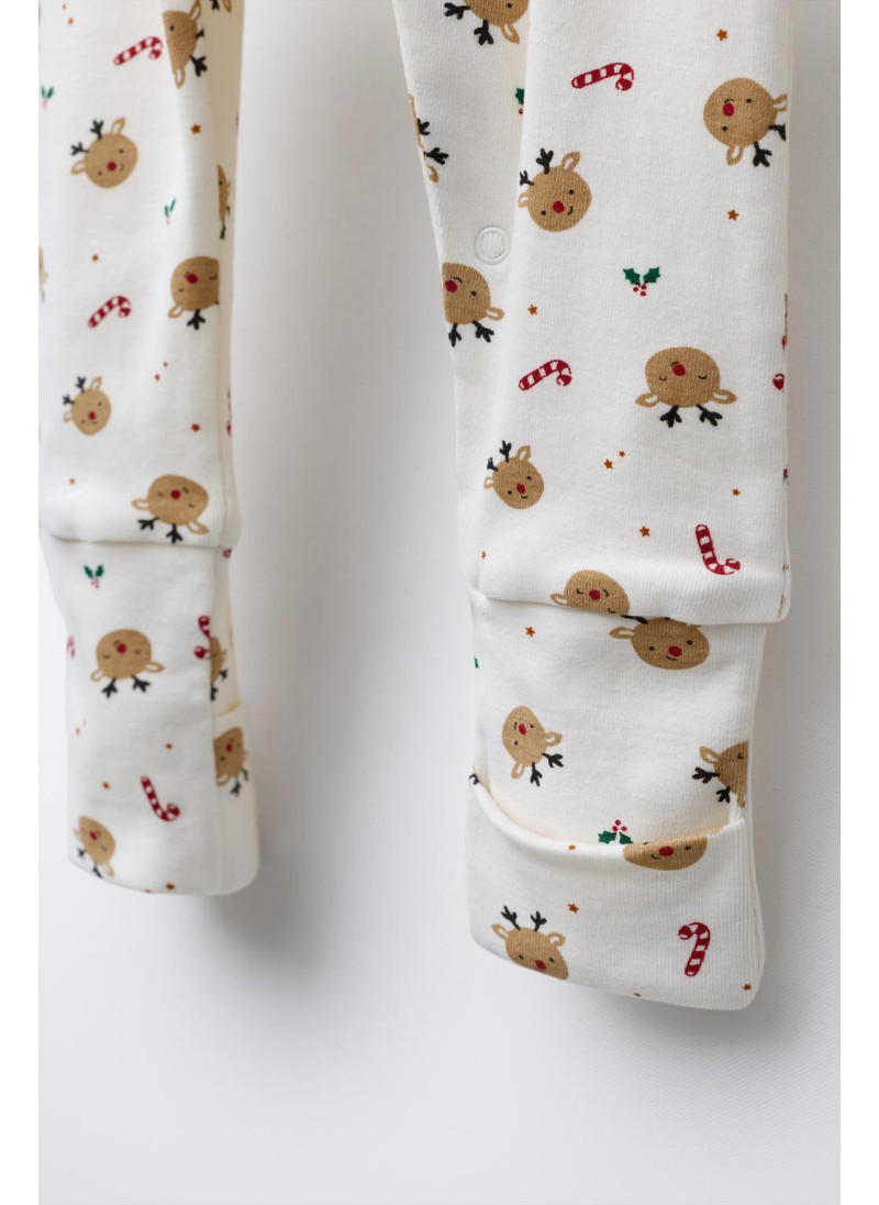 Комбинезон с круглым вырезом и длинными рукавами. Регулируемый низ, который можно трансформировать в пинетки. Застегивается на кнопки спереди. Принт с оленями.