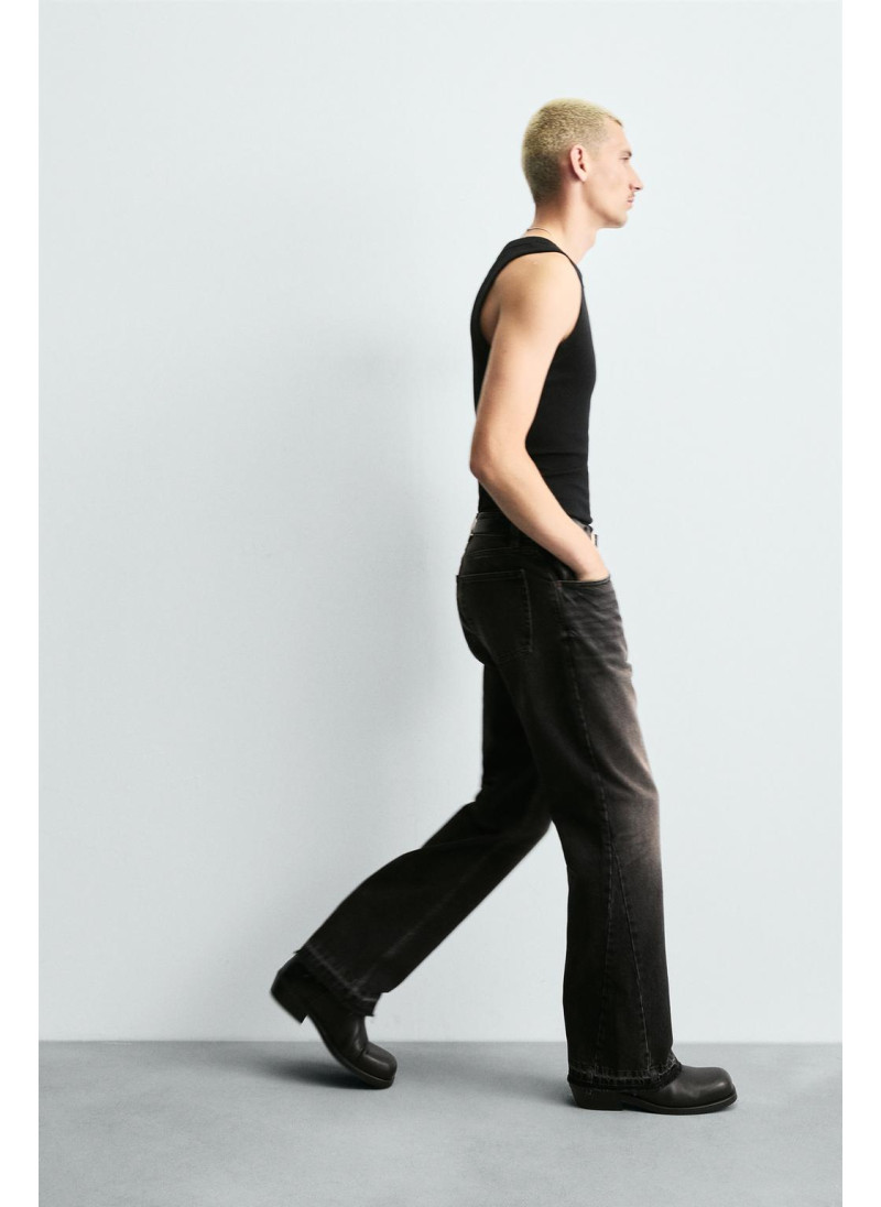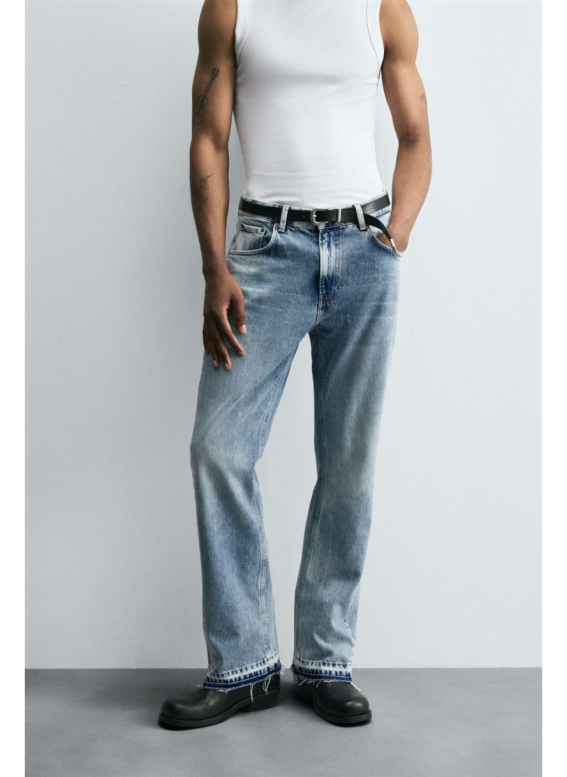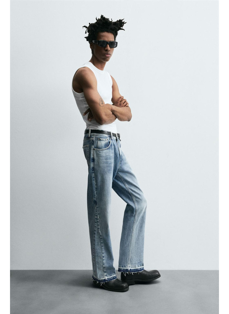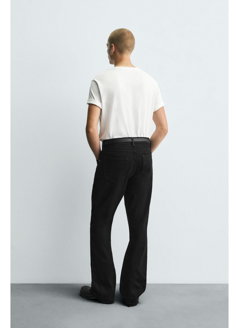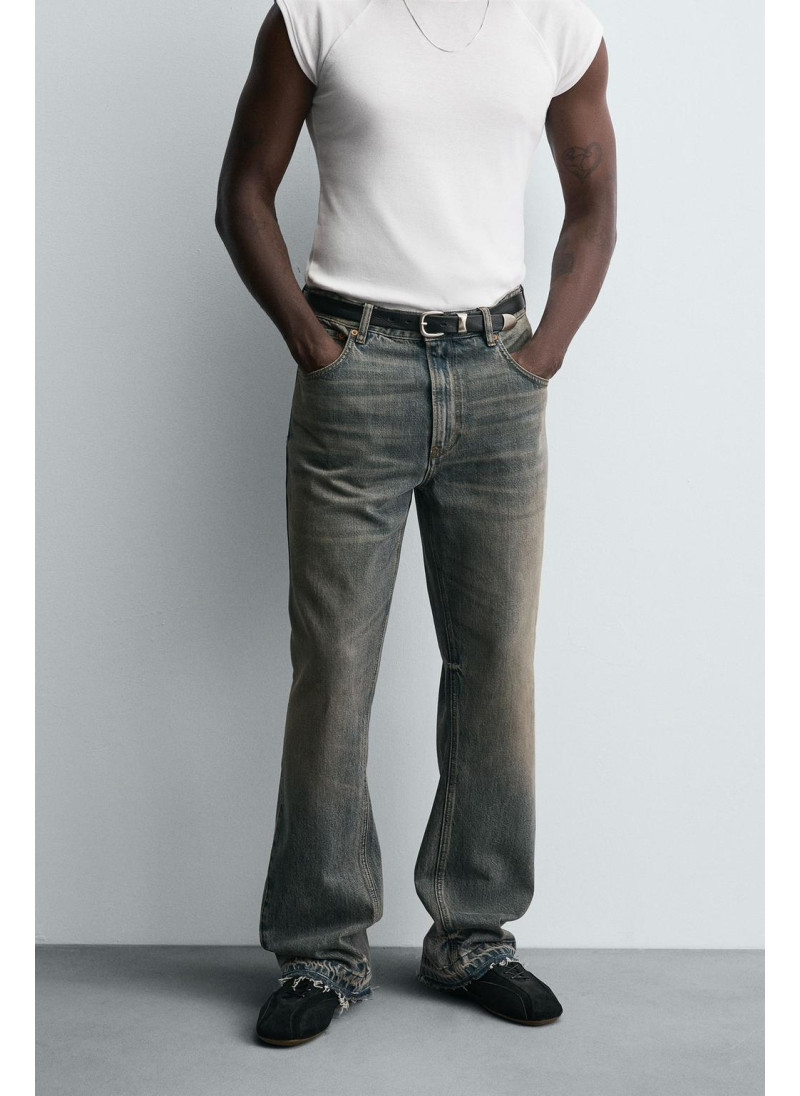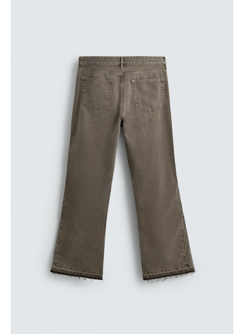 Облегающие сверху и расширяющиеся книзу с колена. Средняя посадка. Жесткая ткань. Джинсы с расклешенными брючинами из хлопкового денима. Пять карманов. Неровный нижний край. Молния и пуговицы на ластовице.