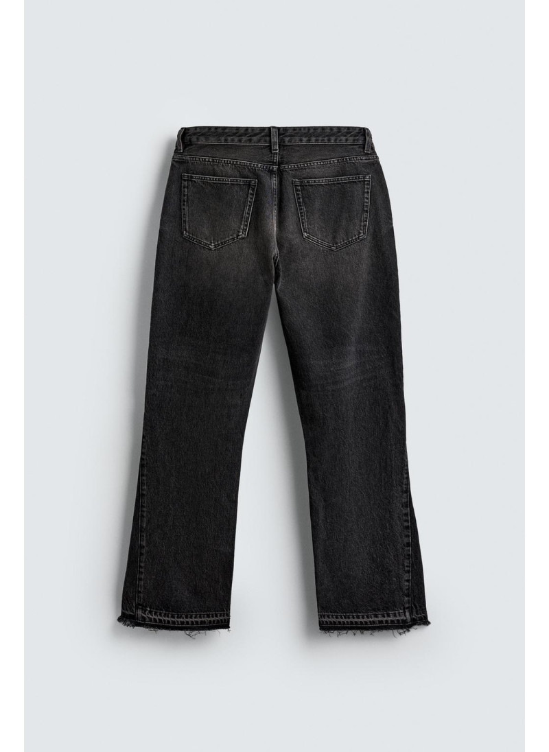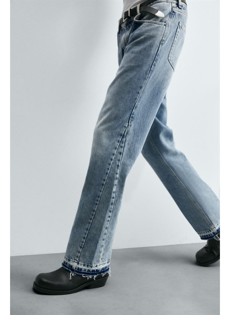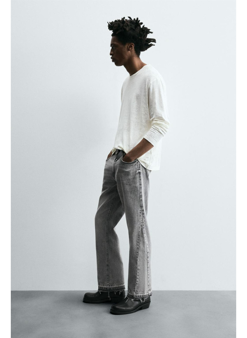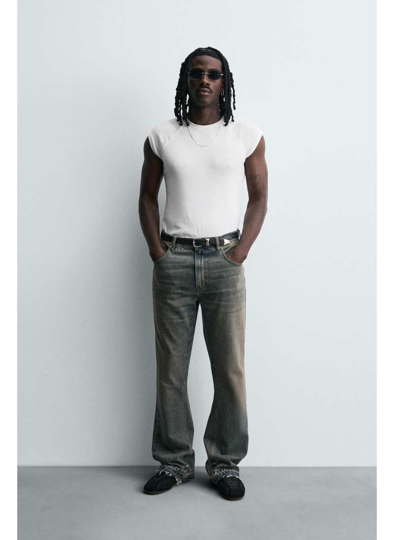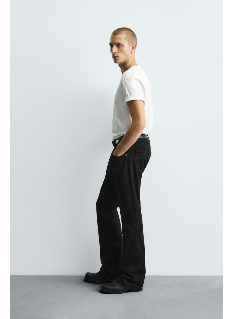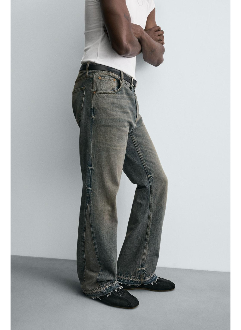 Облегающие сверху и расширяющиеся книзу с колена. Средняя посадка. Жесткая ткань. Джинсы с расклешенными брючинами из хлопкового денима. Пять карманов. Неровный нижний край. Молния и пуговицы на ластовице.
