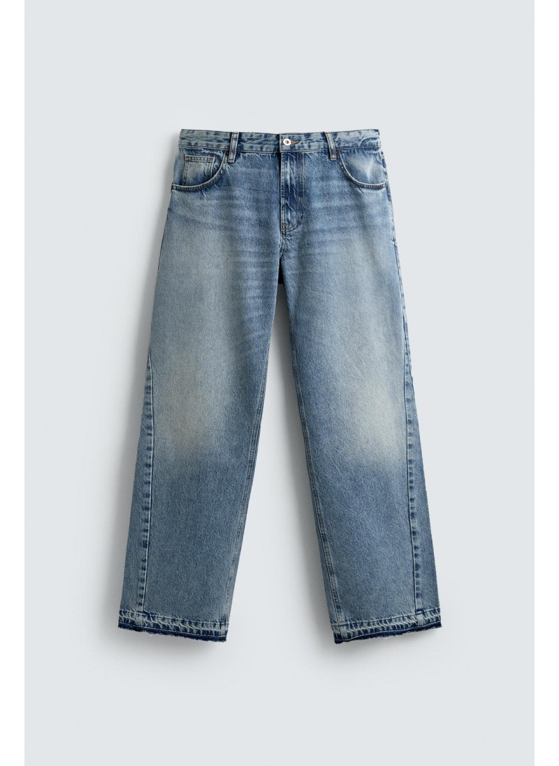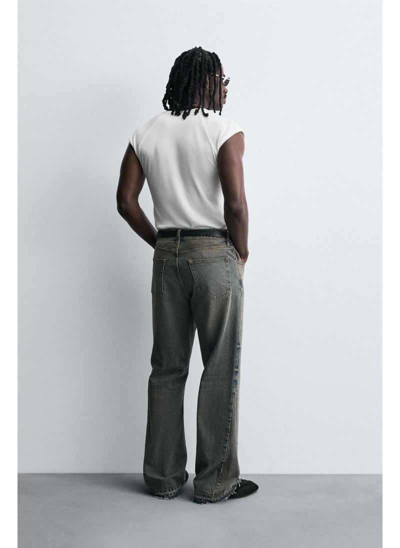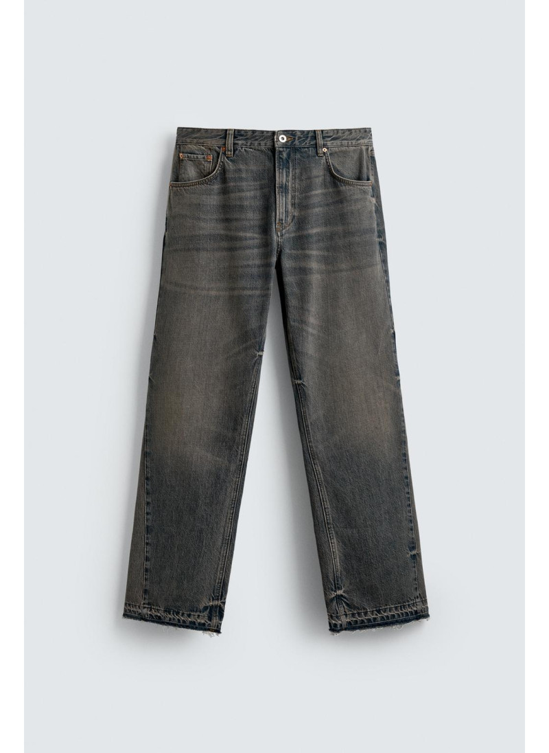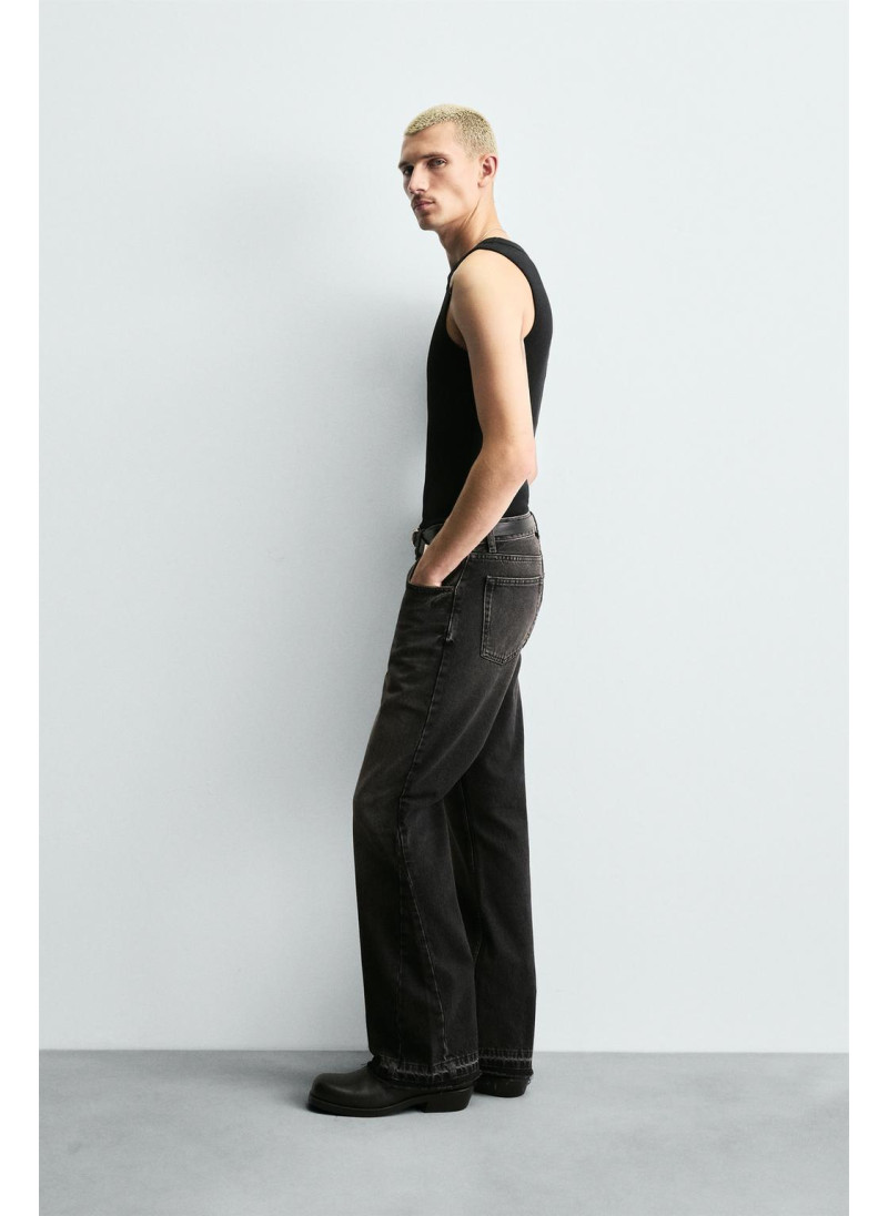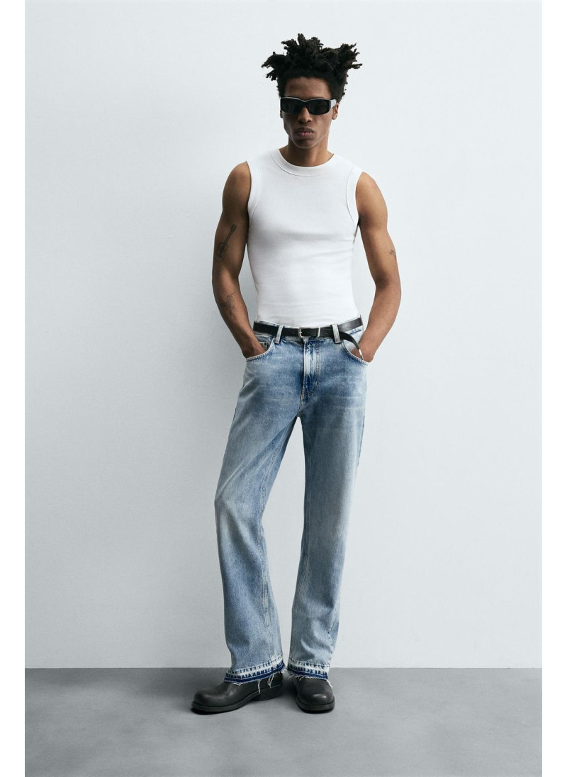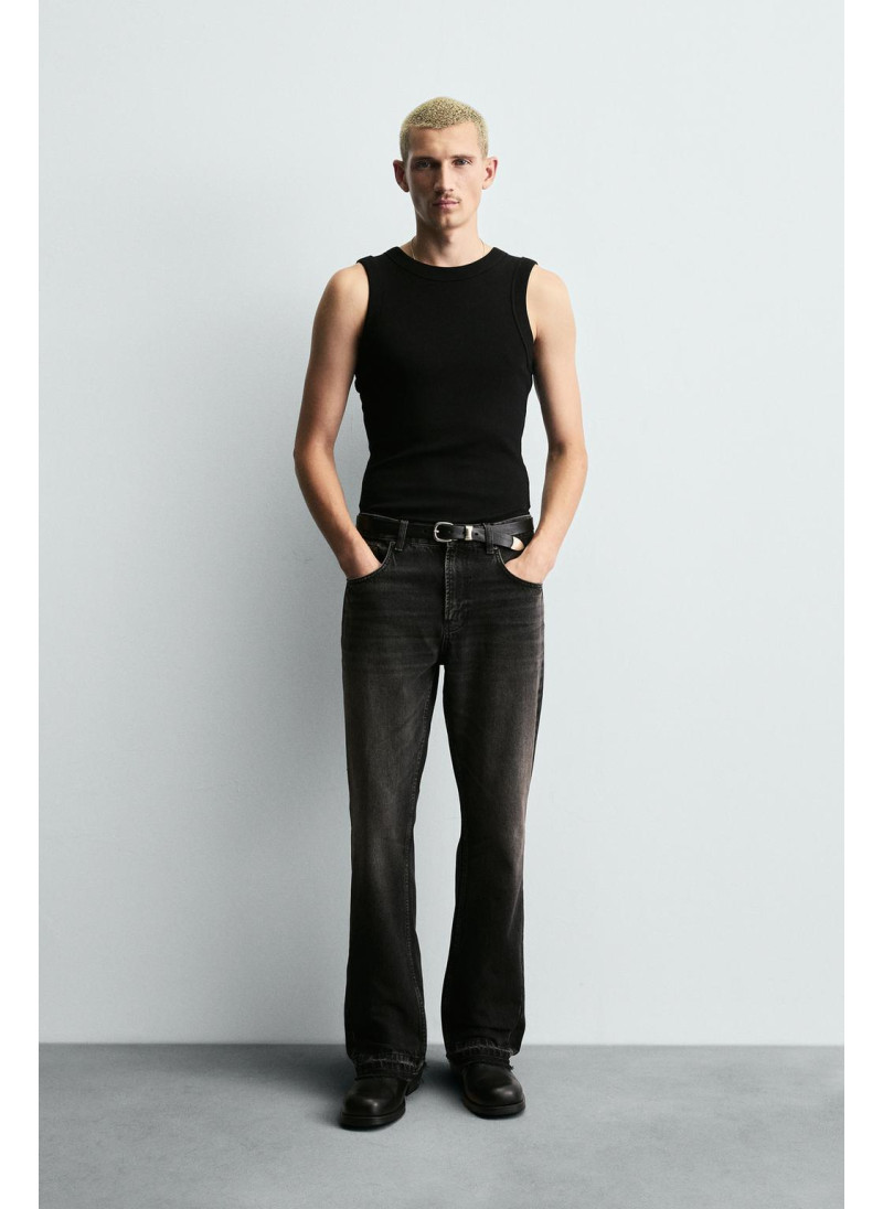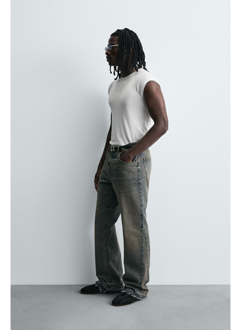 Облегающие сверху и расширяющиеся книзу с колена. Средняя посадка. Жесткая ткань. Джинсы с расклешенными брючинами из хлопкового денима. Пять карманов. Неровный нижний край. Молния и пуговицы на ластовице.