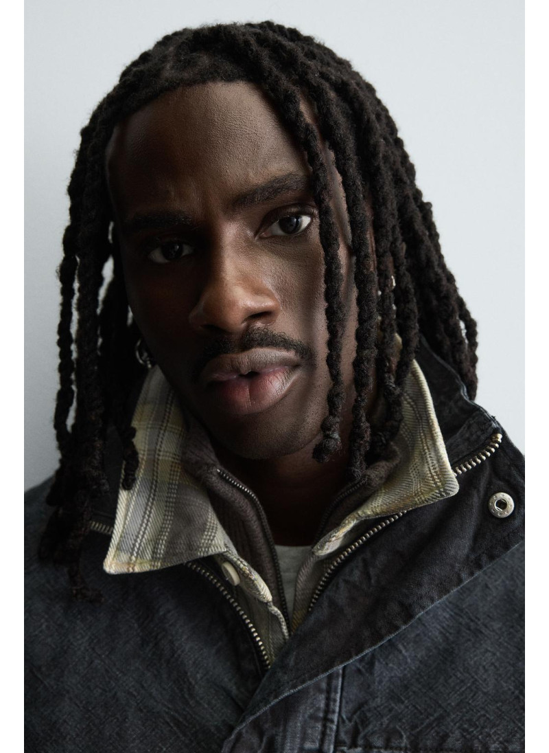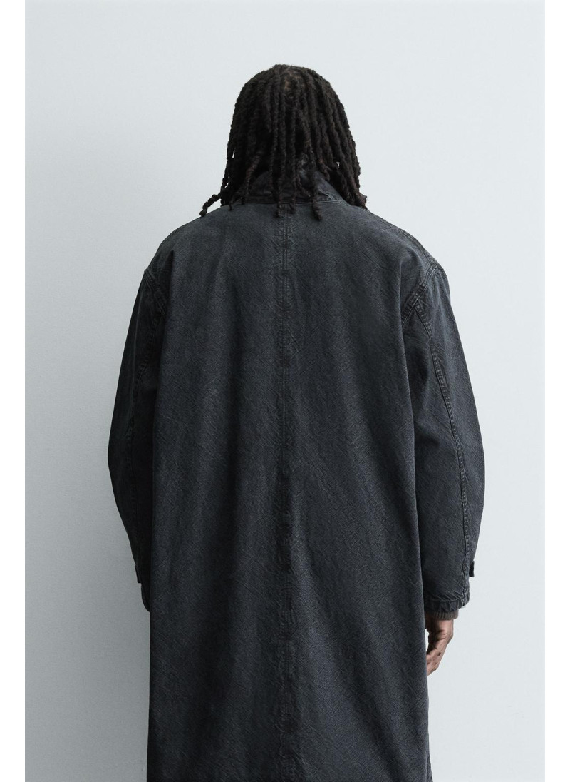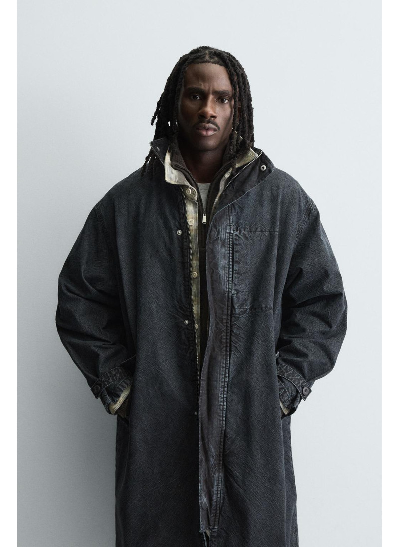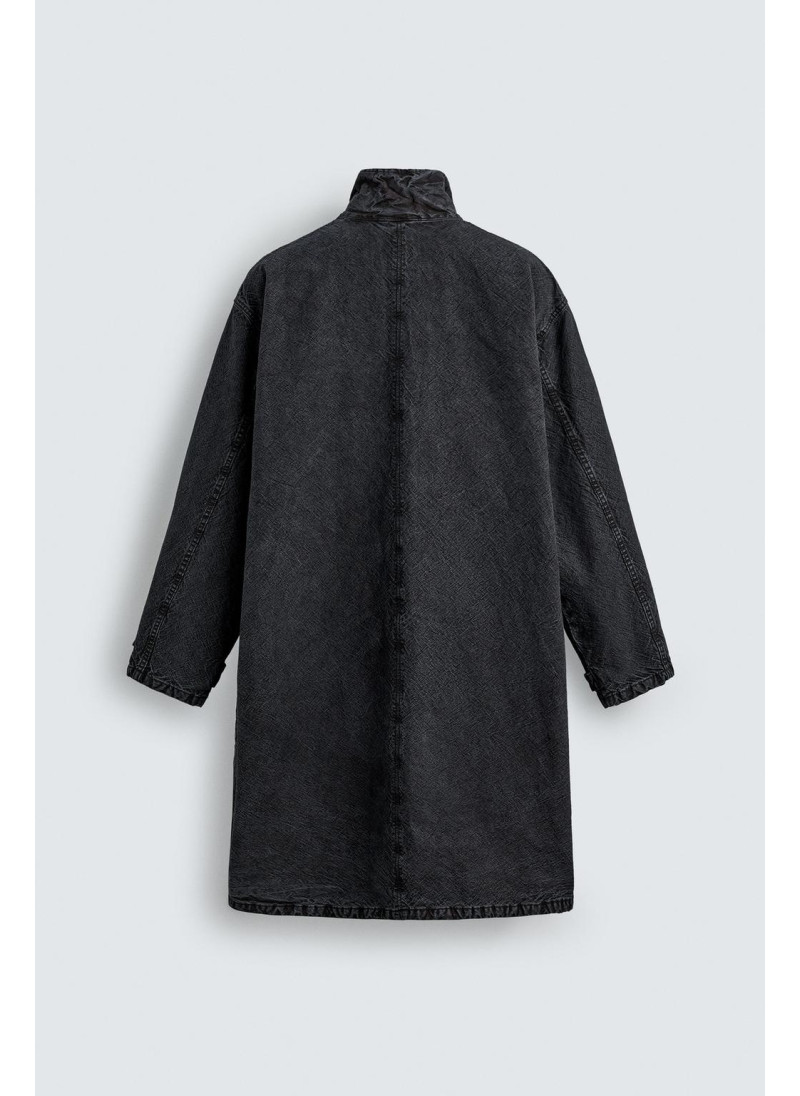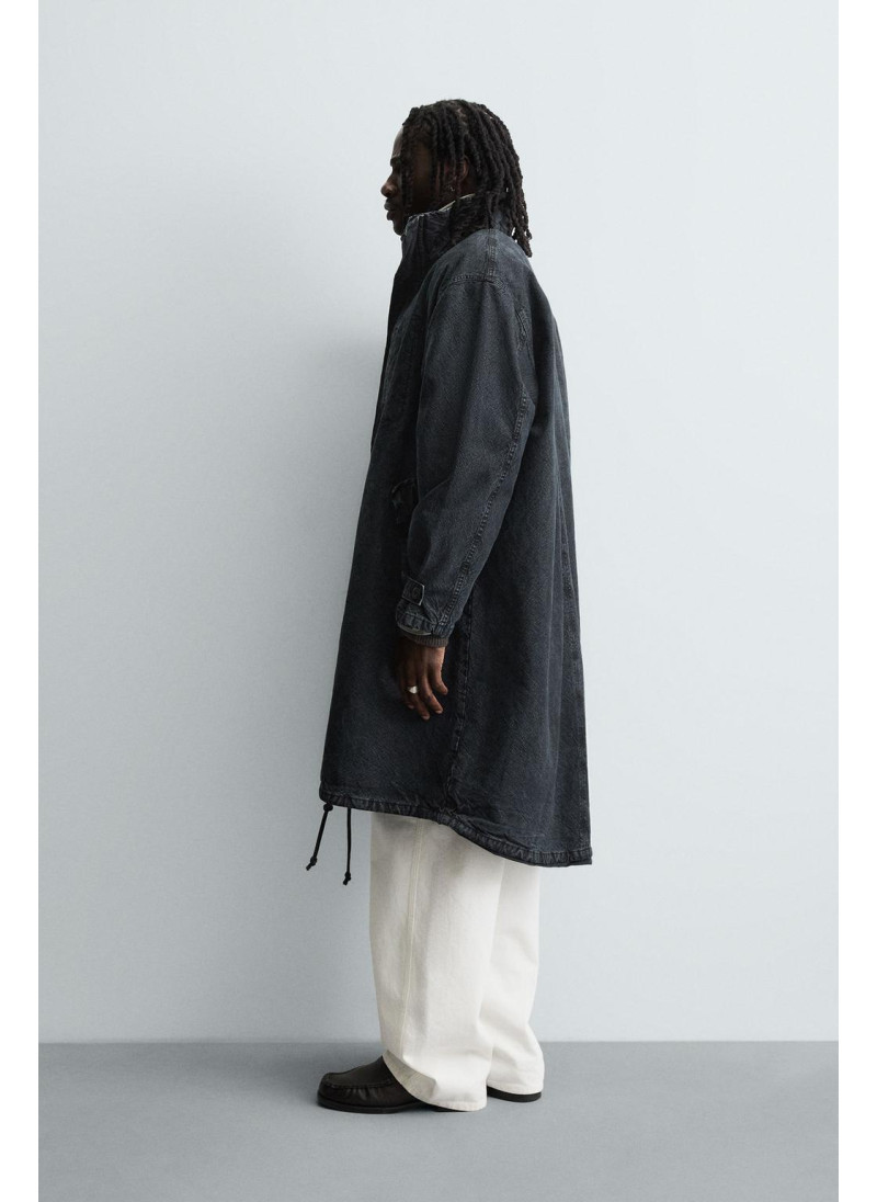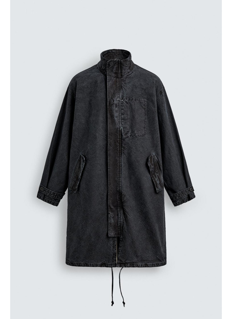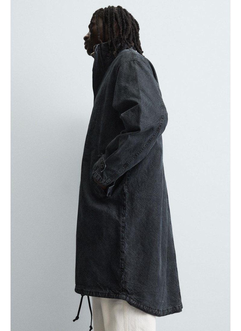 Пальто свободного кроя из хлопкового денима. Хлопковая подкладка. Воротник-стойка и длинный рукав с регулируемым манжетом и петелькой. Накладной карман на груди и накладной карман на бедре. Эффект стирки. Регулируемый низ на шнурке. Передняя застежка-молния скрыта планкой на кнопках-застежках...