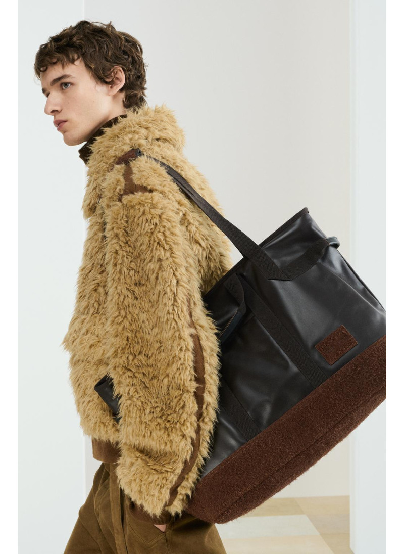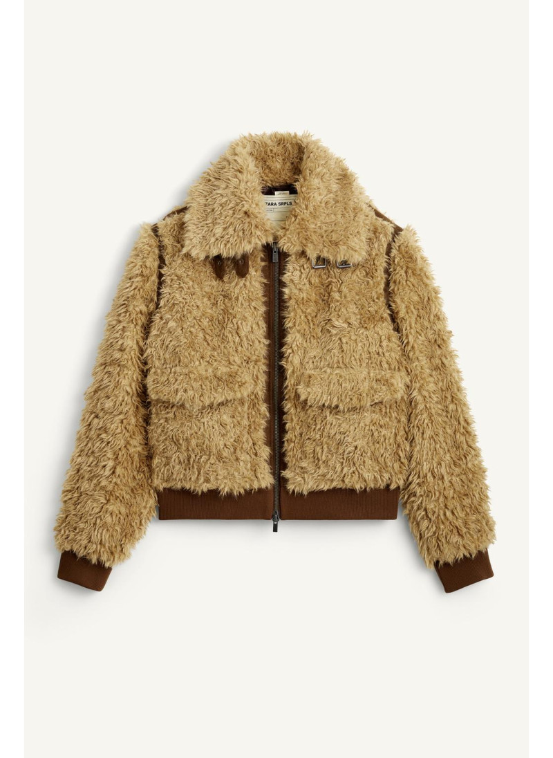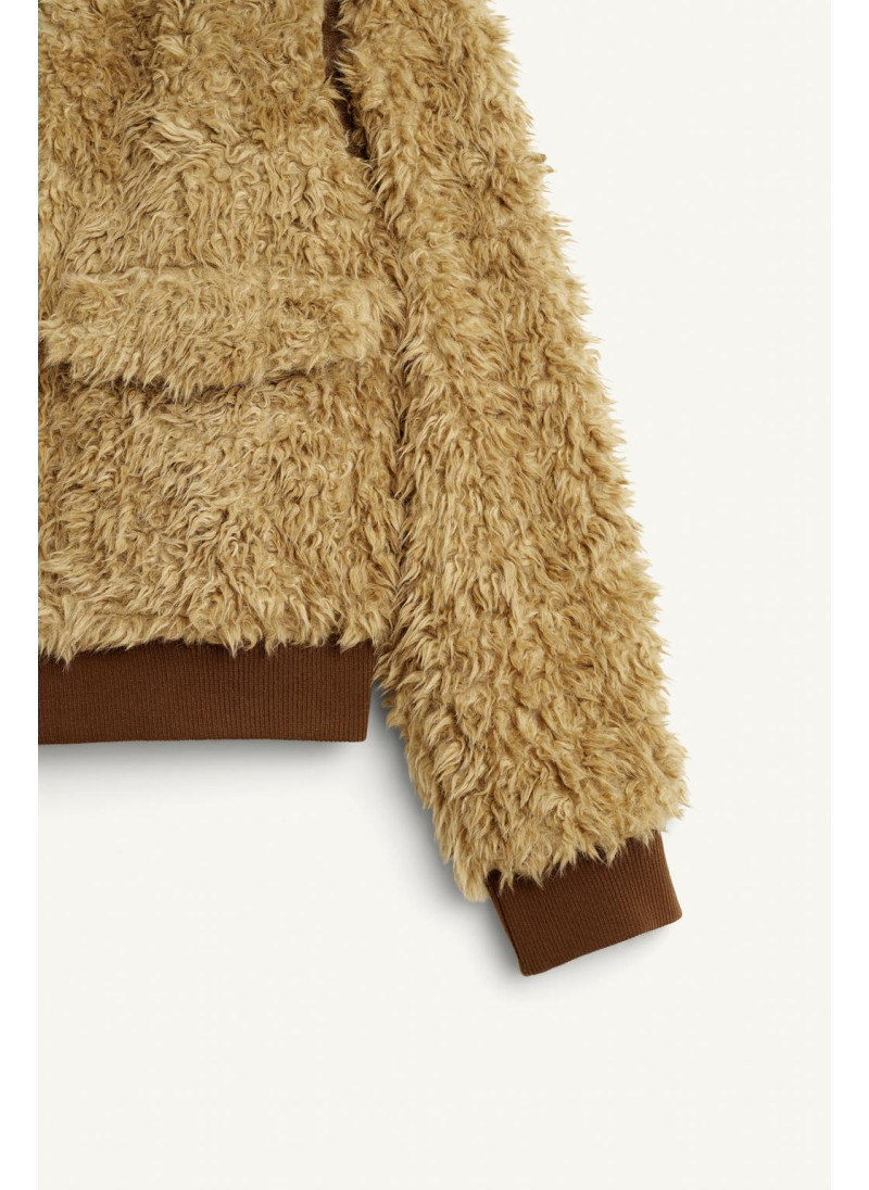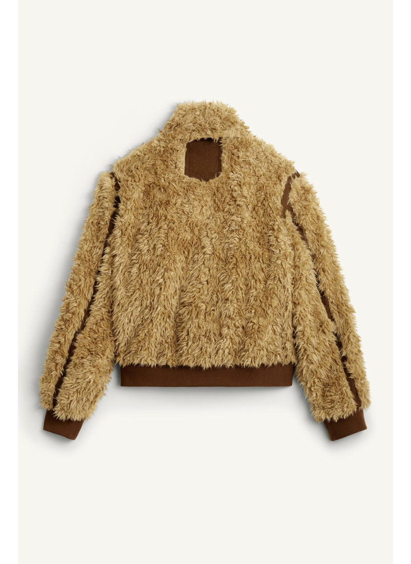 Облегающий жакет из ткани с эффектом овечьего меха. Имеет широкий отделанный воротник-стойку с петлями. Длинные рукава. Передние накладные карманы с клапанами. Контрастные отделочные элементы. Застежка на молнии спереди.