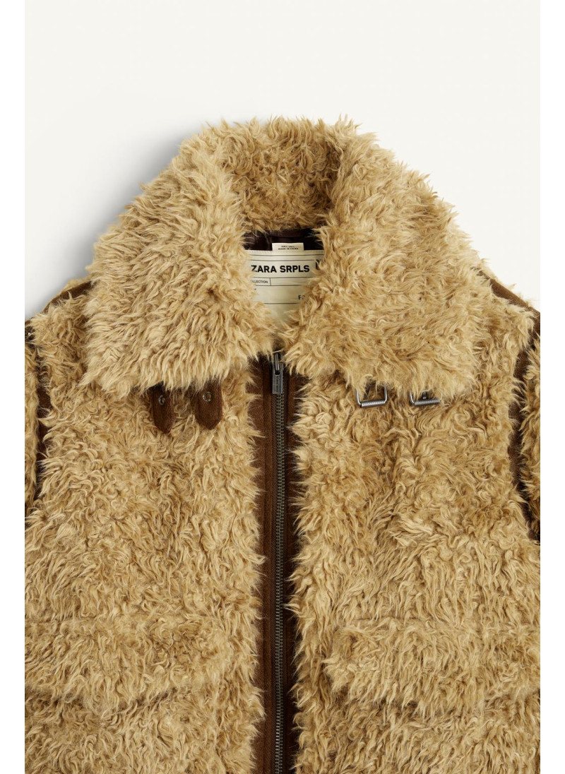 Облегающий жакет из ткани с эффектом овечьего меха. Имеет широкий отделанный воротник-стойку с петлями. Длинные рукава. Передние накладные карманы с клапанами. Контрастные отделочные элементы. Застежка на молнии спереди...