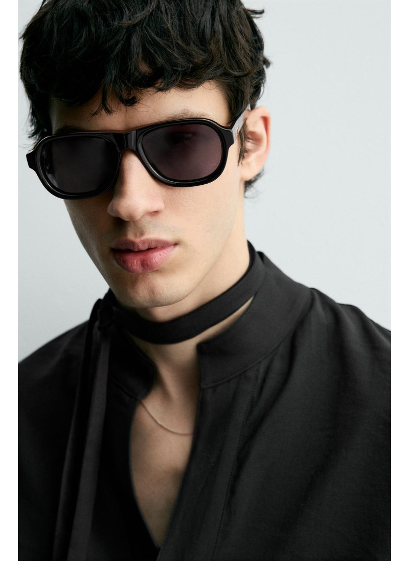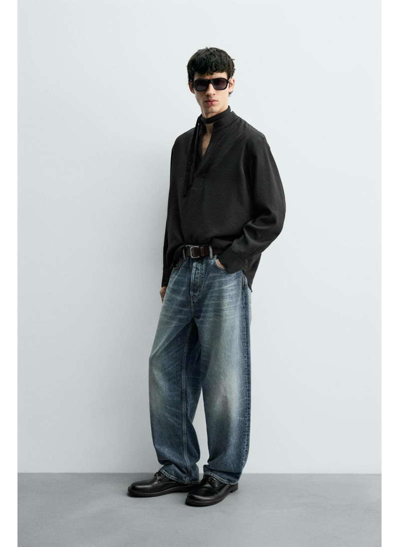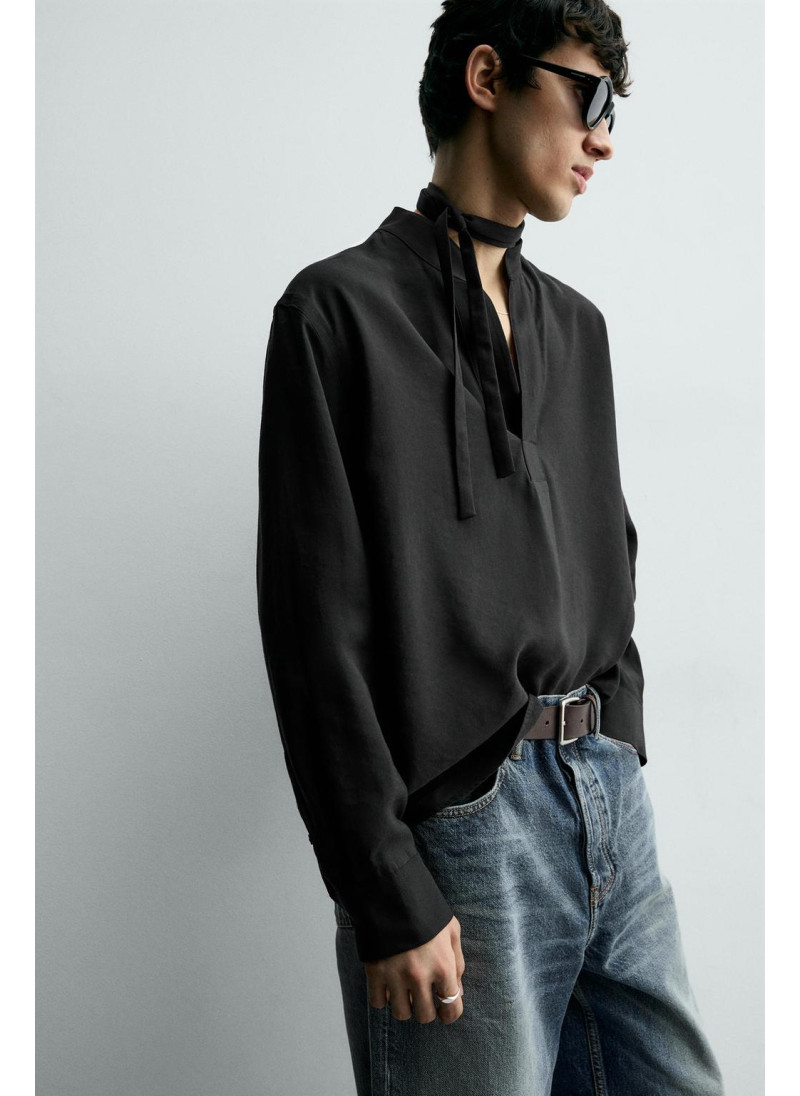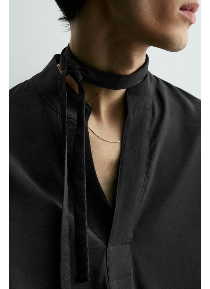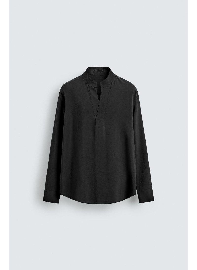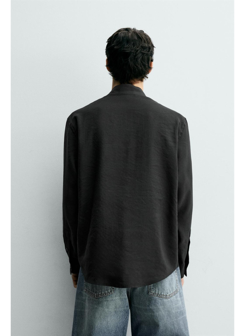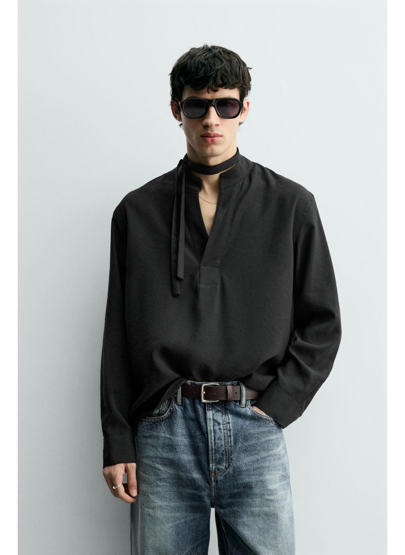 Рубашка свободного кроя из модального смесового материала. Имеет стойку-воротник, застежку спереди и длинные рукава с пуговицами на манжетах.