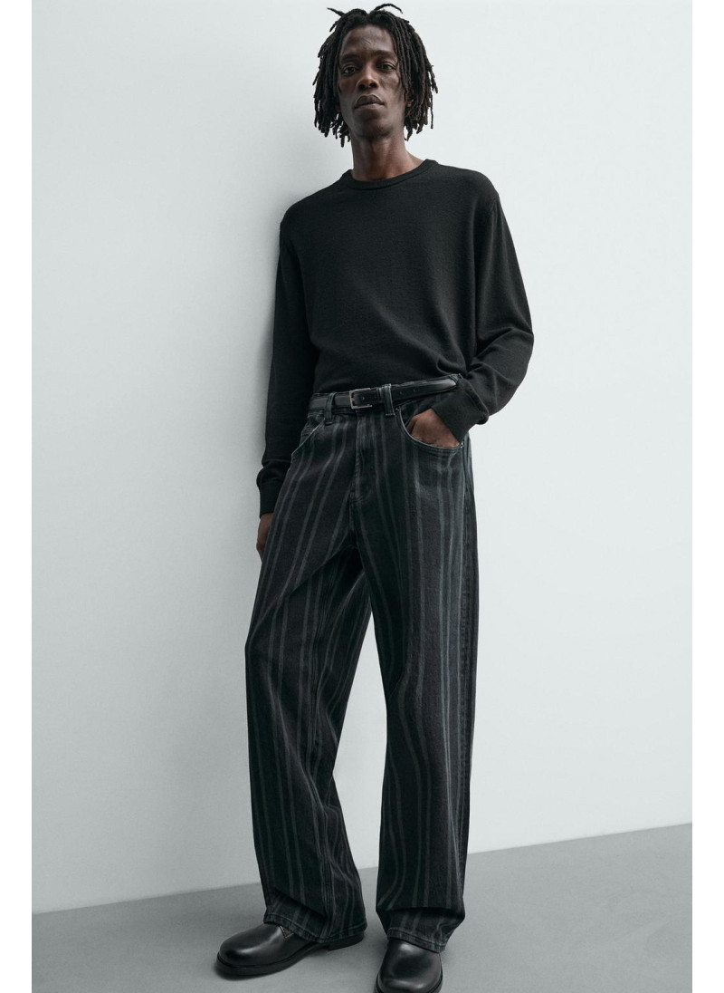 Прямые от бедра к лодыжке, с более свободной посадкой, чем у классических прямых. Cредняя посадка. Жесткая ткань. Джинсы свободного кроя из хлопкового денима. Пять карманов. Размытый эффект полосатого принта. Молния и пуговицы...