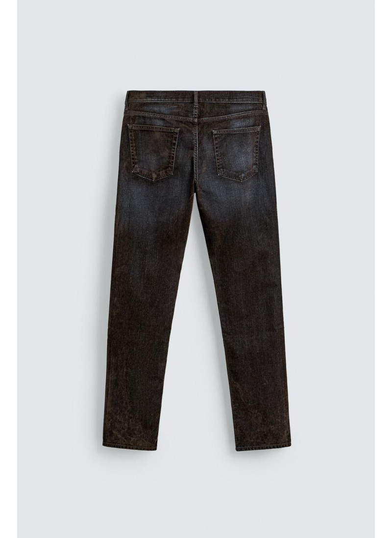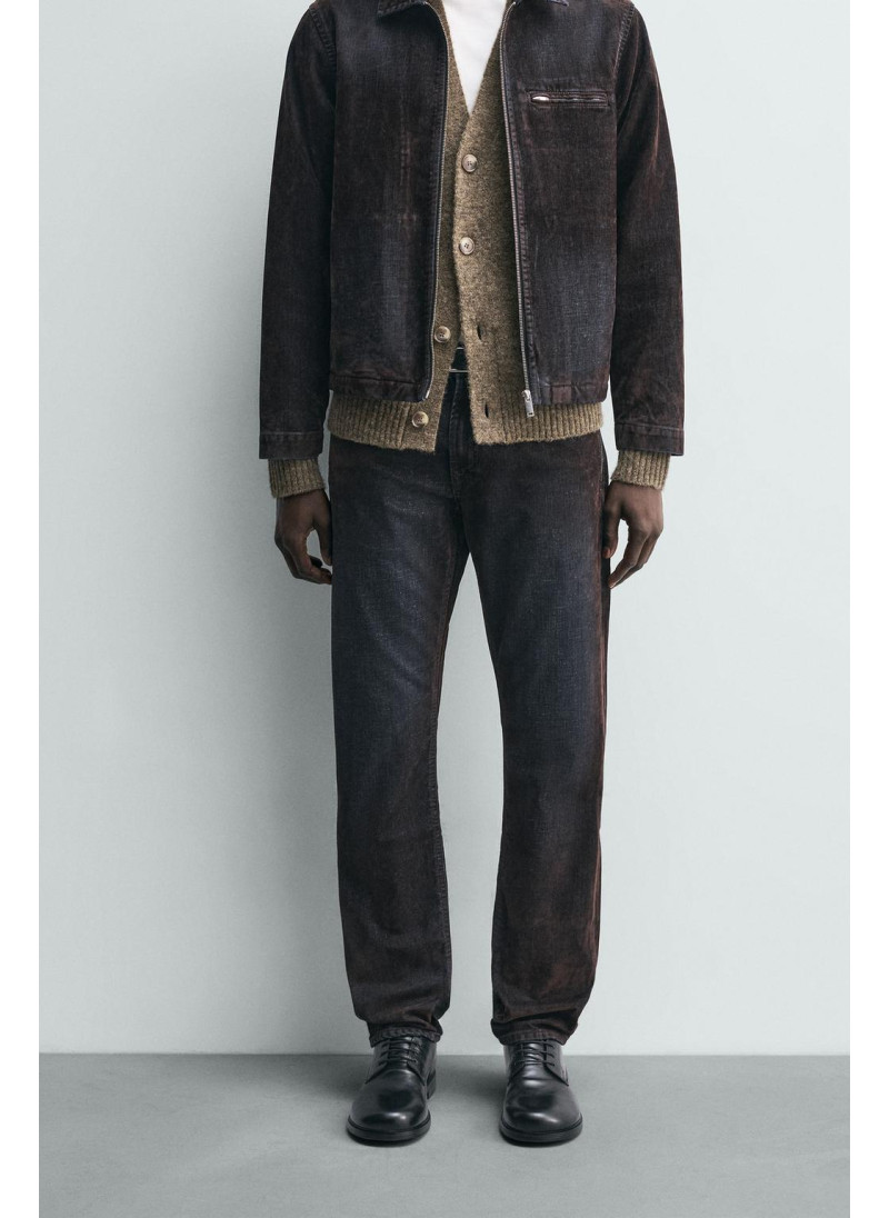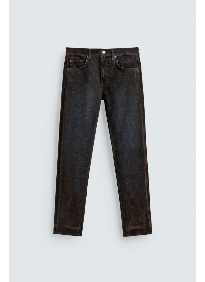 Джинсы средней свободы из хлопковой ткани с эффектом мягкого бархата. Пять карманов. Молния и пуговицы для застежки.