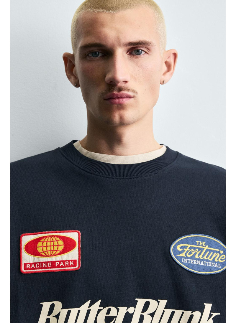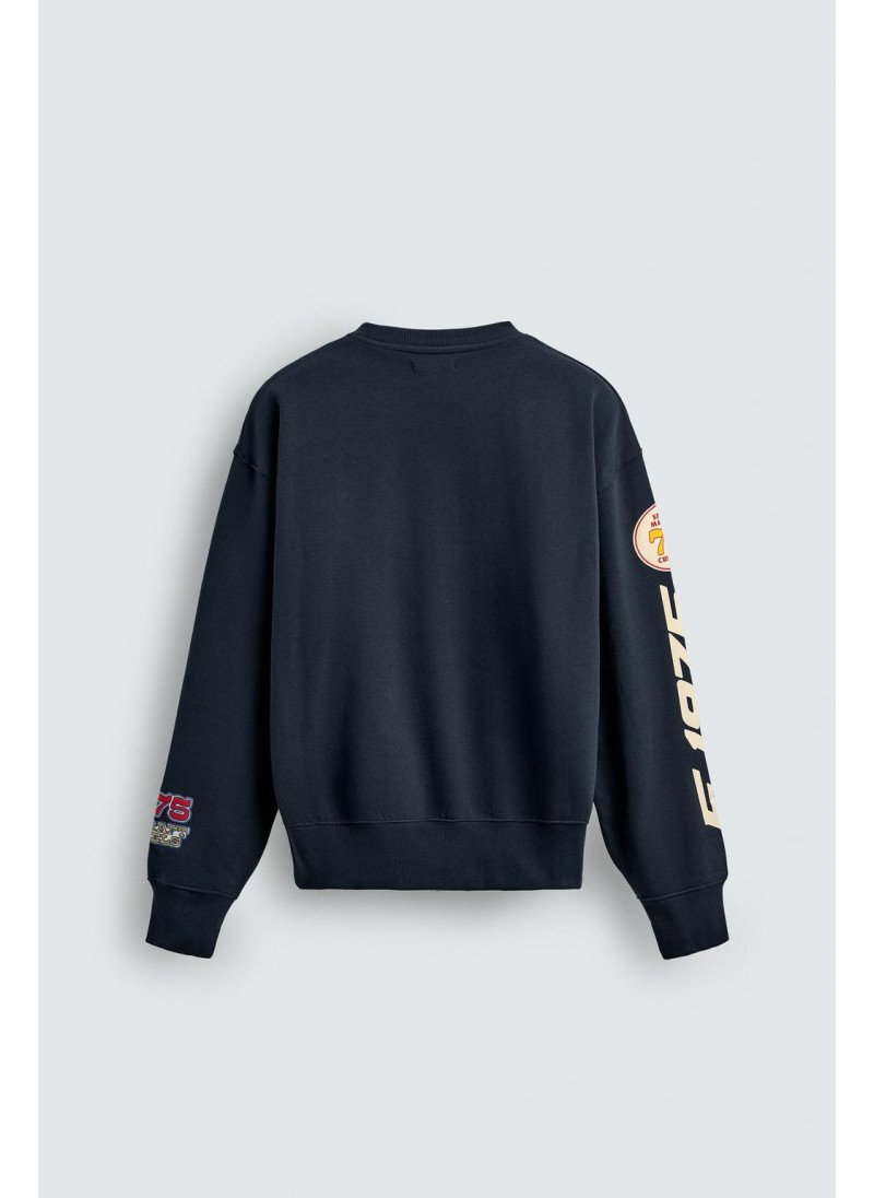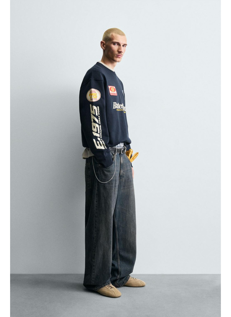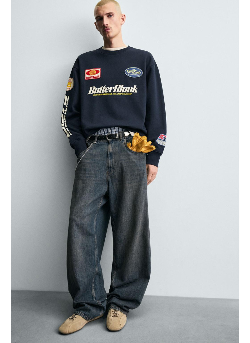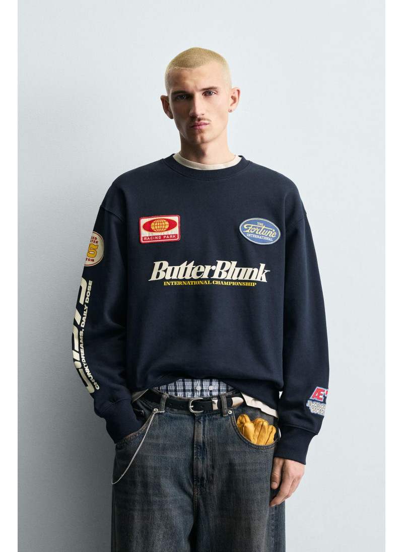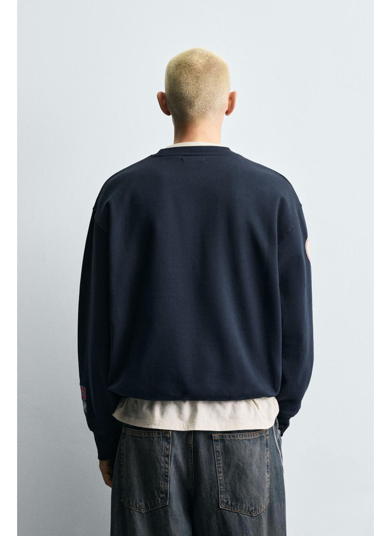 Свитшот свободного кроя с длинным рукавом и круглым вырезом. Имеет сочетание нашивок и контрастных принтов на передней и боковых частях. Ребристые манжеты.