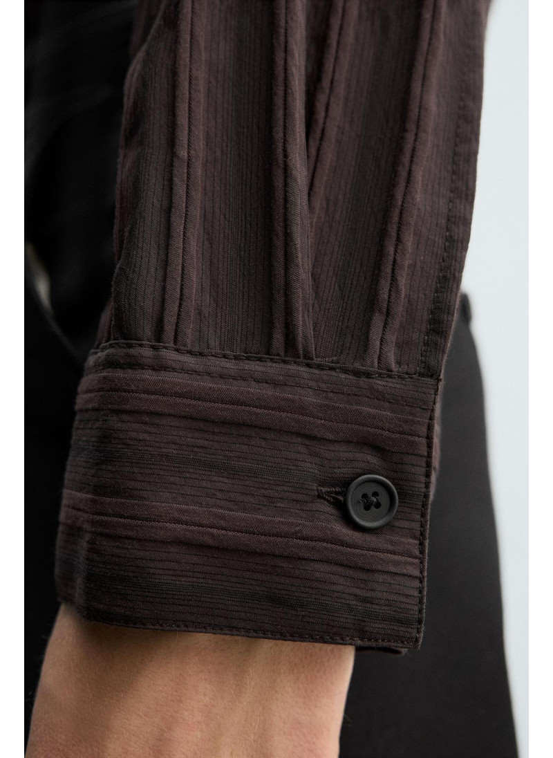 Рубашка свободного кроя из струящейся ткани с добавлением вискозы. Итальянский воротник и длинные рукава с манжетами на пуговицах. Застежка на пуговицы спереди.
