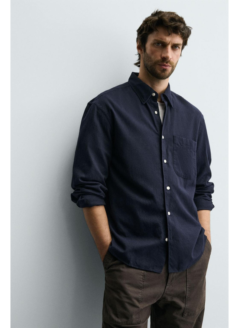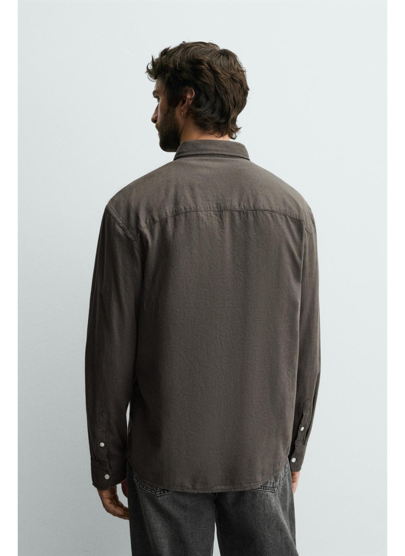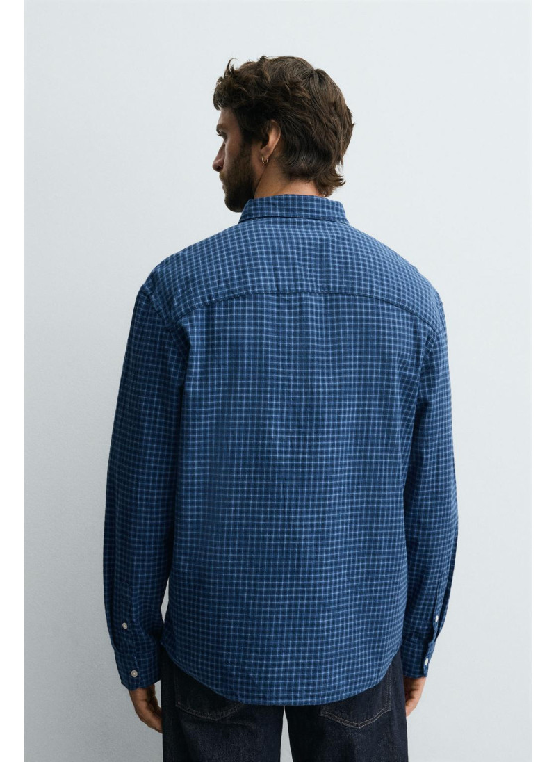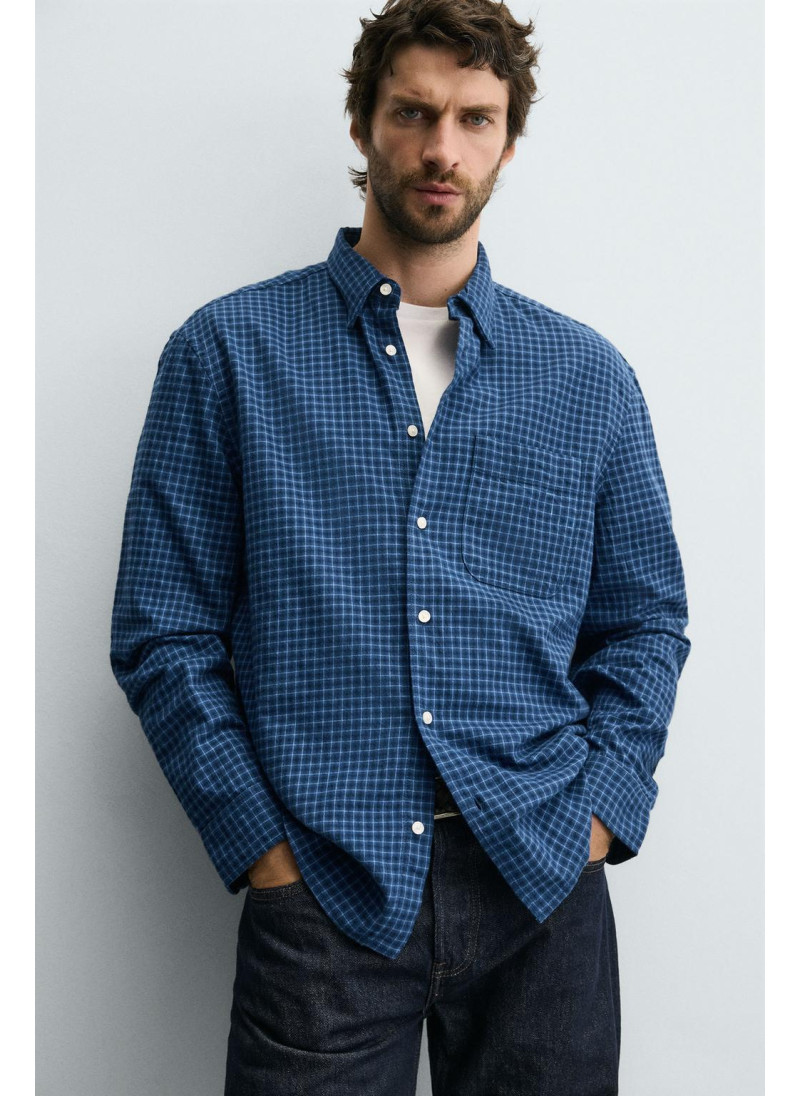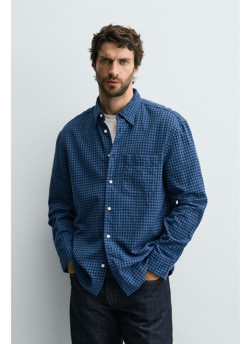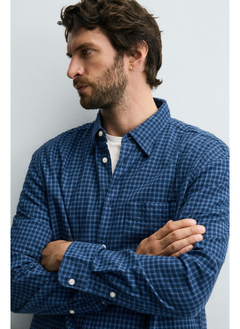 Рубашка свободного кроя из хлопковой ткани с финишной отделкой из фланели. Она имеет воротник, длинные рукава с пуговицами на манжетах, нагрудный карман, и застежку на пуговицы.