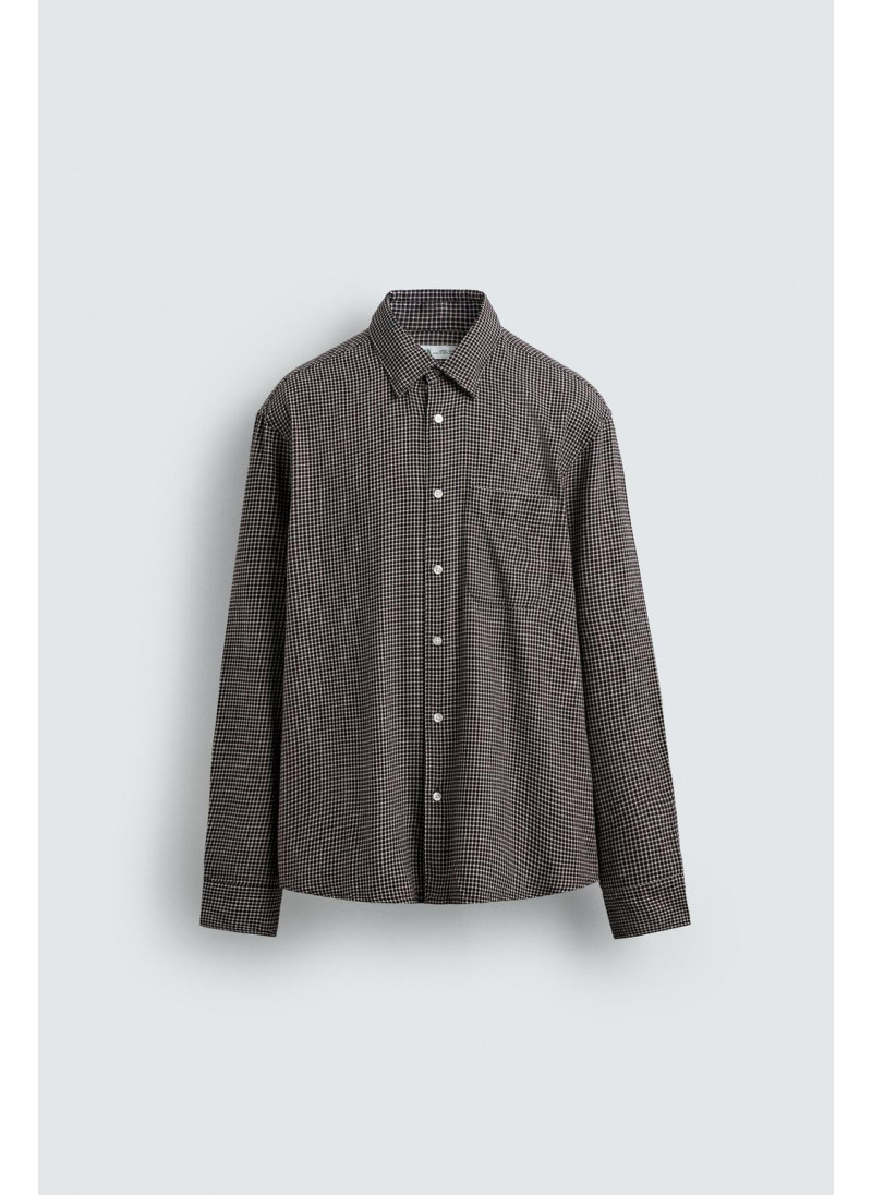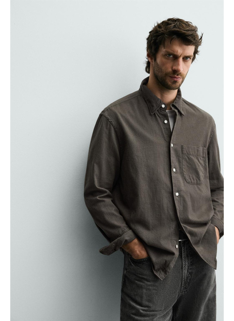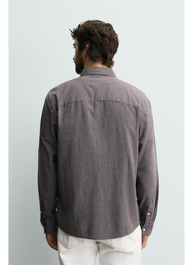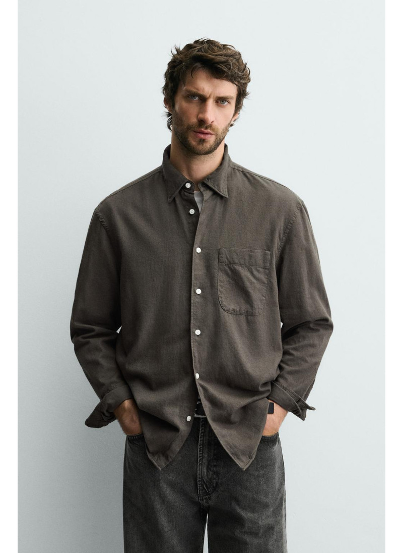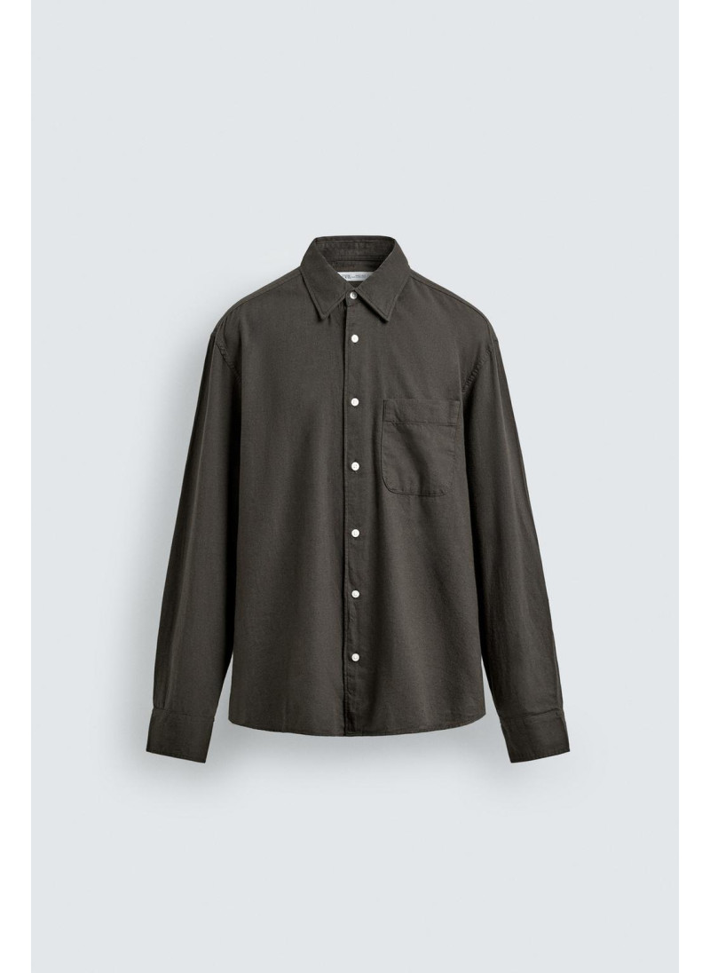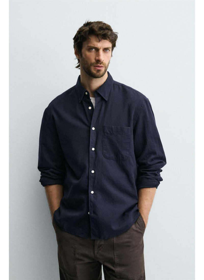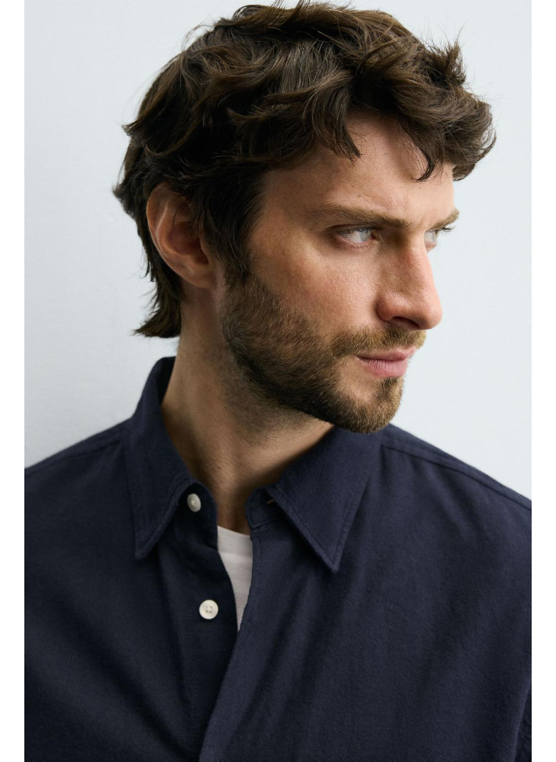 Рубашка свободного кроя из хлопковой ткани с финишной отделкой из фланели. Она имеет воротник, длинные рукава с пуговицами на манжетах, нагрудный карман, и застежку на пуговицы.