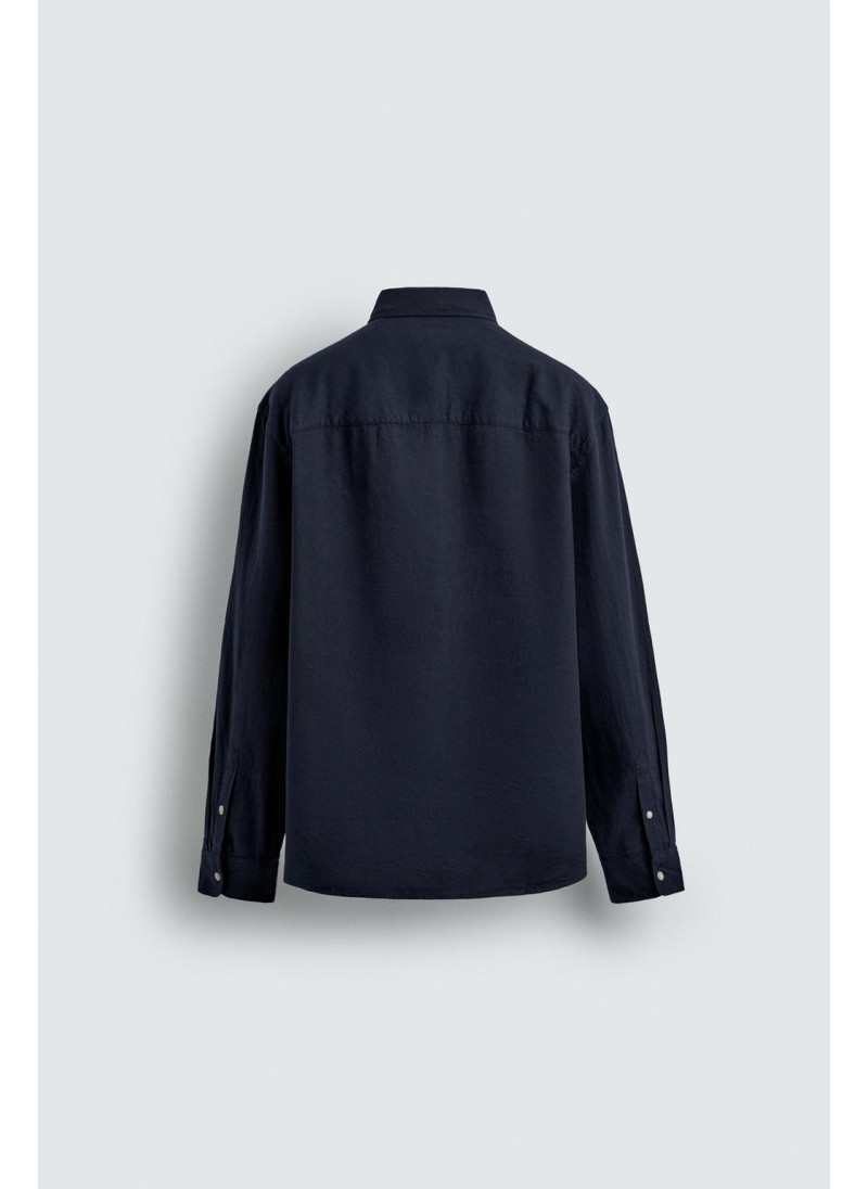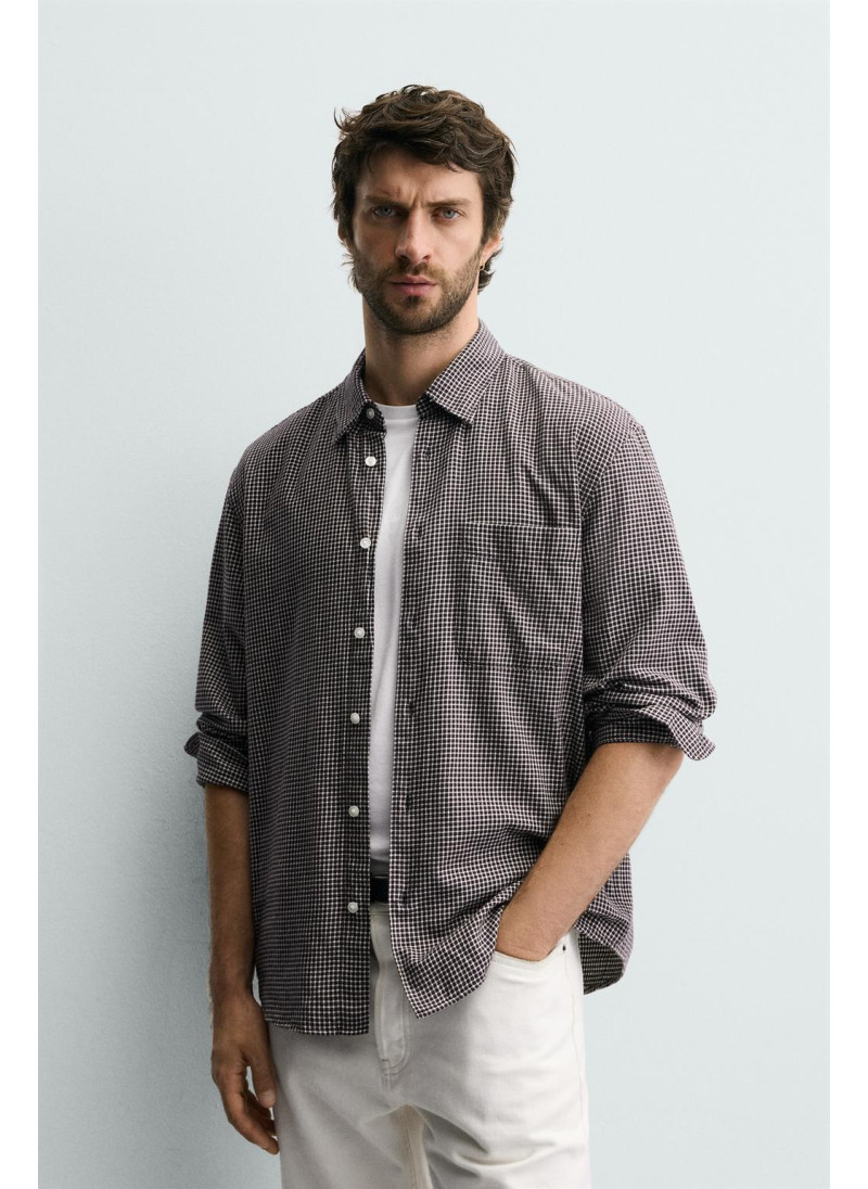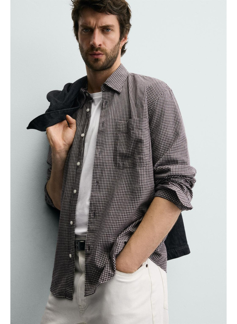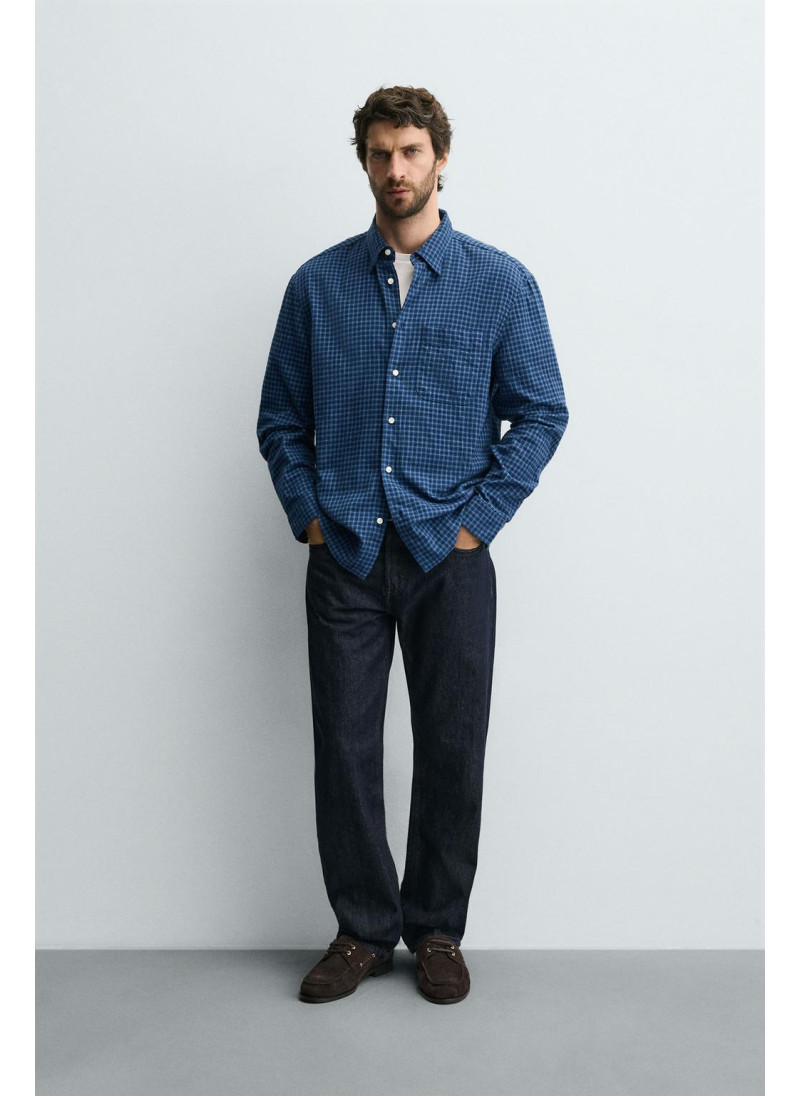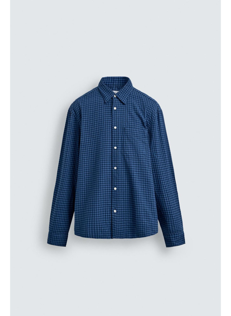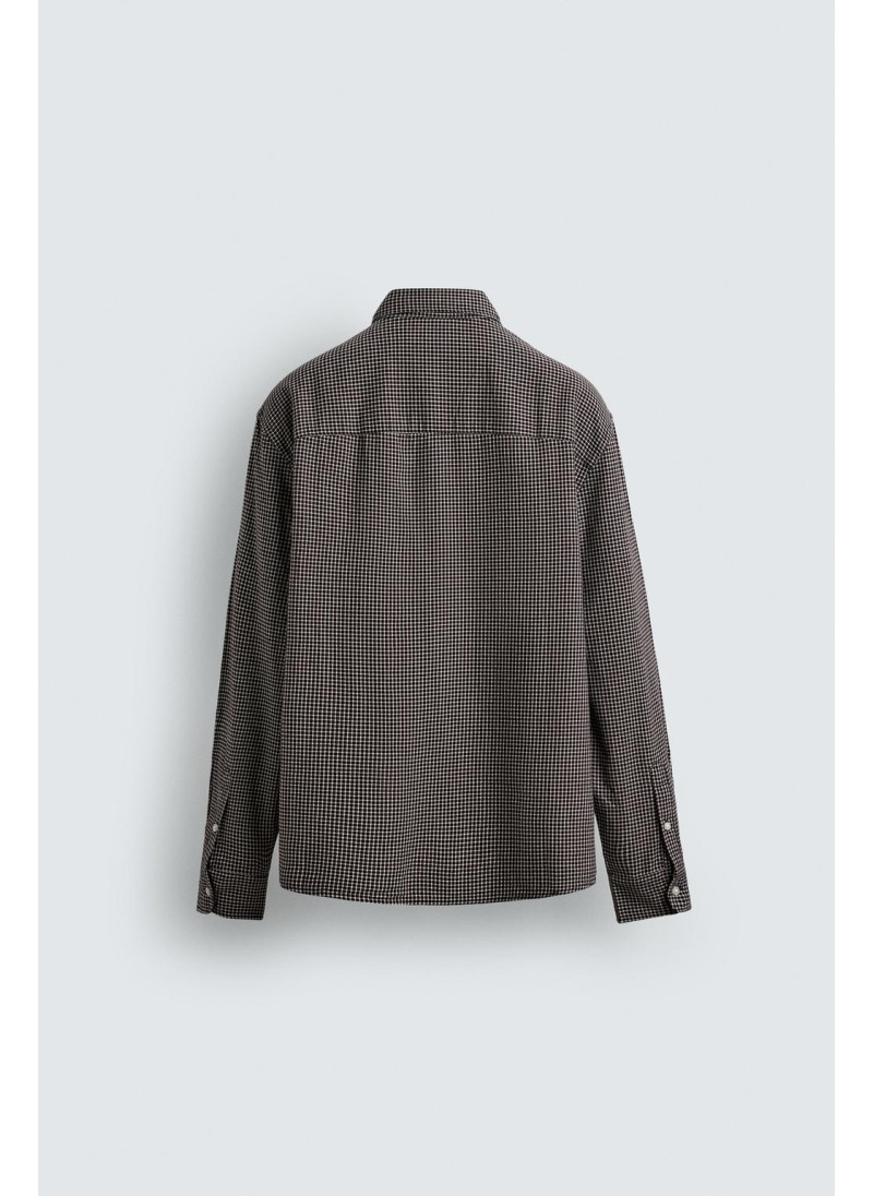 Рубашка свободного кроя из хлопковой ткани с финишной отделкой из фланели. Она имеет воротник, длинные рукава с пуговицами на манжетах, нагрудный карман, и застежку на пуговицы.