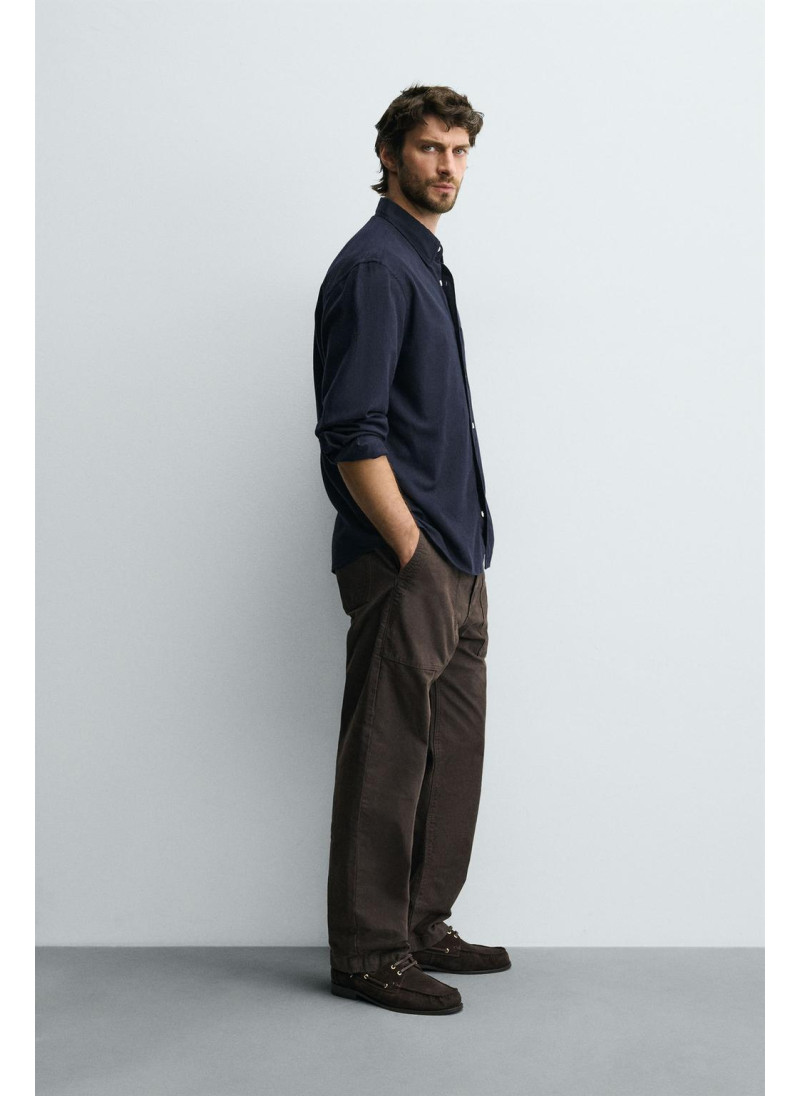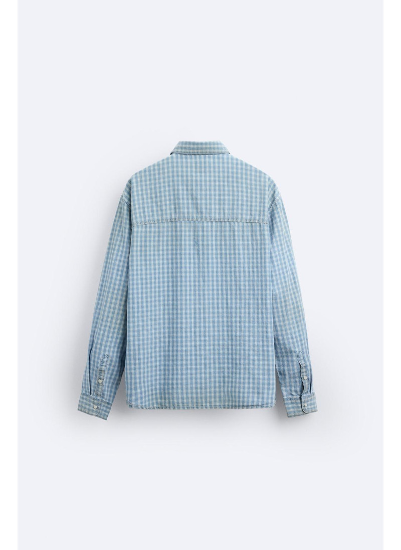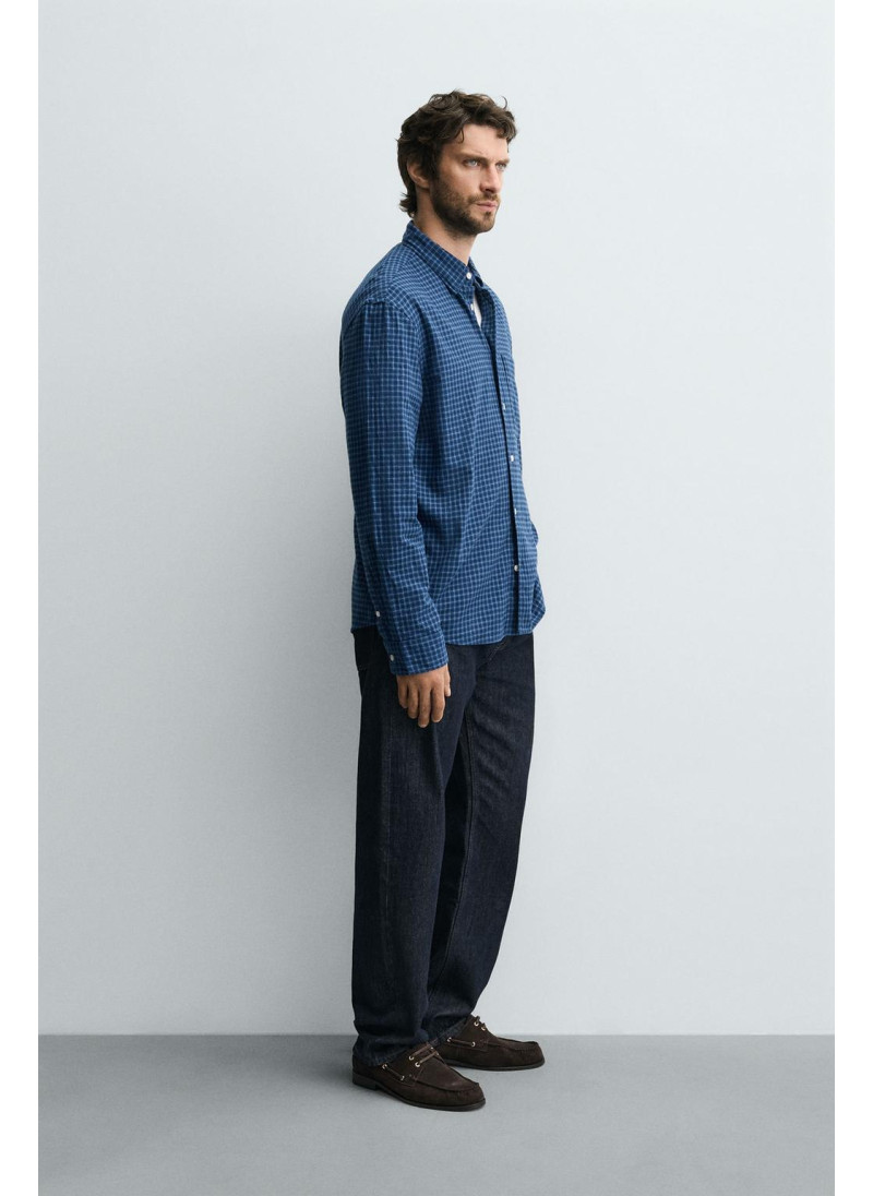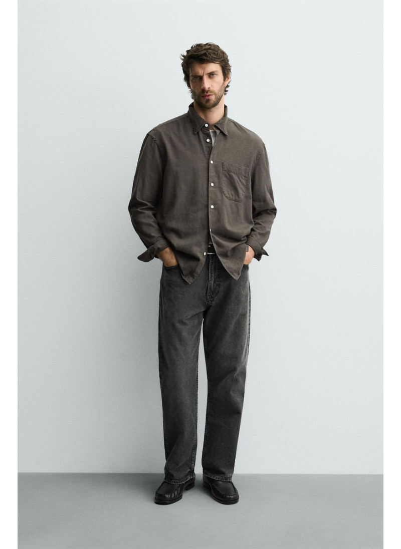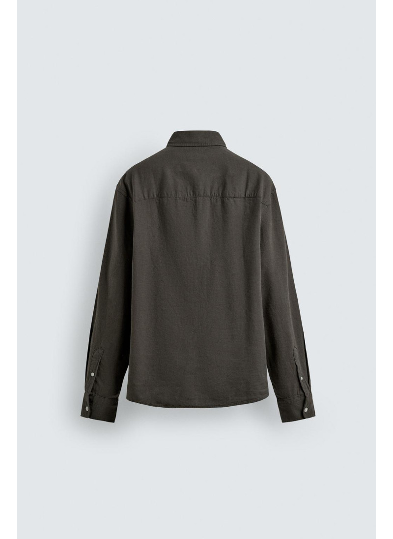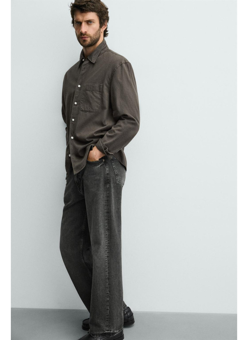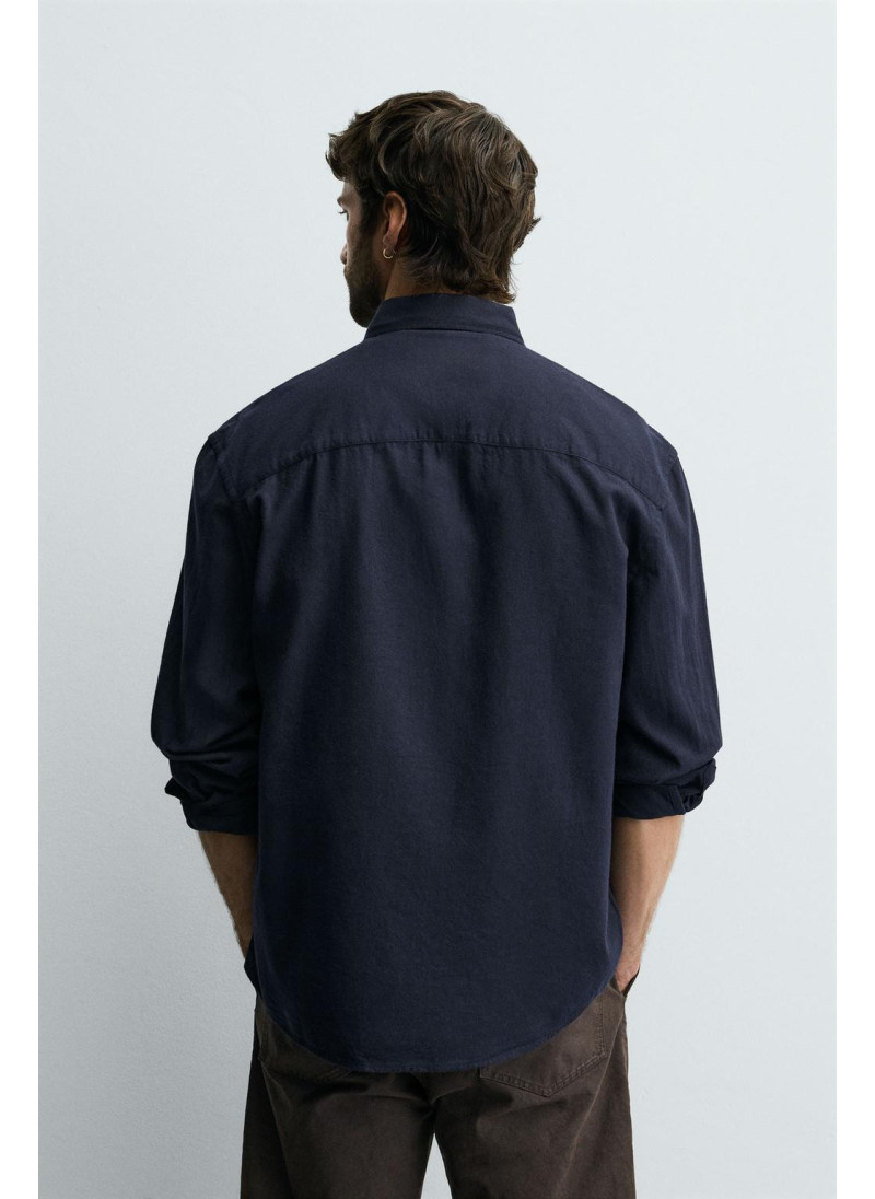Рубашка свободного кроя из хлопковой ткани с финишной отделкой из фланели. Она имеет воротник, длинные рукава с пуговицами на манжетах, нагрудный карман, и застежку на пуговицы.