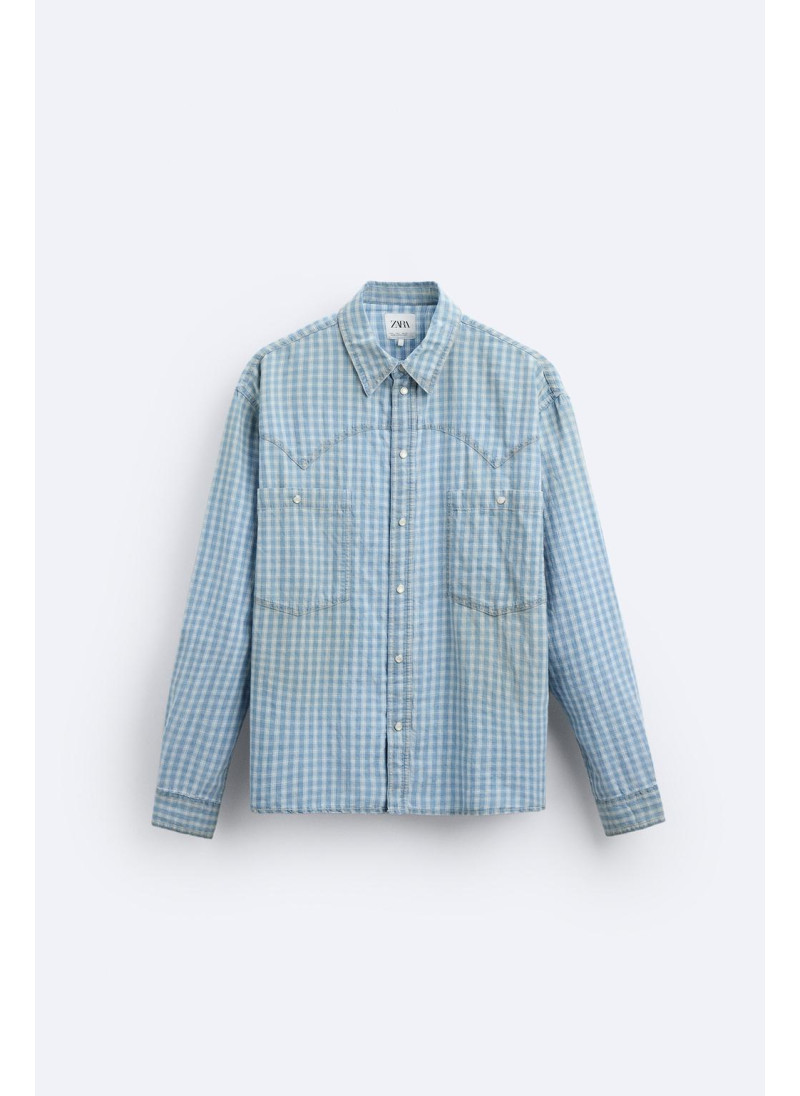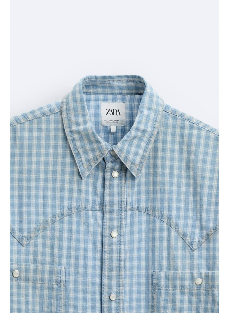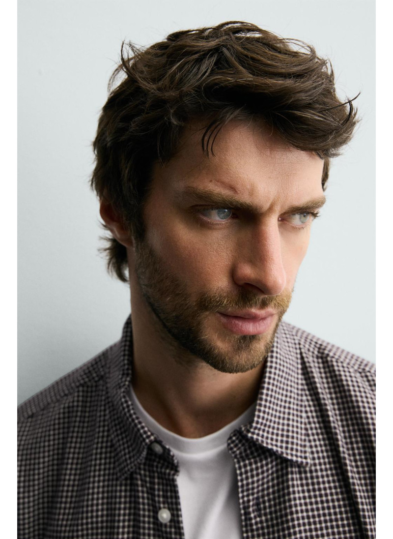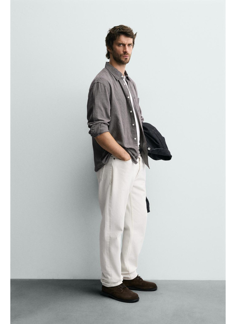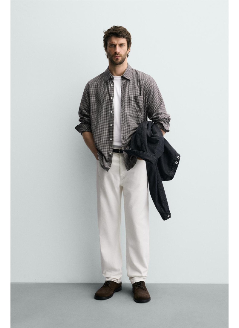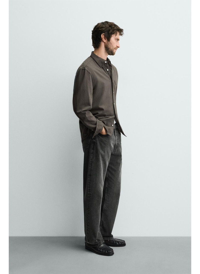 Рубашка свободного кроя из хлопковой ткани с финишной отделкой из фланели. Она имеет воротник, длинные рукава с пуговицами на манжетах, нагрудный карман, и застежку на пуговицы.