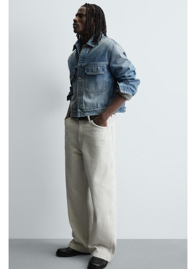 Джинсы свободного кроя, расширяющегося по всей длине ноги. Средняя посадка. Плотная ткань. Пять карманов. Прорезной карман на штанине. Эффект потертости. Застежка-молния и пуговица.