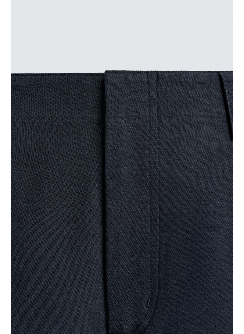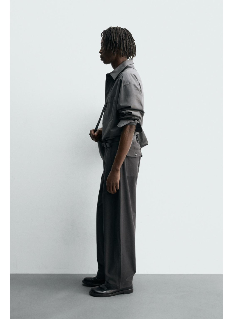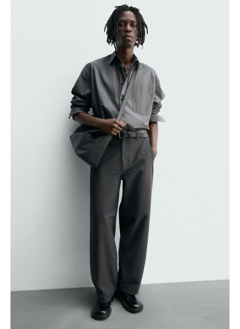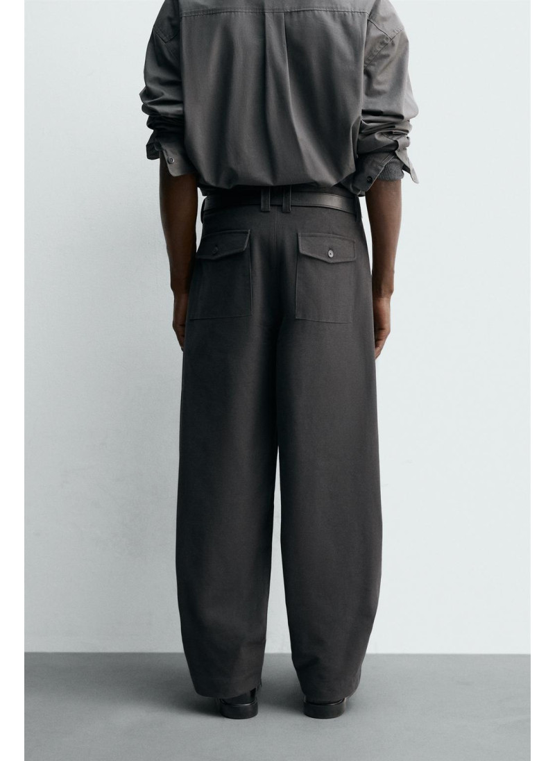 Брюки свободного кроя. Имеют передние накладные карманы и задние клапанные карманы. Застежка на молнию и пуговицу.