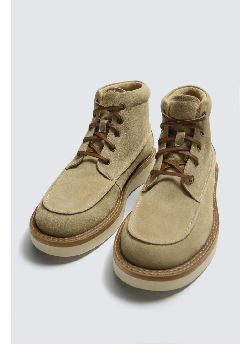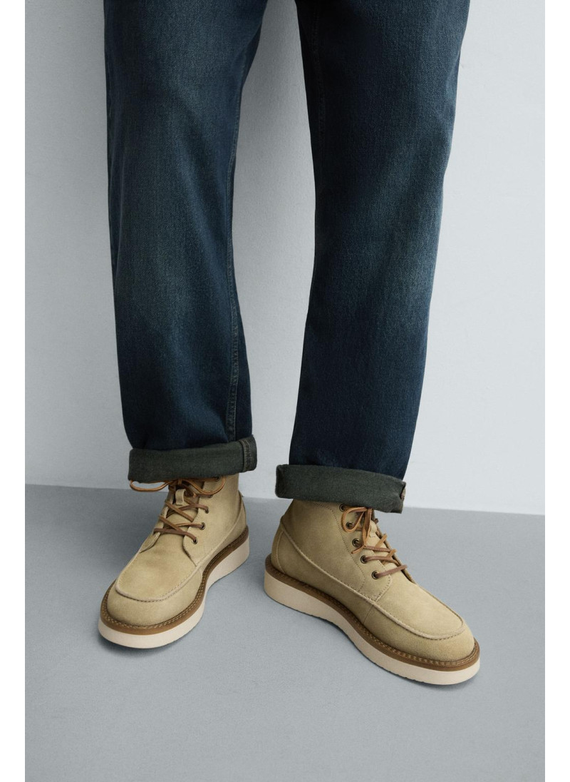 Ботинки со шнуровкой. Гладкий верх из кожи с замшевой отделкой. Декоративная строчка на подъеме. Круглый нос. Контрастная объемная подошва.