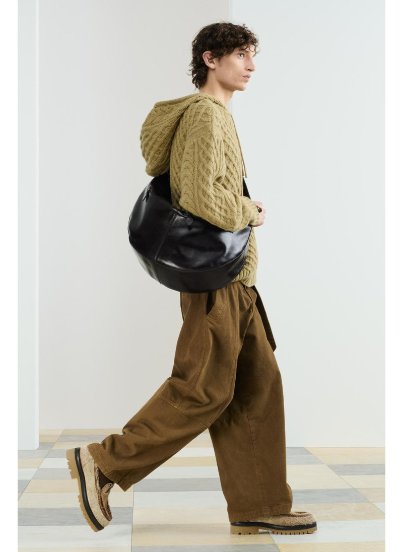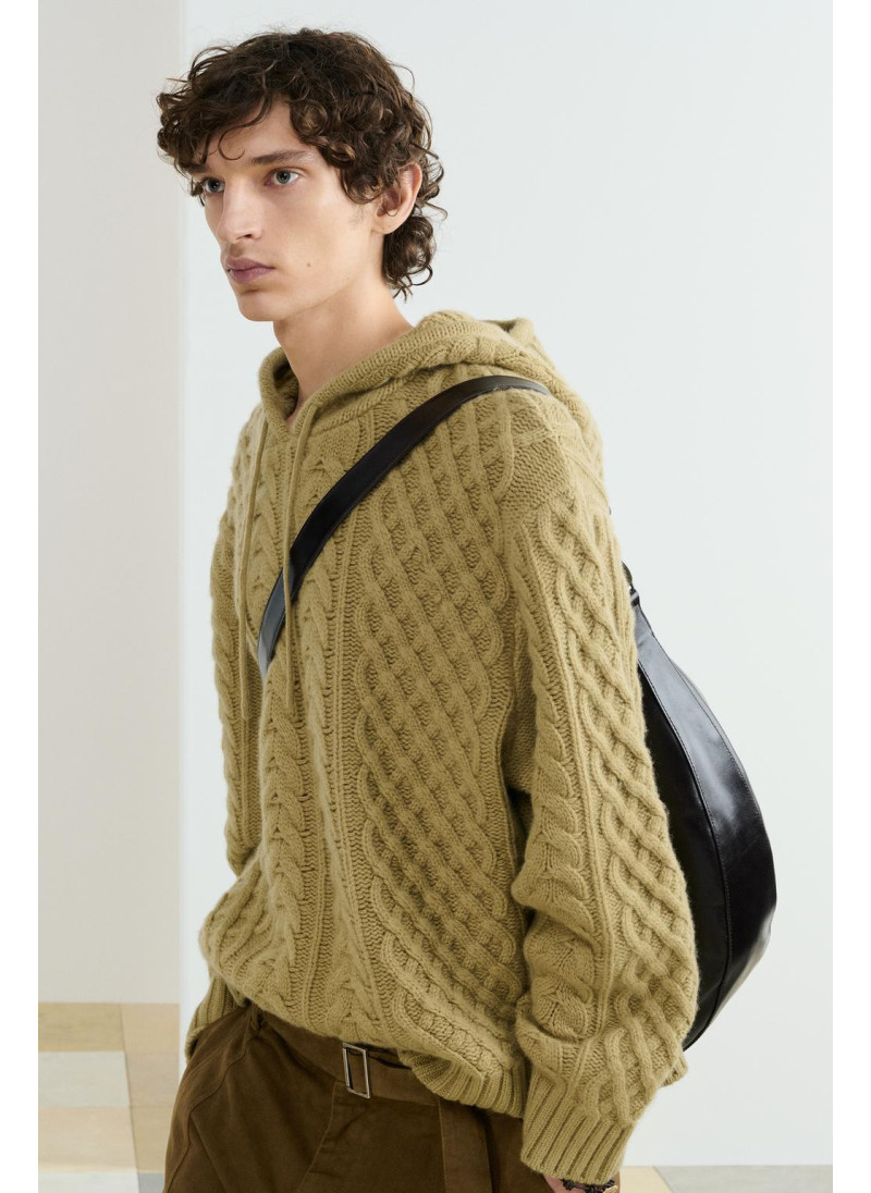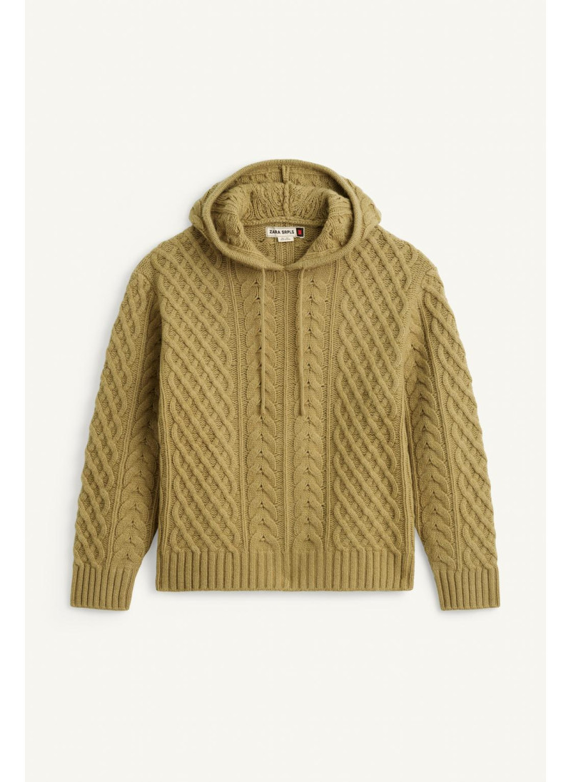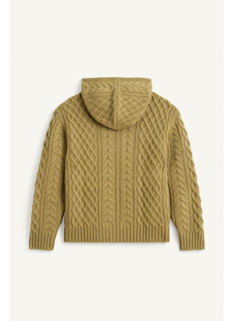 Трикотажная толстовка свободного кроя из шерстяной пряжи. Имеет регулируемый капюшон и длинные рукава. Обработана ребристыми манжетами.