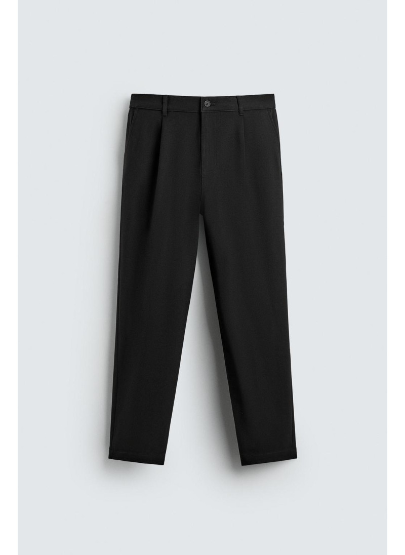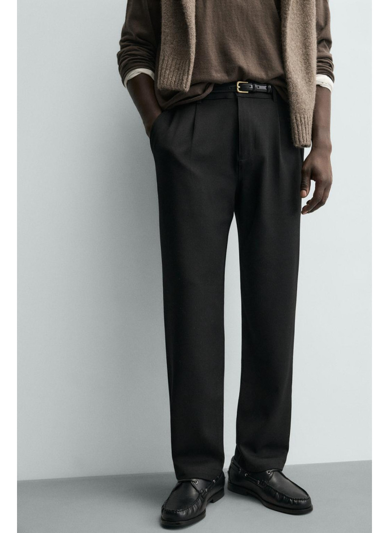 Прямые брюки из эластичной ткани. Имеют эластичный пояс с защипами спереди, карманы спереди, задние карманы с пуговицами и застежку на молнию и пуговицу сверху.