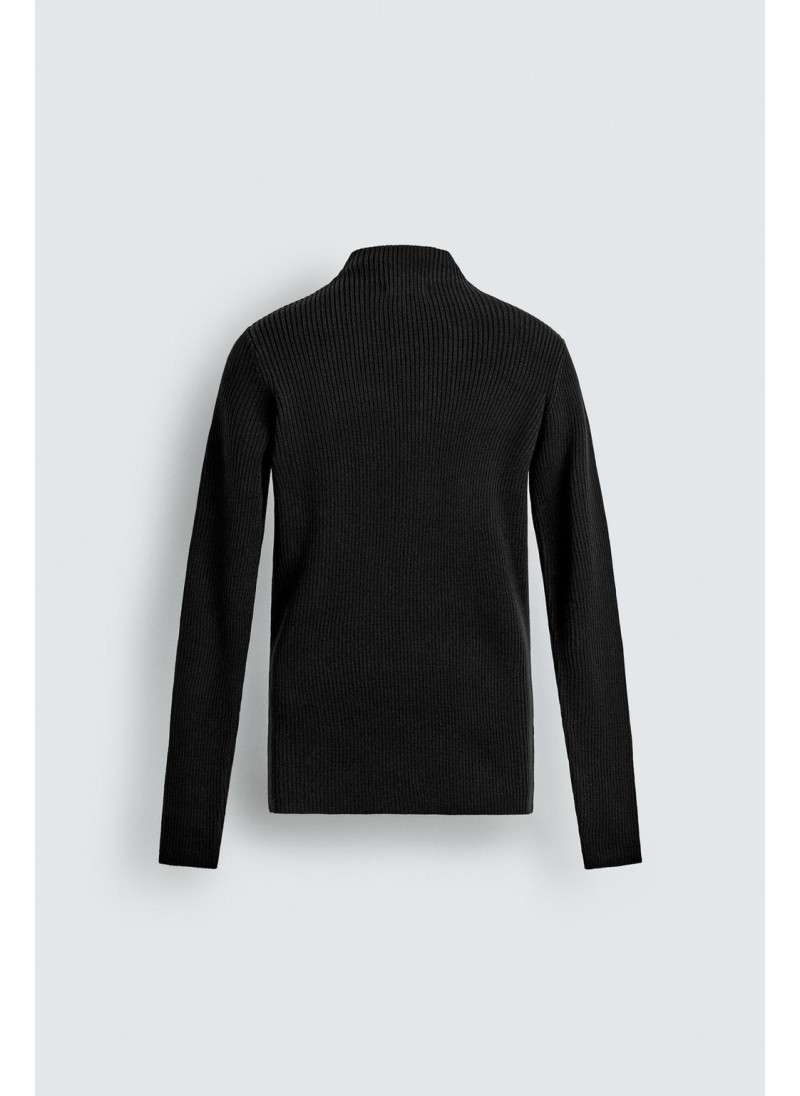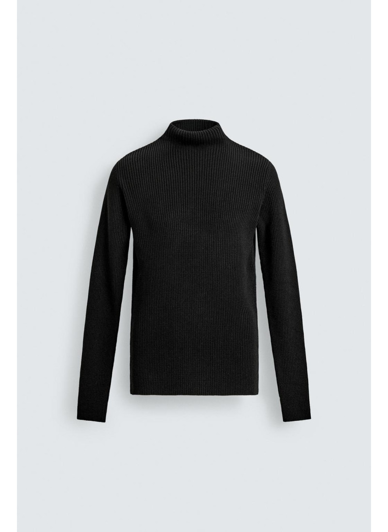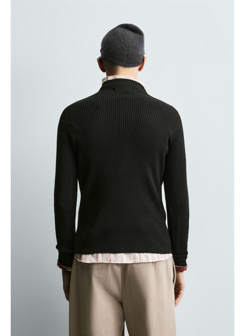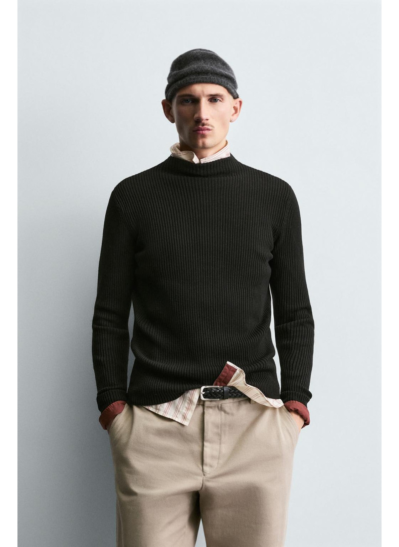 Приталенный свитер в рубчик. Воротник-стойка и длинные рукава.