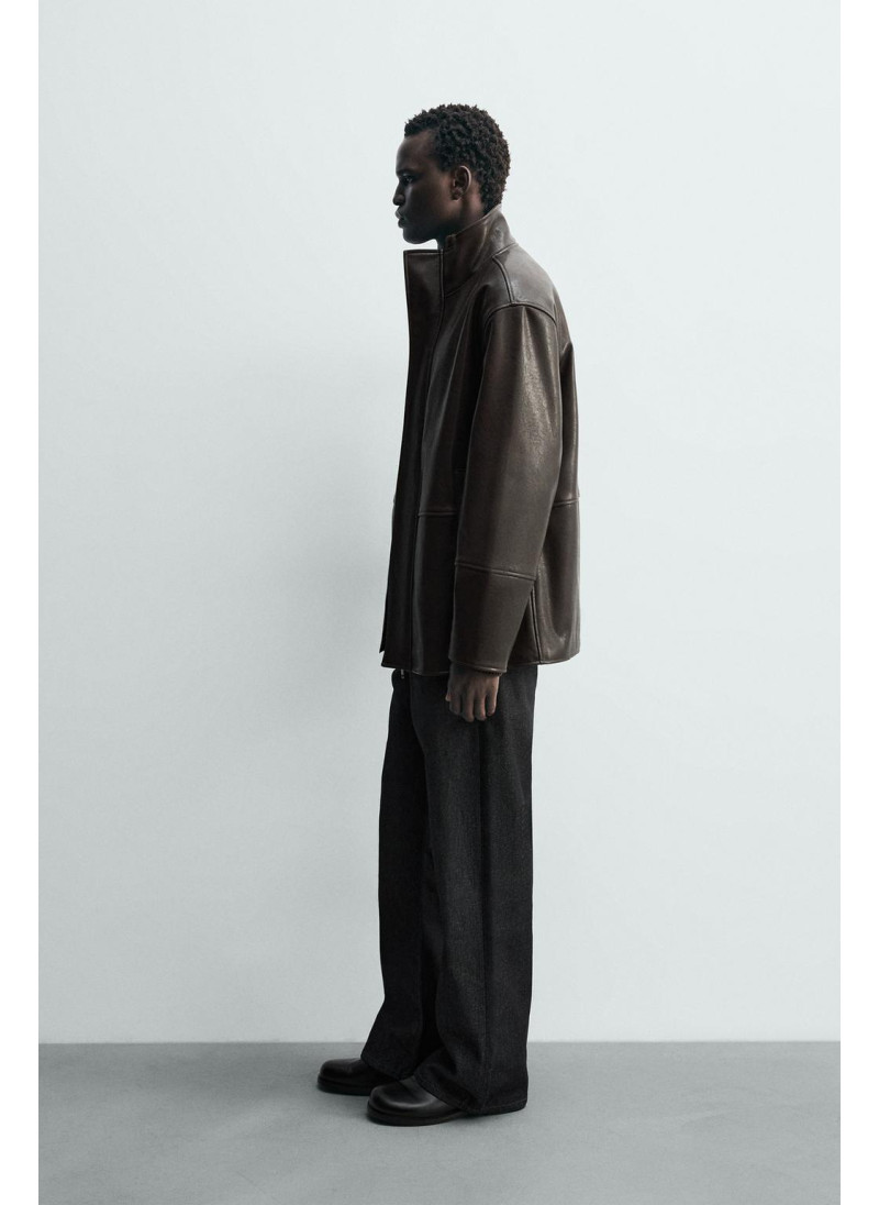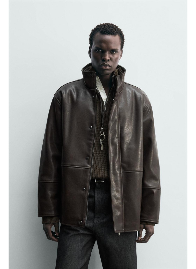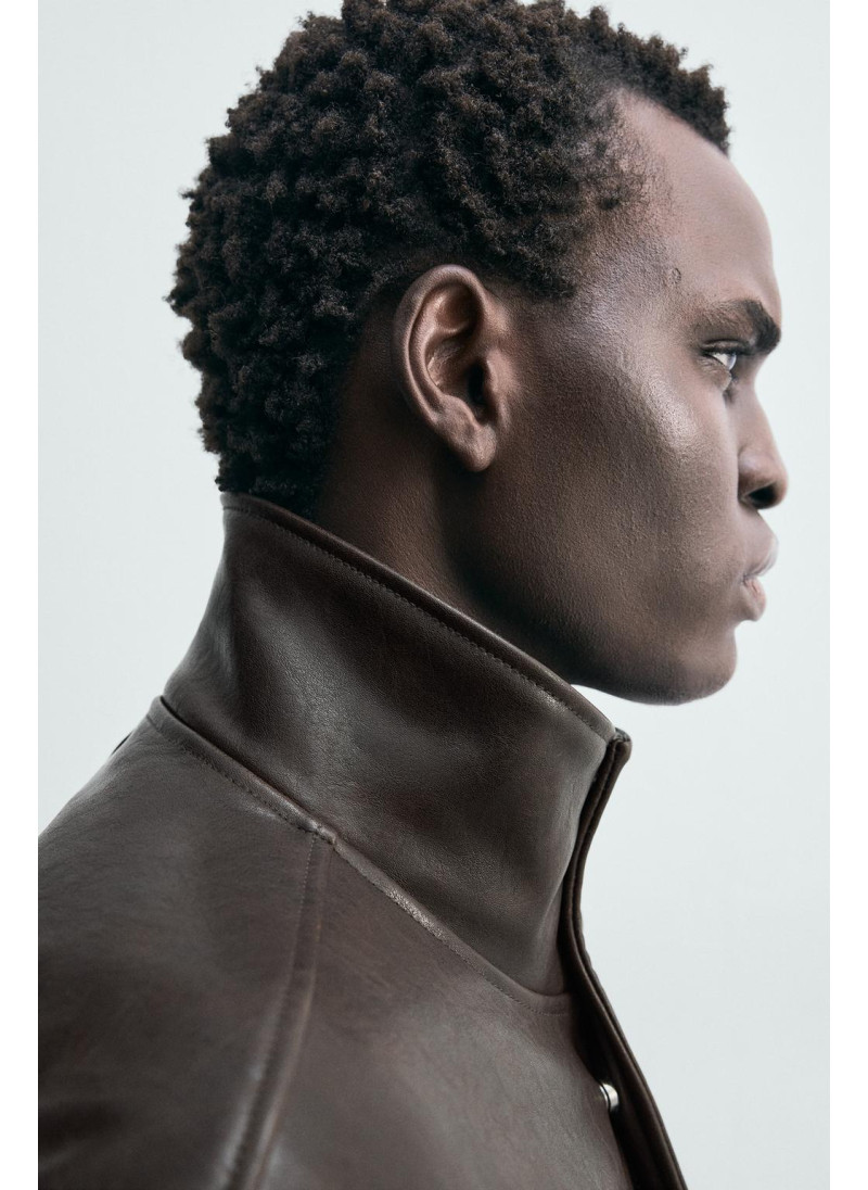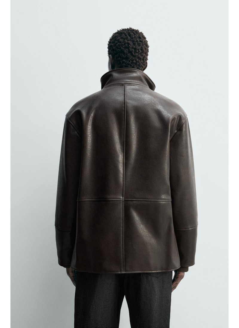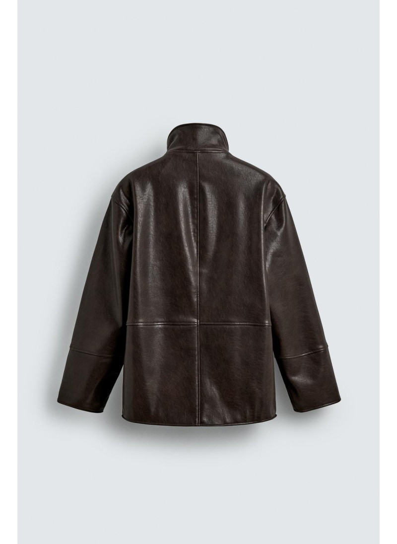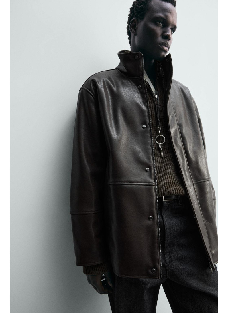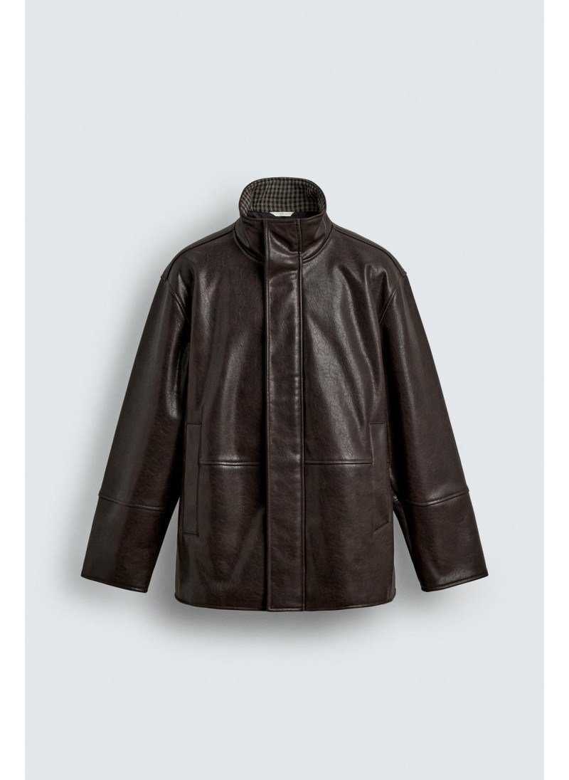 Куртка свободного кроя из ткани под кожу. Высокий воротник с подкладкой в клетку. Длинные рукава. Карманы в районе бедер и детали внутреннего кармана. Застежка на молнию спереди, скрытая планкой с кнопками-клапанами.