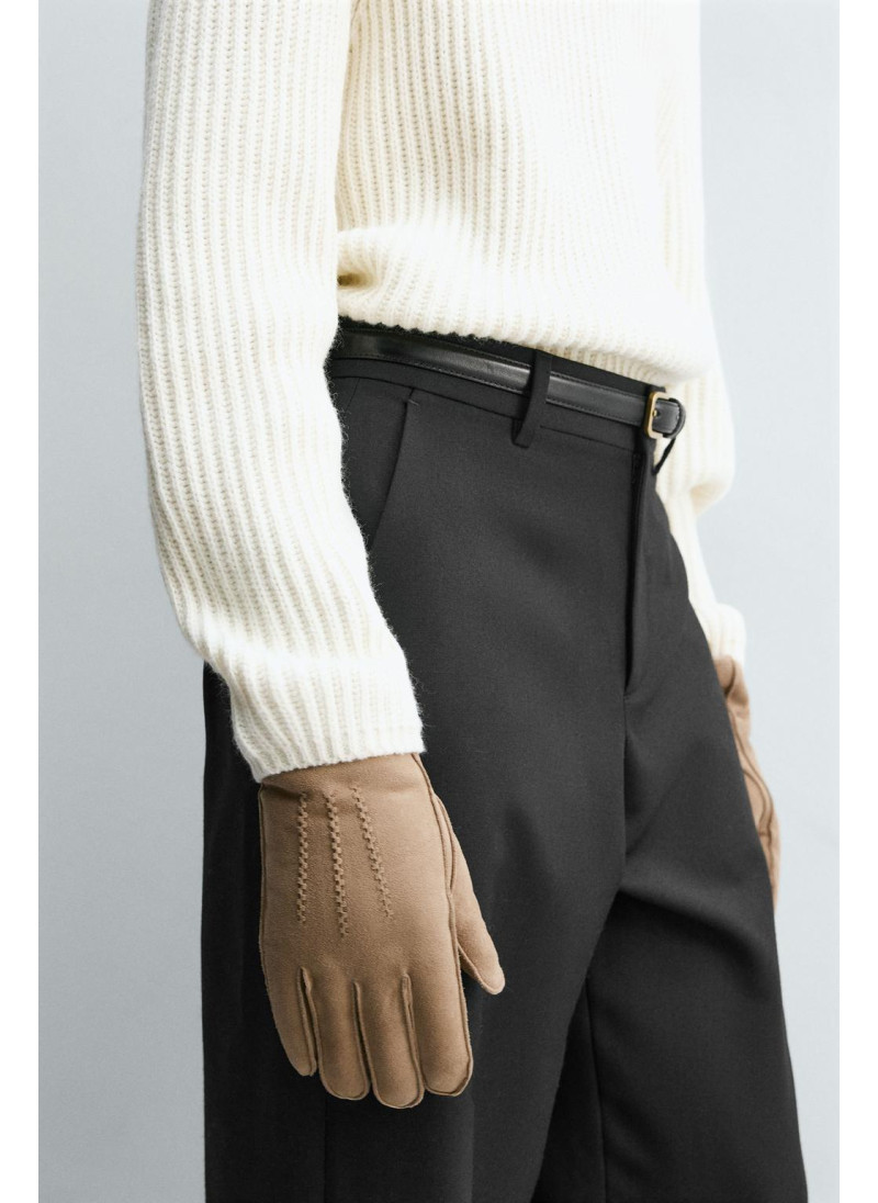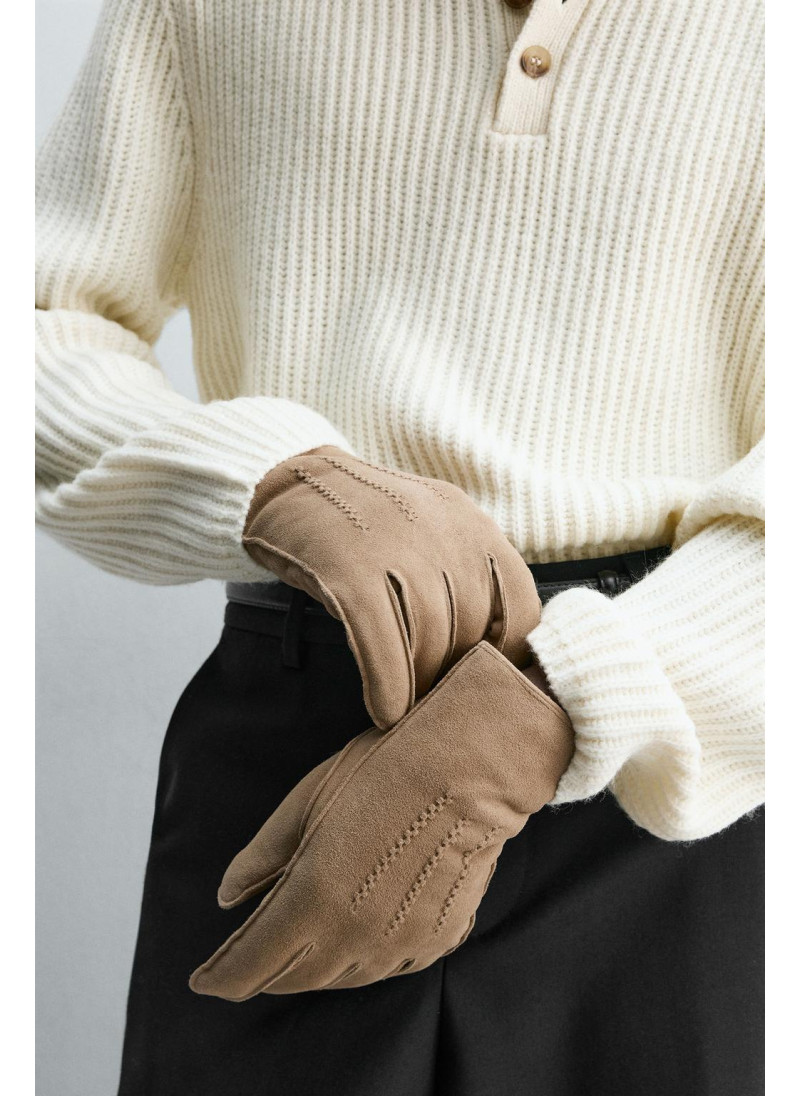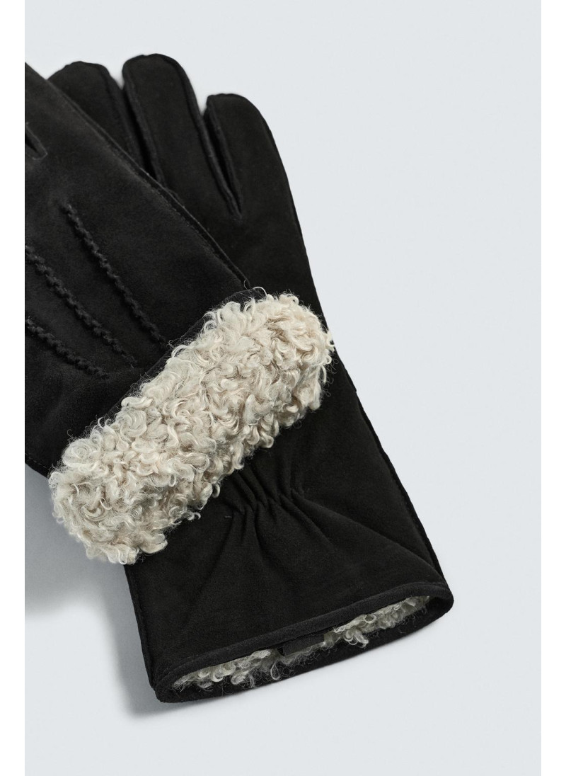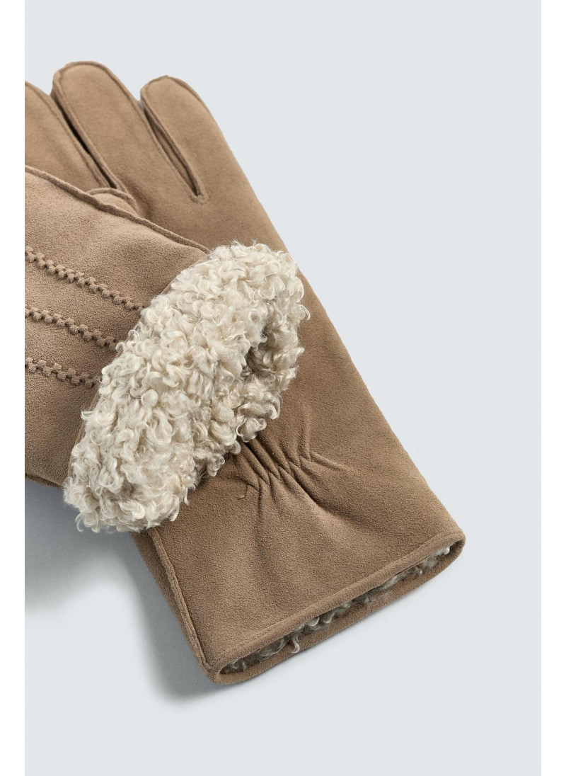Кожаные перчатки с замшевой отделкой. Детали стежки на спинке. Внутренняя часть подкладки выполнена из контрастной искусственной овчины. Эластичные манжеты.