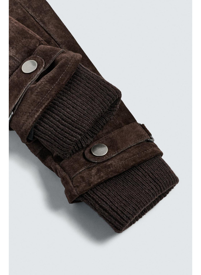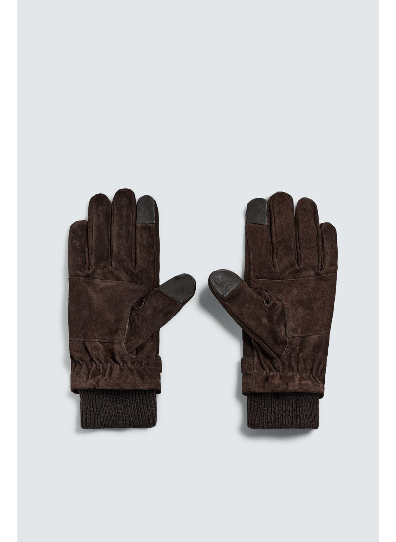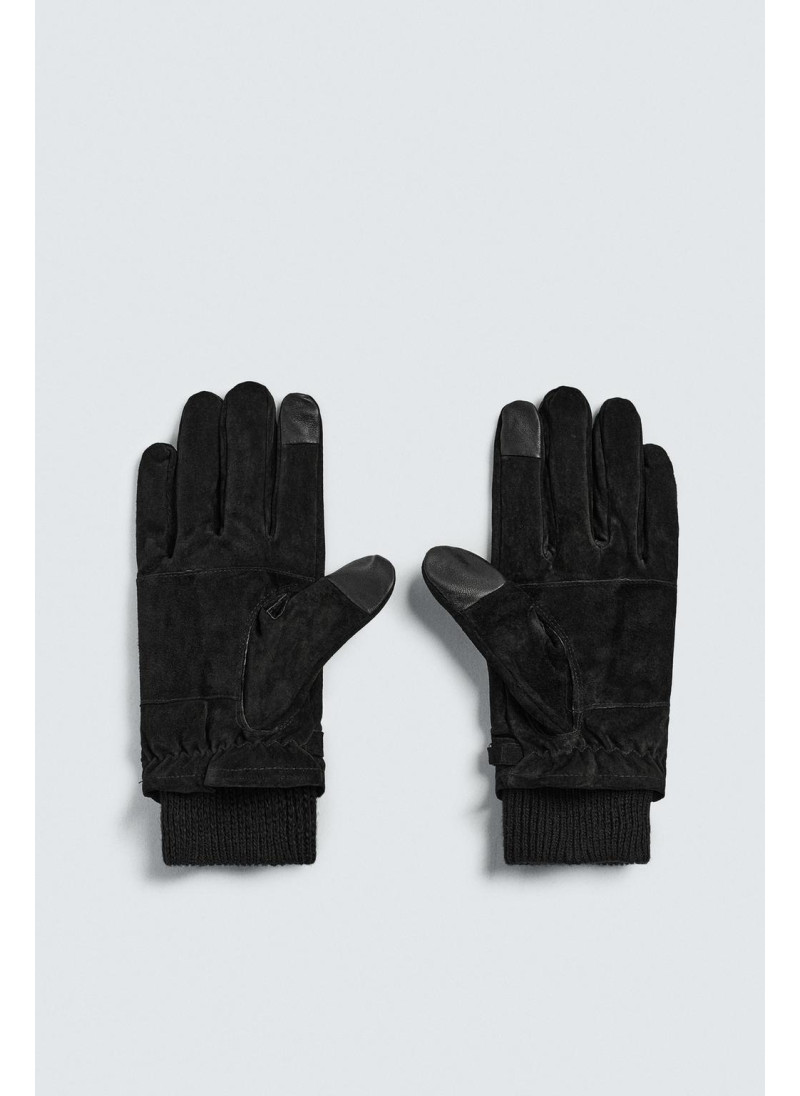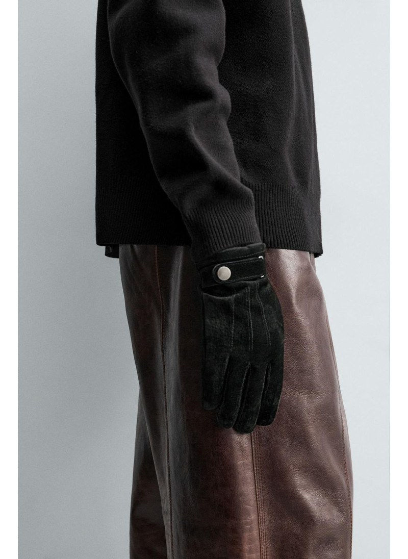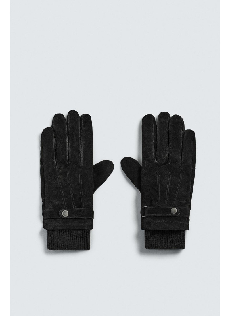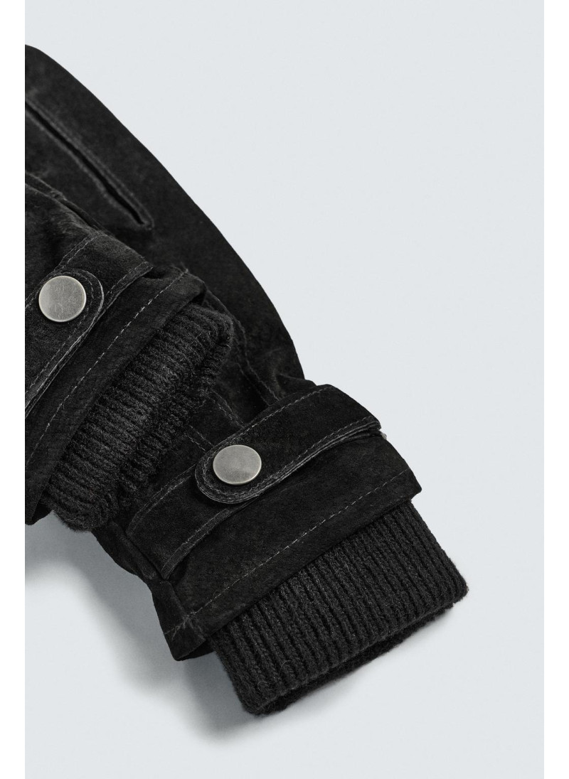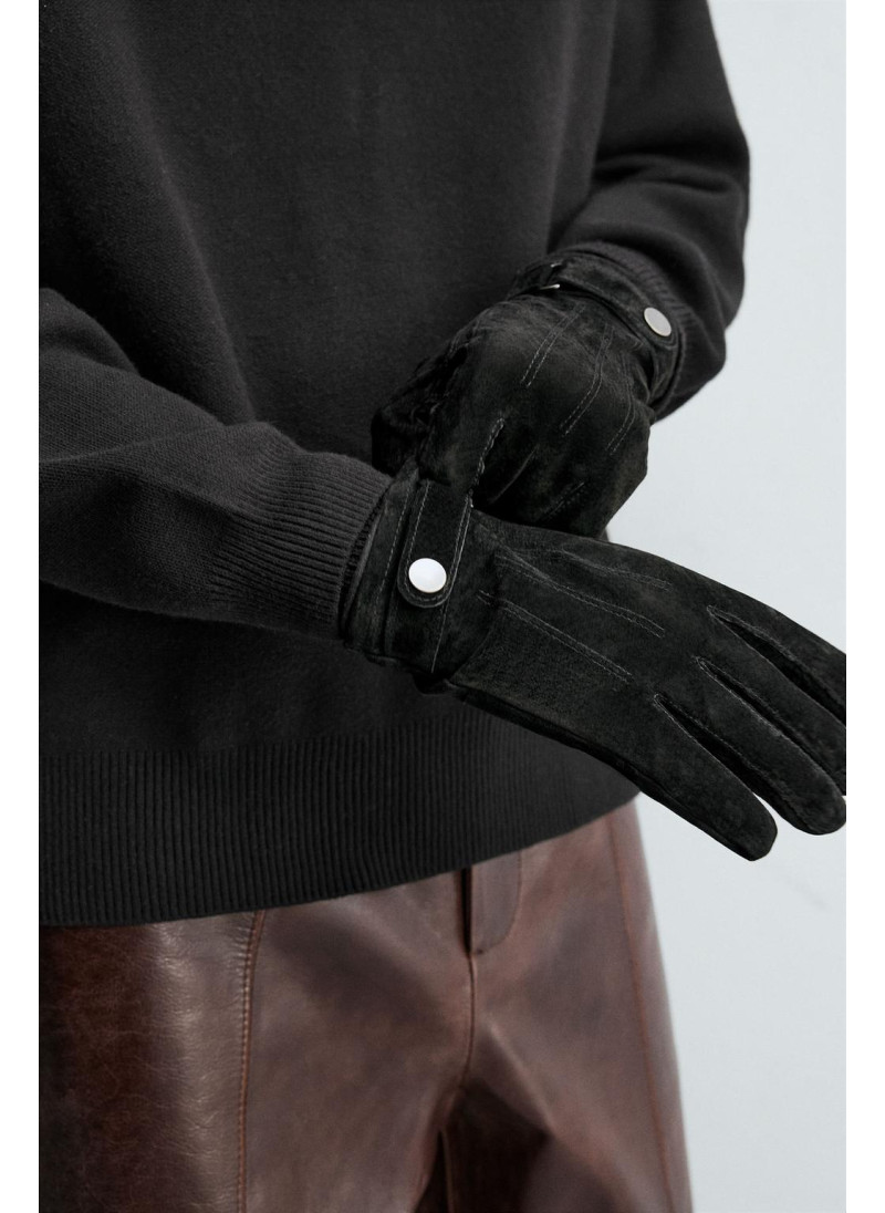 Кожаные перчатки. Подкладка из вязаного материала. Декоративные строчки на спинке. Вязаная вставка на указательном пальце и большом пальце для удобства использования сенсорных устройств. Регулируются с помощью эластичного манжета и кнопки.