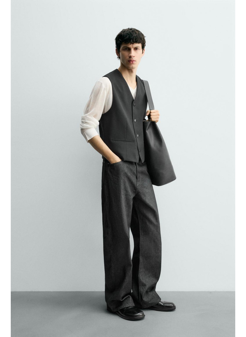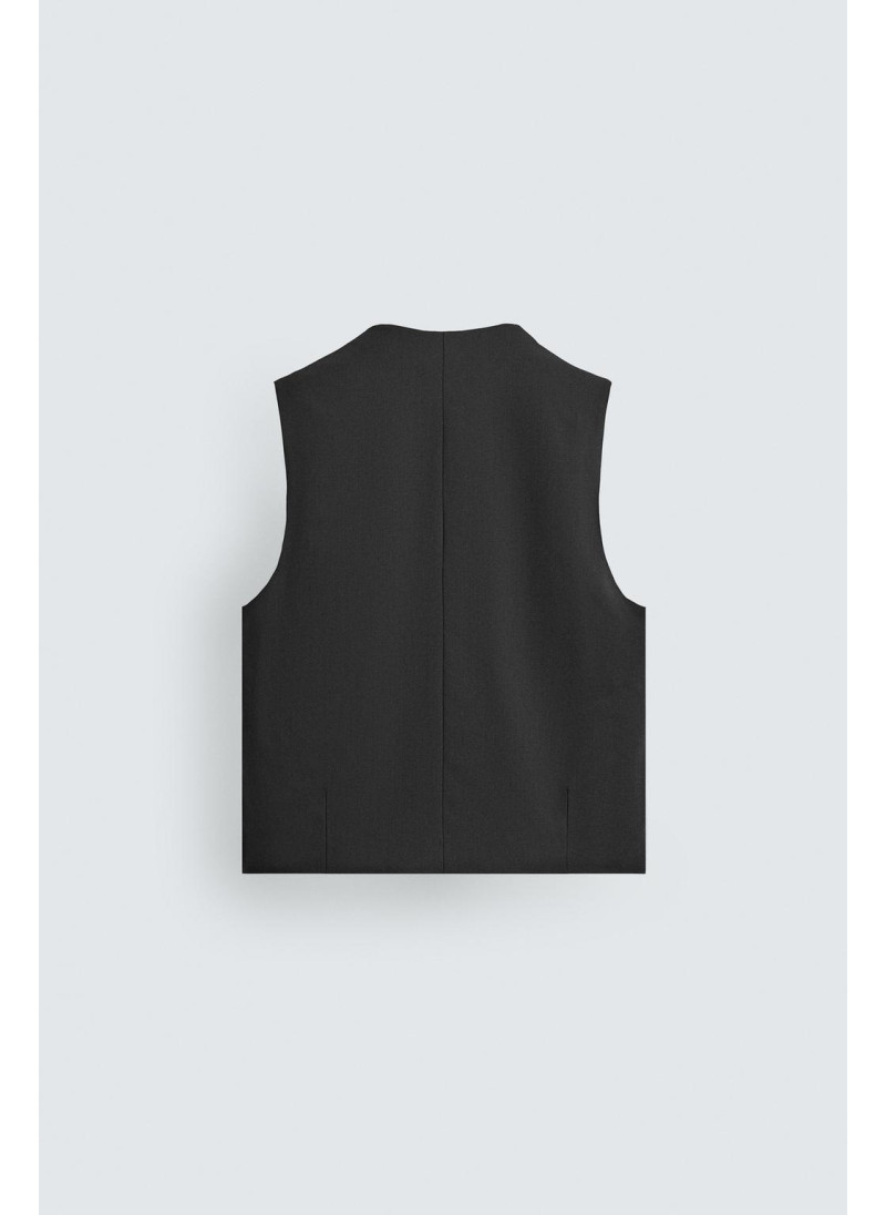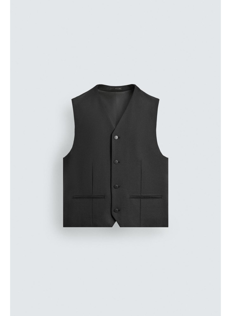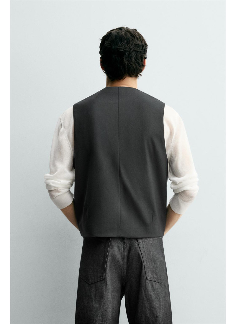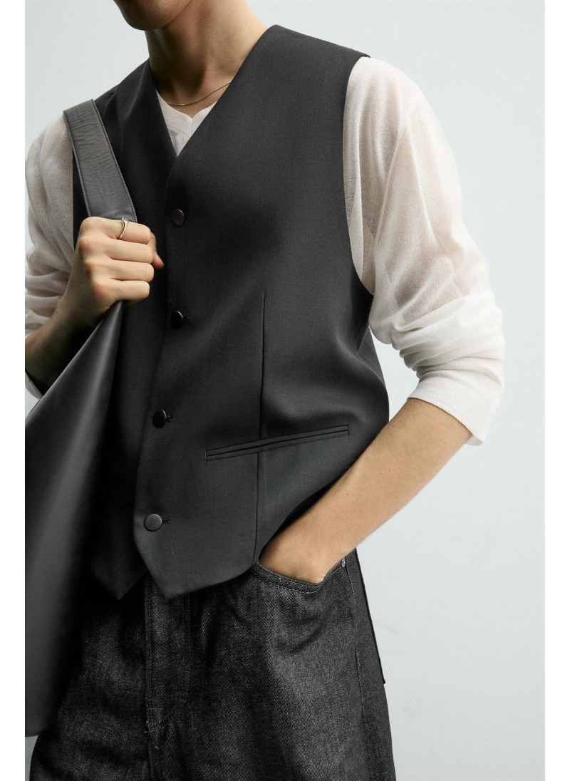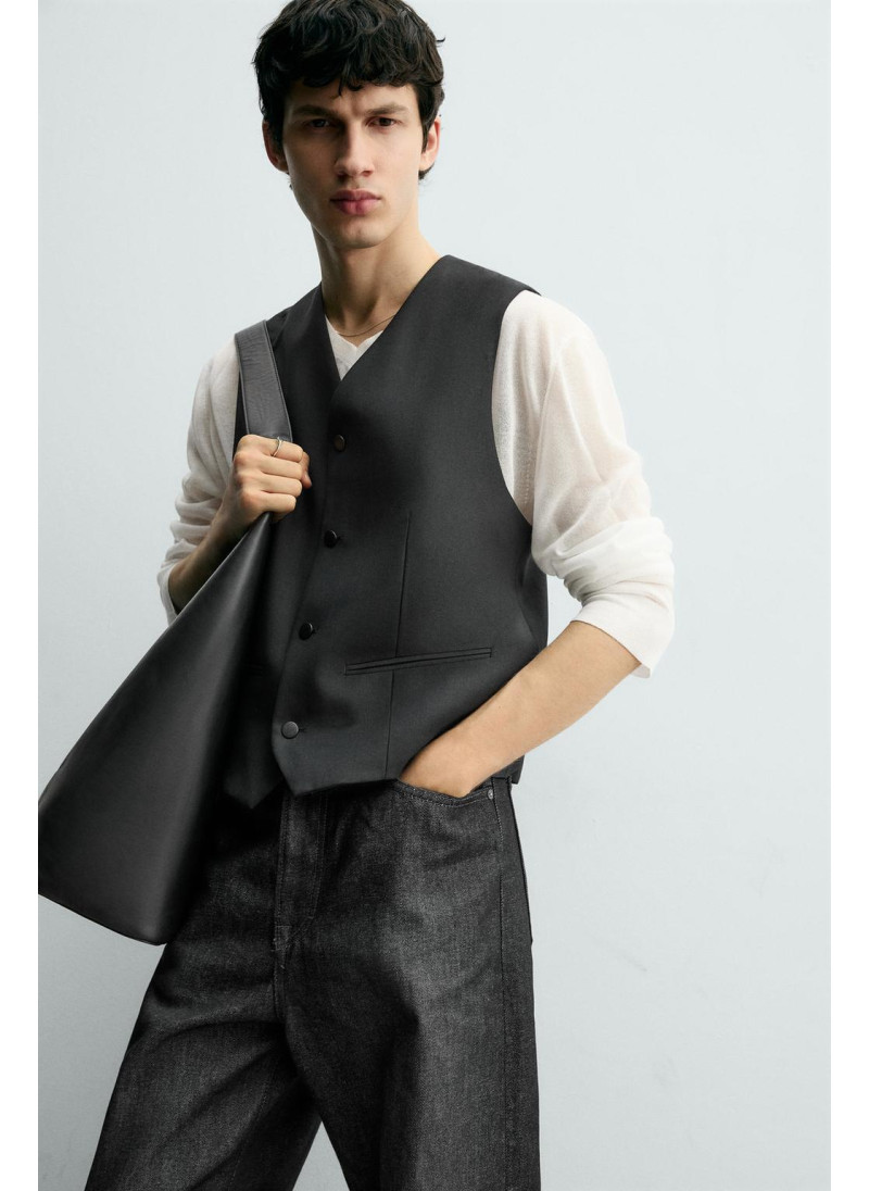 Жилет с регулярной посадкой из смесовой шерстяной ткани. Имеет V-образный вырез, проймы и два накладных кармана. Застегивается спереди на пуговицы.