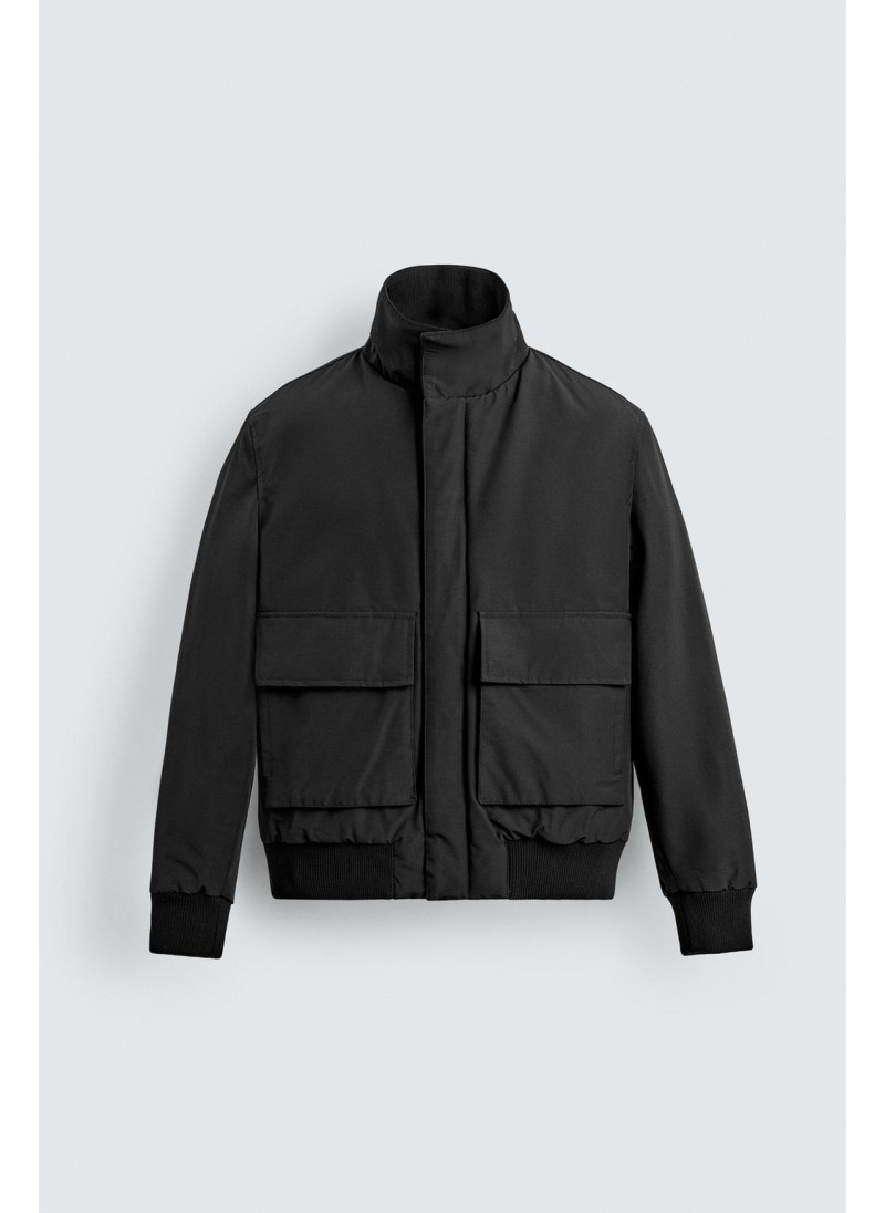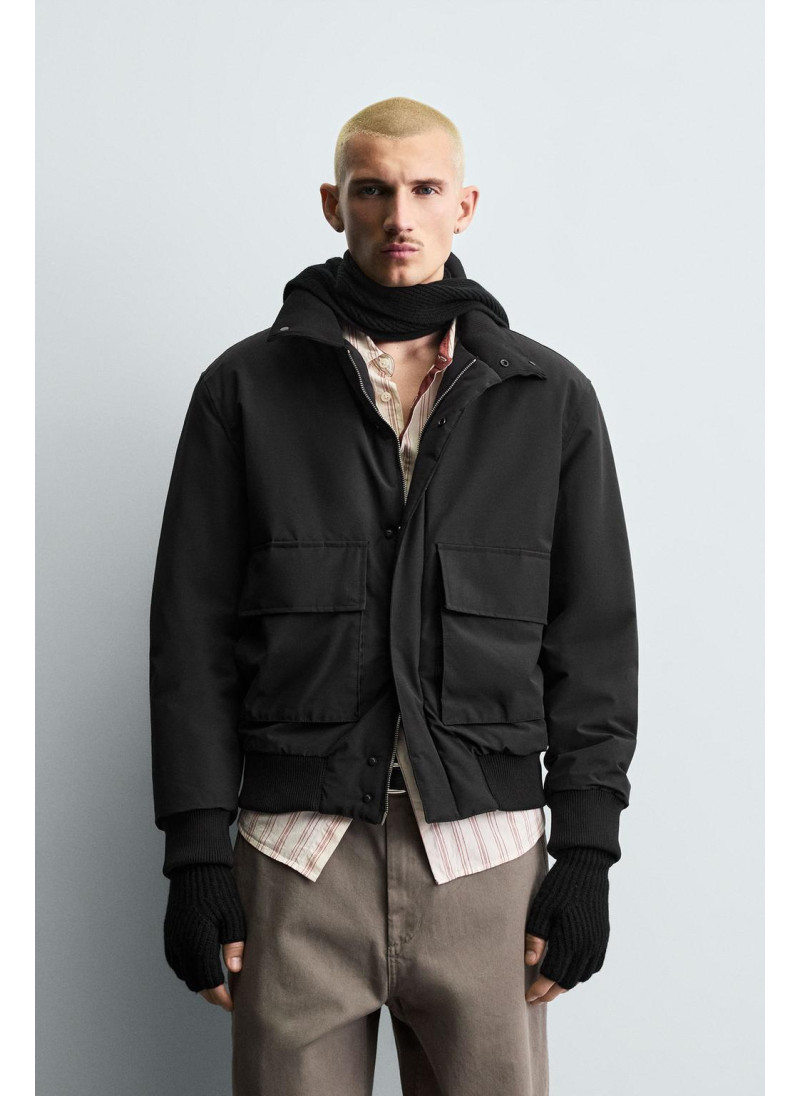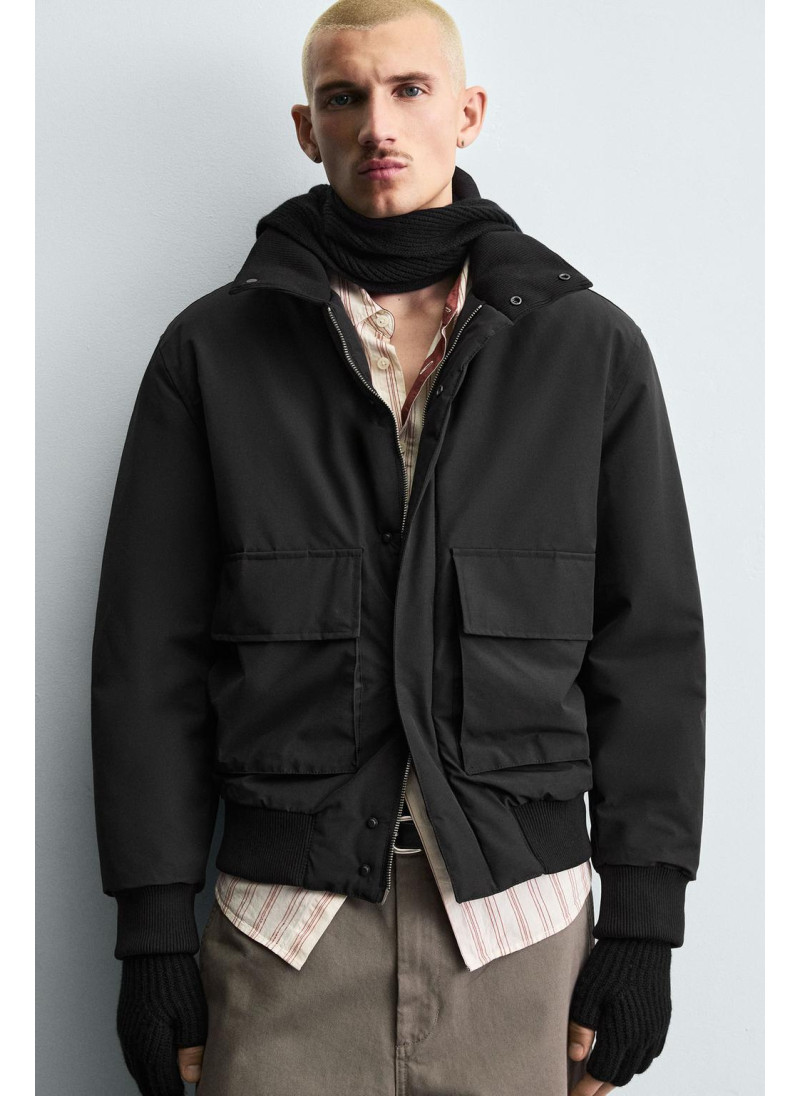 Пуховик с облегающим кроем из технической ткани с утеплителем. Высокий воротник и длинные рукава. Накладные карманы с клапанами на бедрах. Детали внутри кармана. Ребристые манжеты. Застежка на молнии спереди, скрытая планкой. - Техническая водоотталкивающая ткань. Материал помогает оставаться сухим при кратковременном воздействии легкого дождя. - Ветрозащитный: обеспечивает хорошую защиту от про..