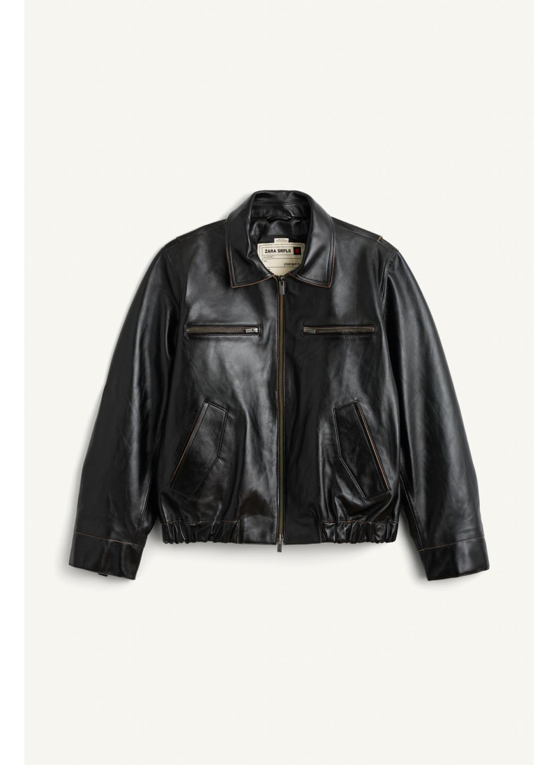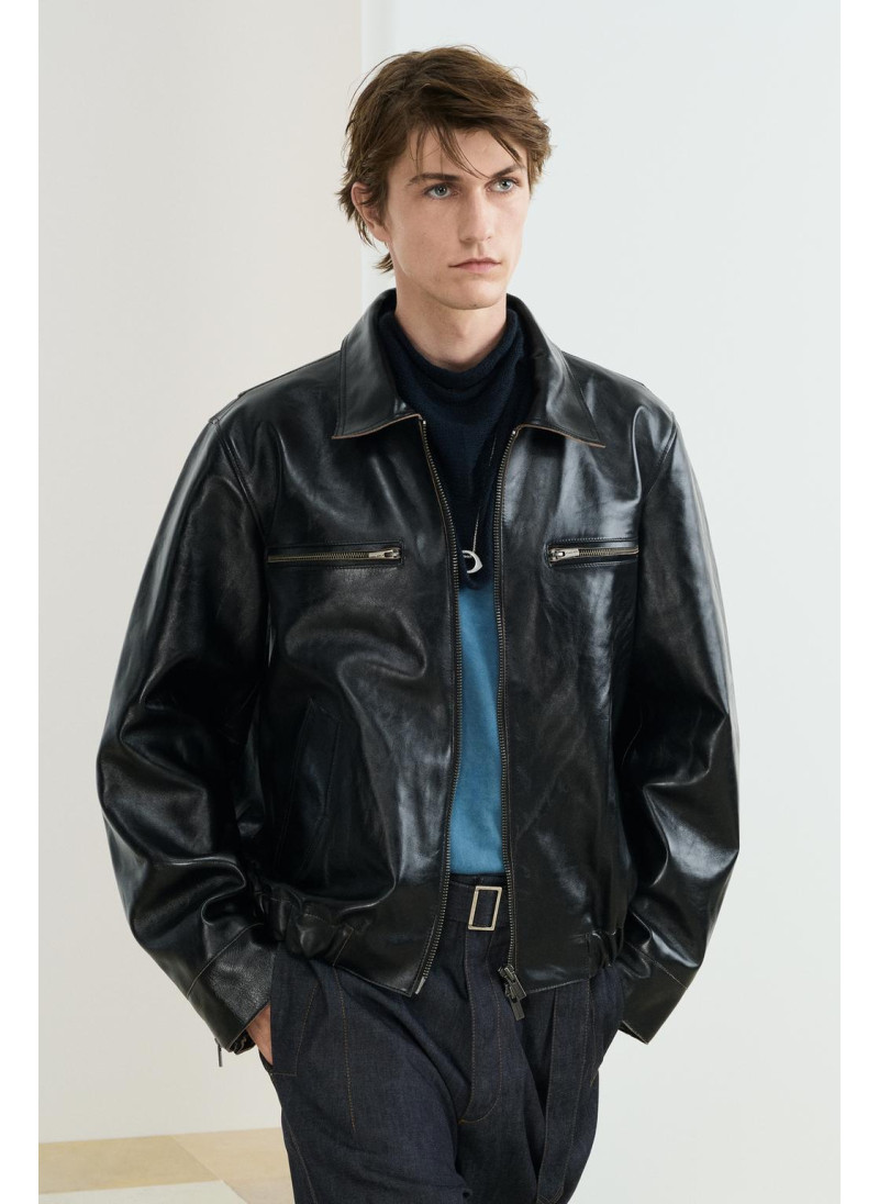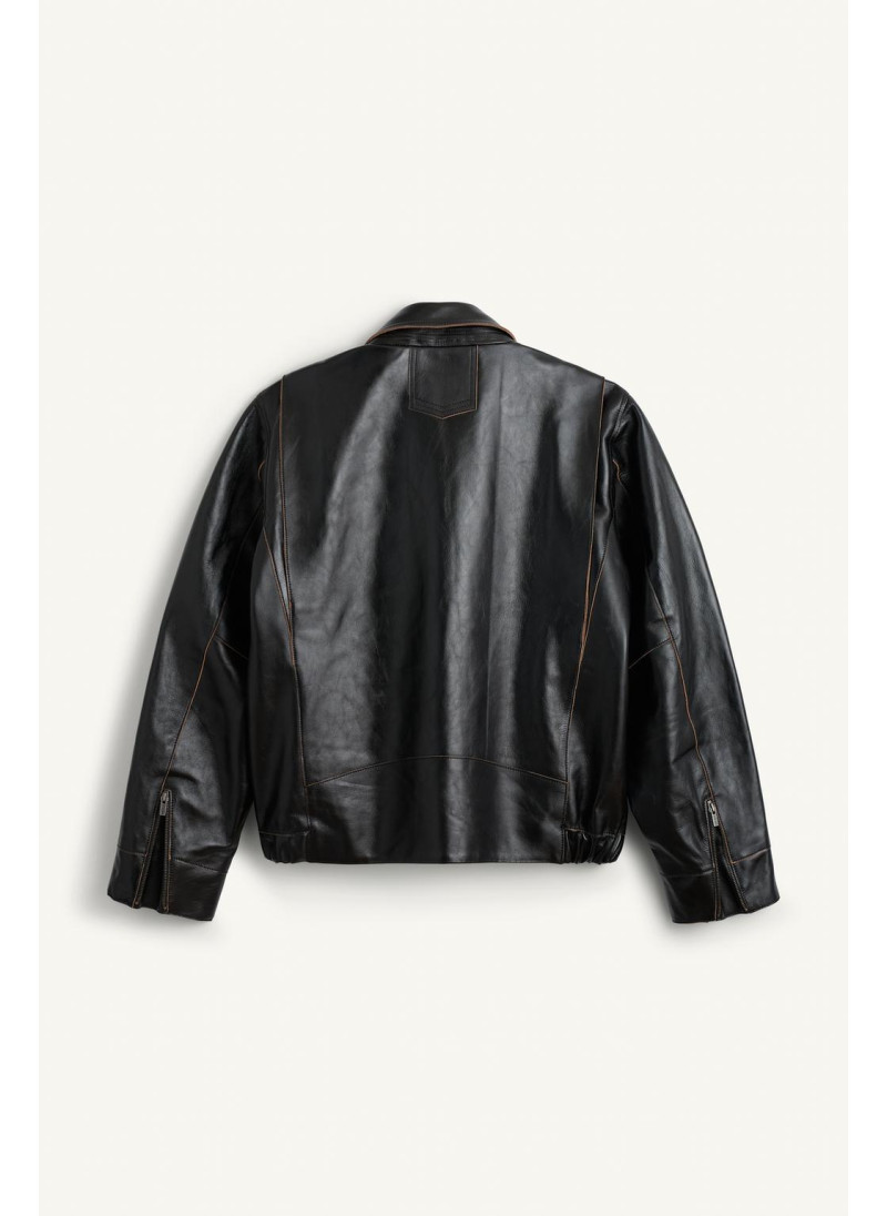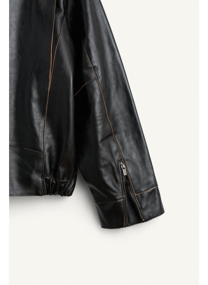 Удобная кожаная куртка с глянцевым покрытием. Имеет воротник английского типа и длинные рукава с регулируемыми молниями на манжетах. Молнии расположены на груди и карманах на бедрах. Сборка на спинке. Нижний край с эластичными вставками спереди. Двусторонняя застежка на молнию спереди...