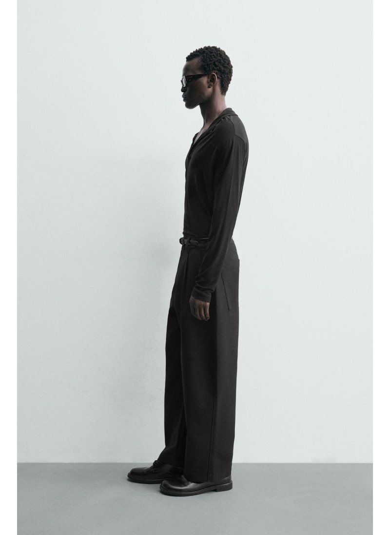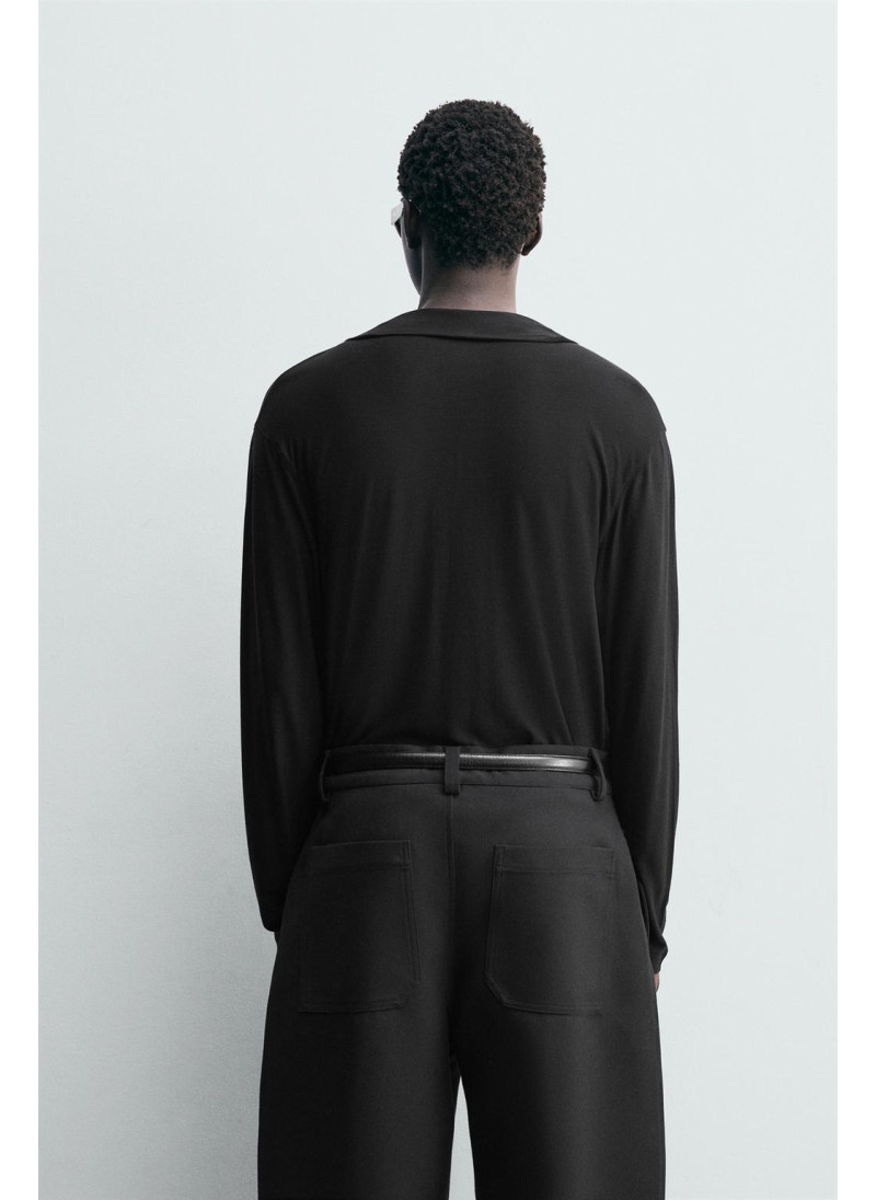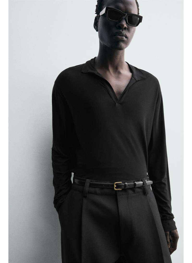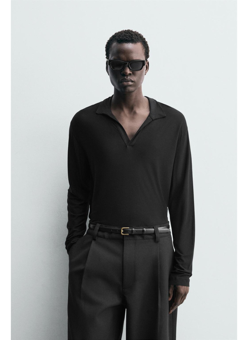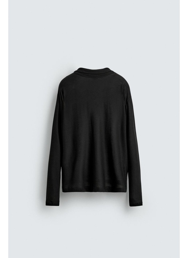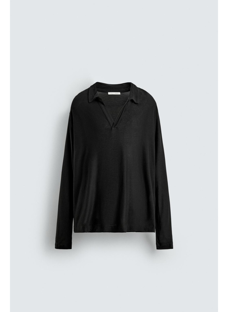 Поло свободного кроя из полупрозрачной ткани из ленселла. Имеет воротник с застежкой спереди. Длинные рукава.